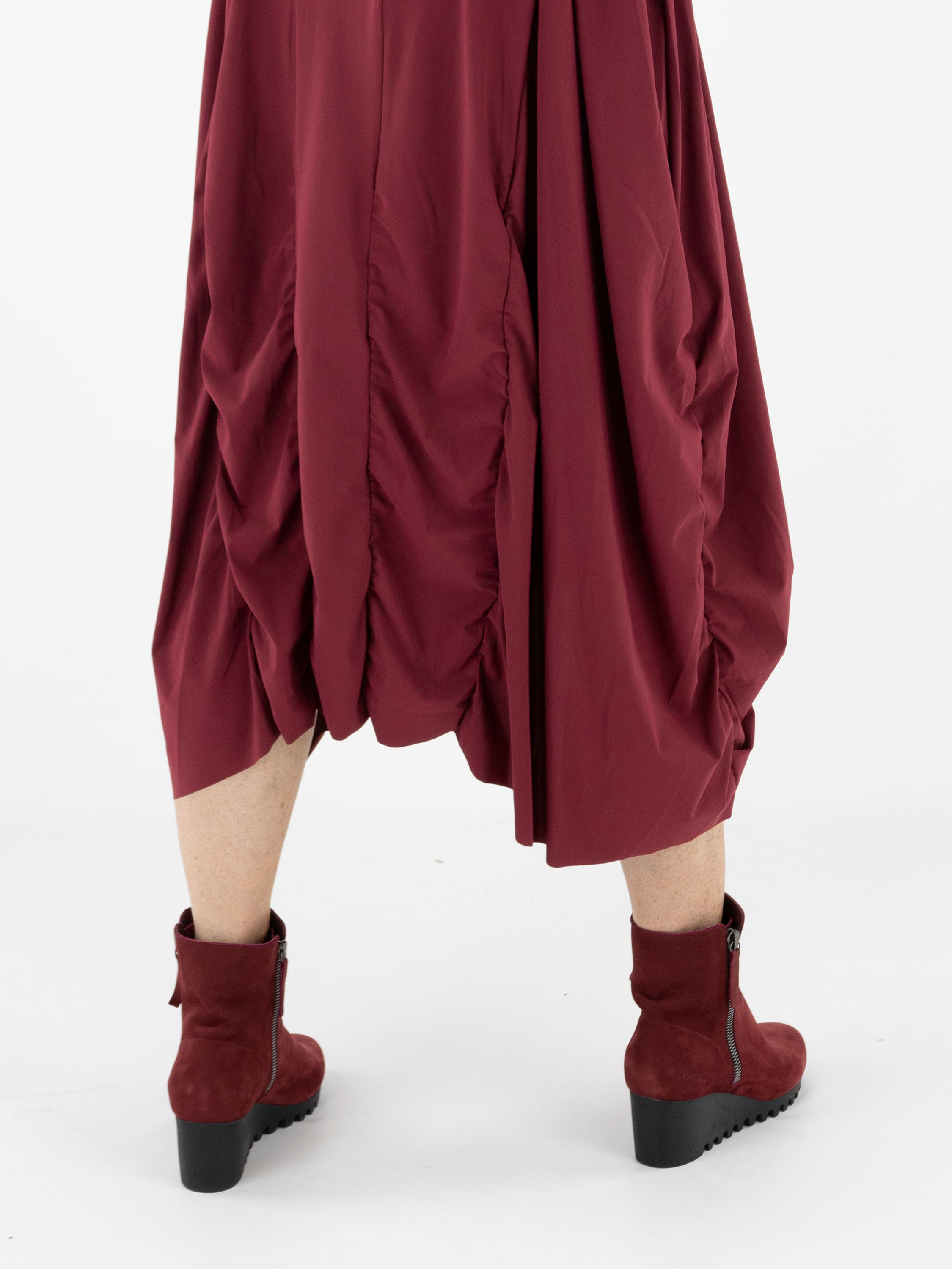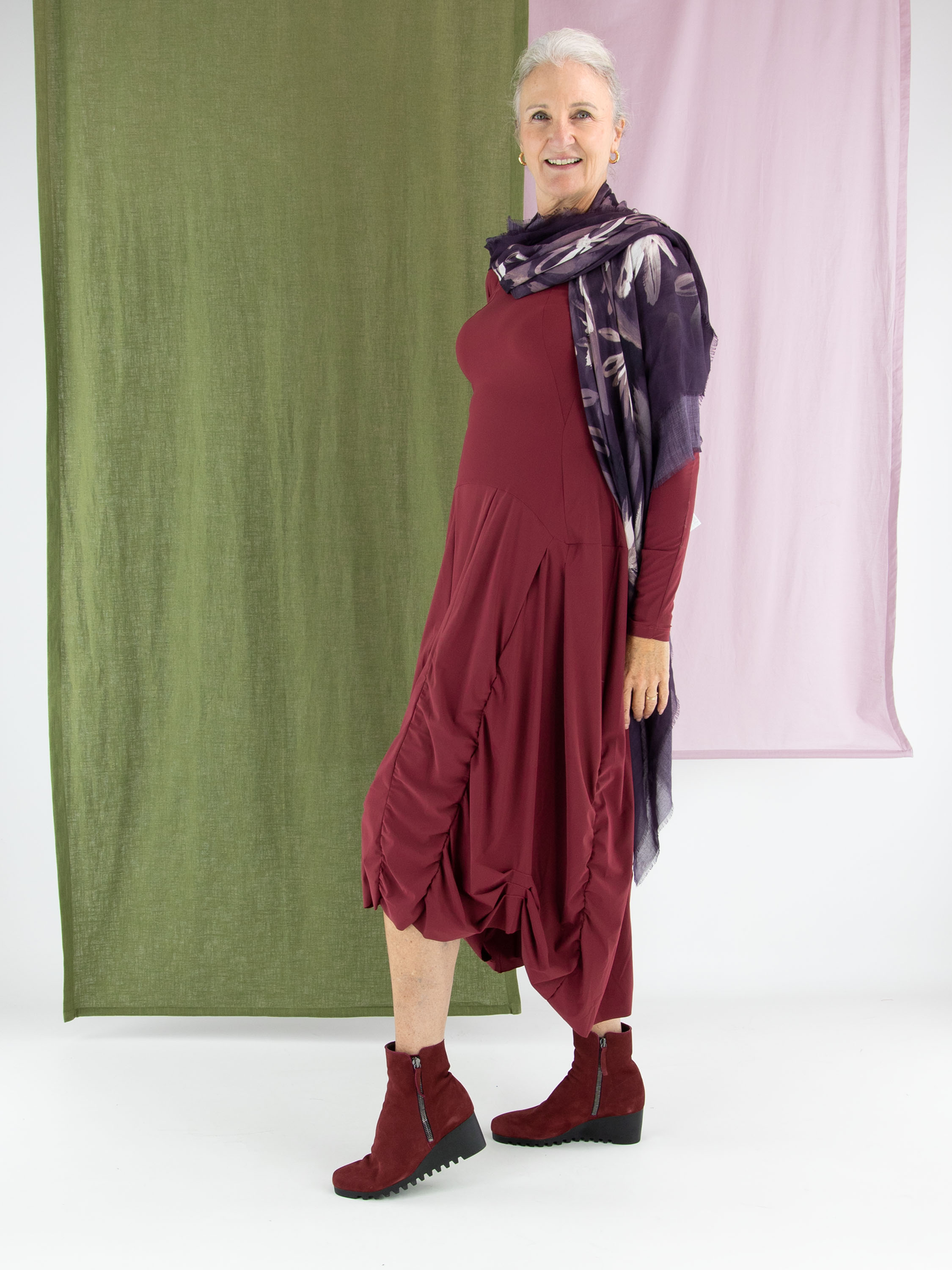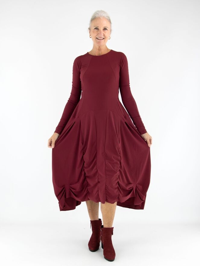 Ein Kleid von High in Aubergine. Das Kleid hat einen Rundhalsausschnitt und lange Ärmel. Von der Taille aus verlaufen vorne und hinten mehrere vertikale Nähte, entlang derer der Stoff fein gerafft ist. Dadurch entsteht ein dekorativer Smokeffekt, der der Silhouette eine raffinierte Ausstrahlung verleiht. Dieses Kleid kann bei 30 Grad gewaschen werden.