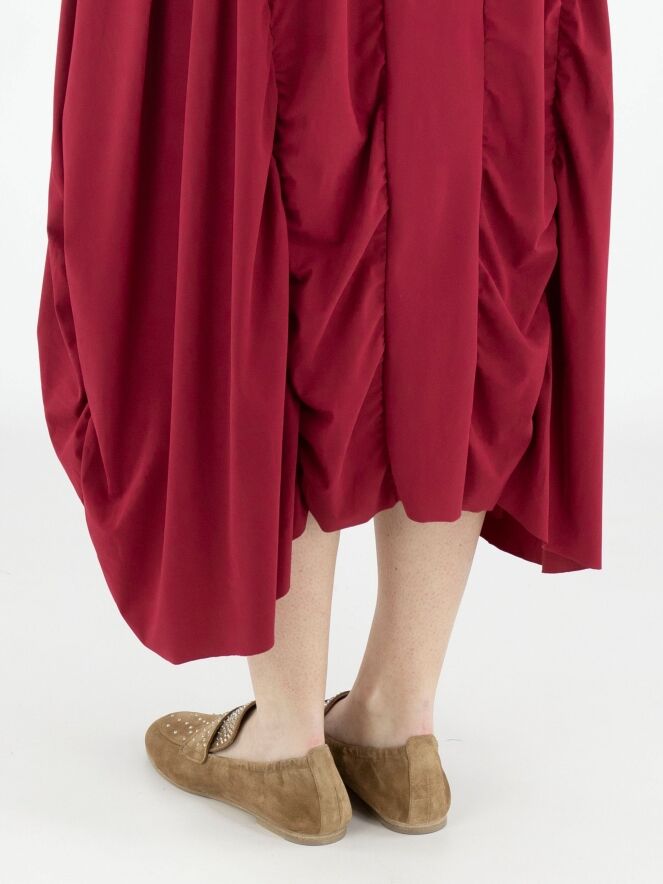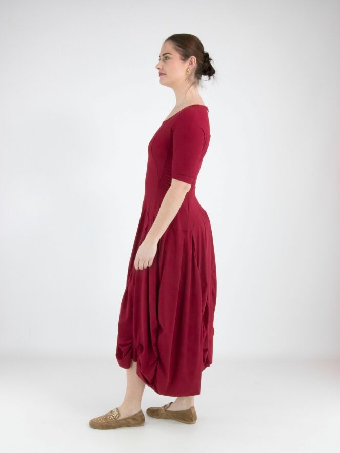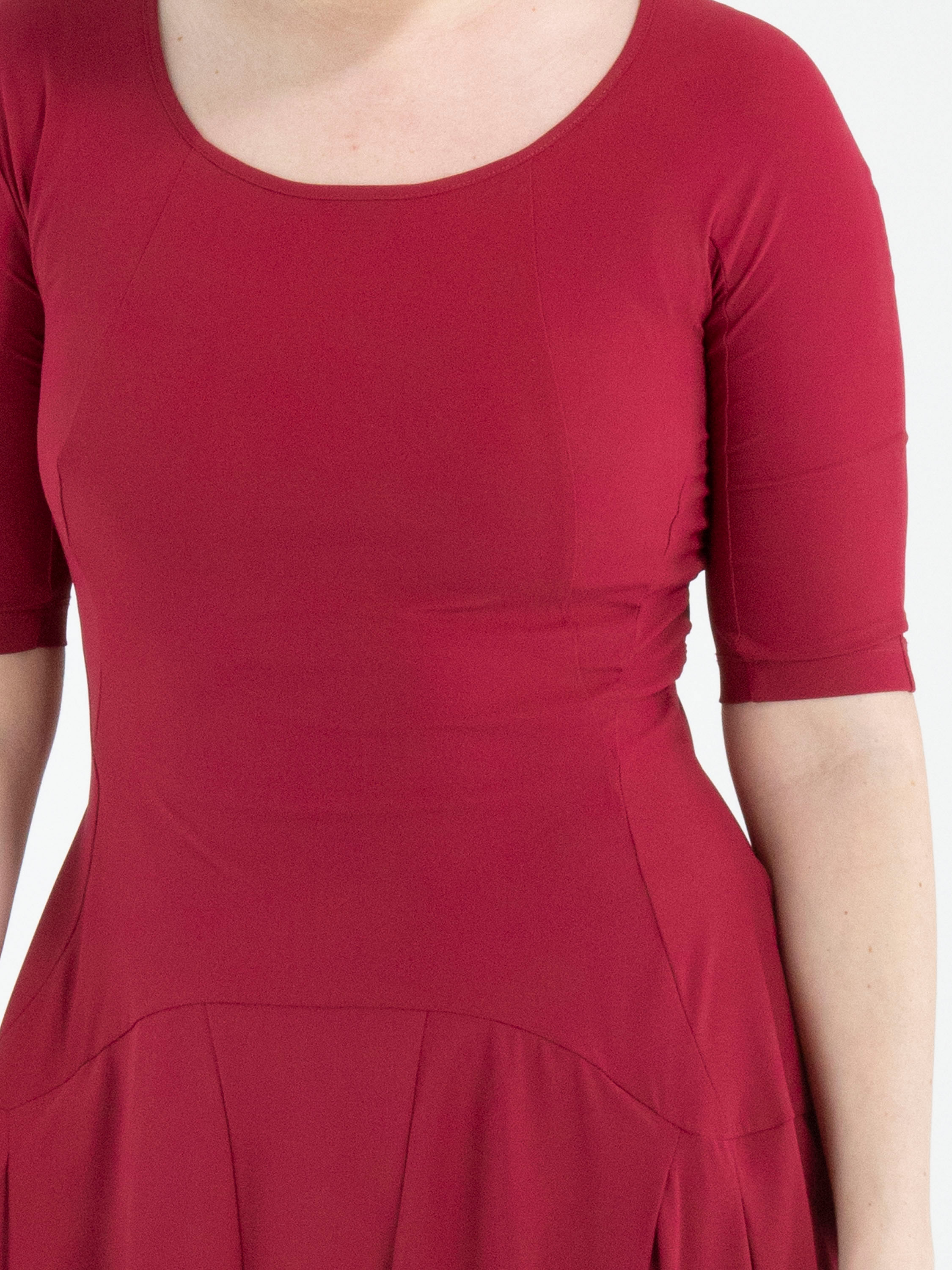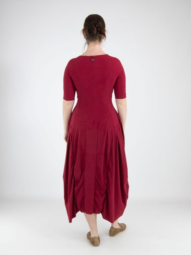 Ein Kleid von High Tech in Himbeerrot. Das Kleid hat einen großzügigen Rundhalsausschnitt und kurze Ärmel. Ab der Taille verlaufen mehrere vertikale Nähte, entlang derer der Stoff gelegt ist, was einen Smockeffekt erzeugt. Dieses Kleid kann bei 30 Grad gewaschen werden.