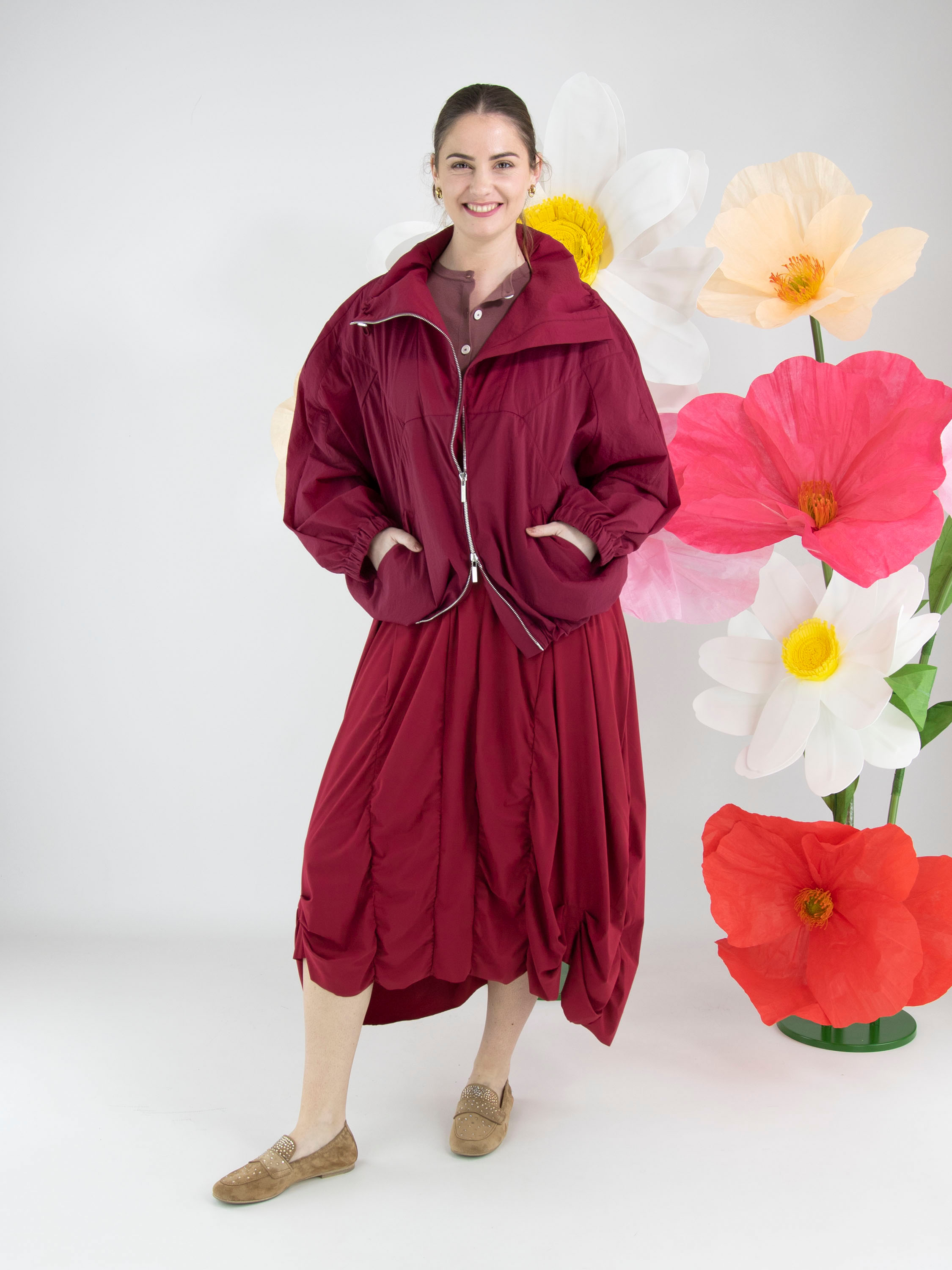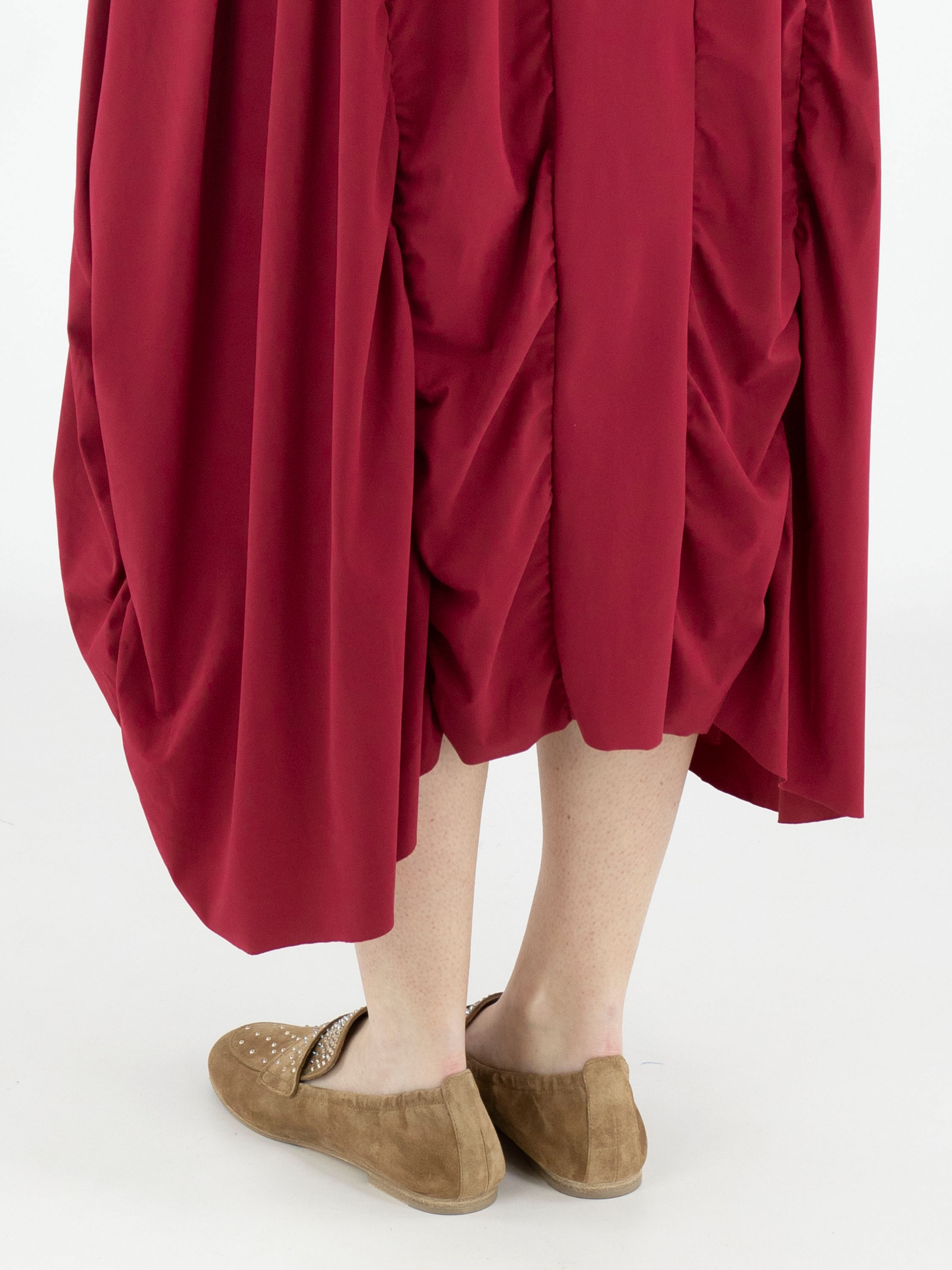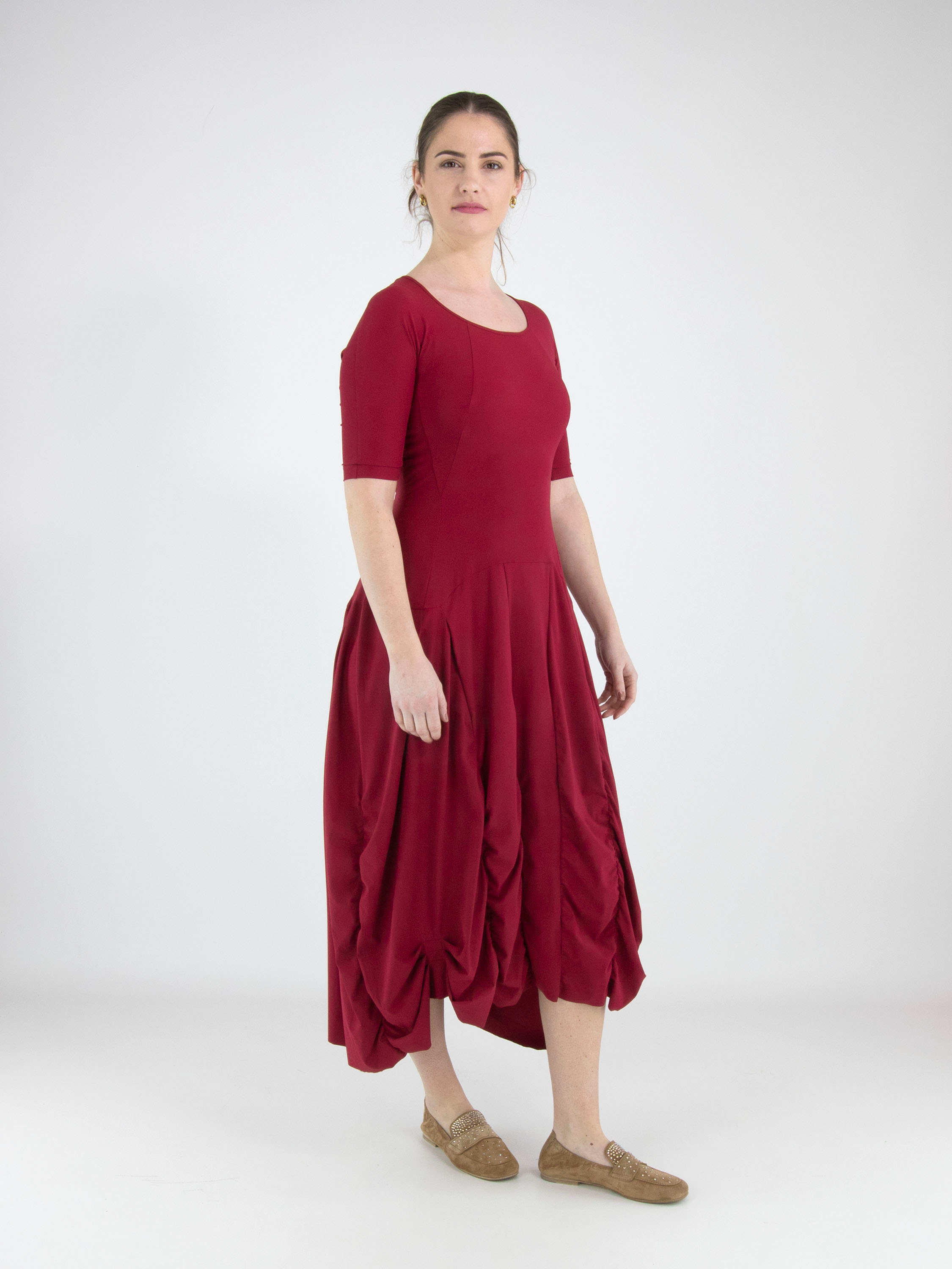 Ein Kleid von High Tech in Himbeerrot. Das Kleid hat einen großzügigen Rundhalsausschnitt und kurze Ärmel. Ab der Taille verlaufen mehrere vertikale Nähte, entlang derer der Stoff gelegt ist, was einen Smockeffekt erzeugt. Dieses Kleid kann bei 30 Grad gewaschen werden.