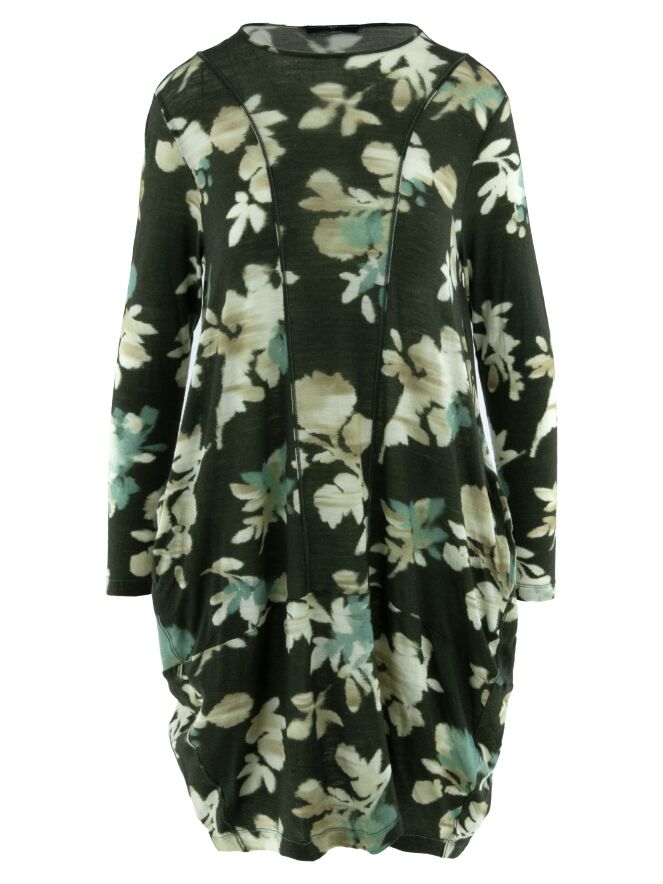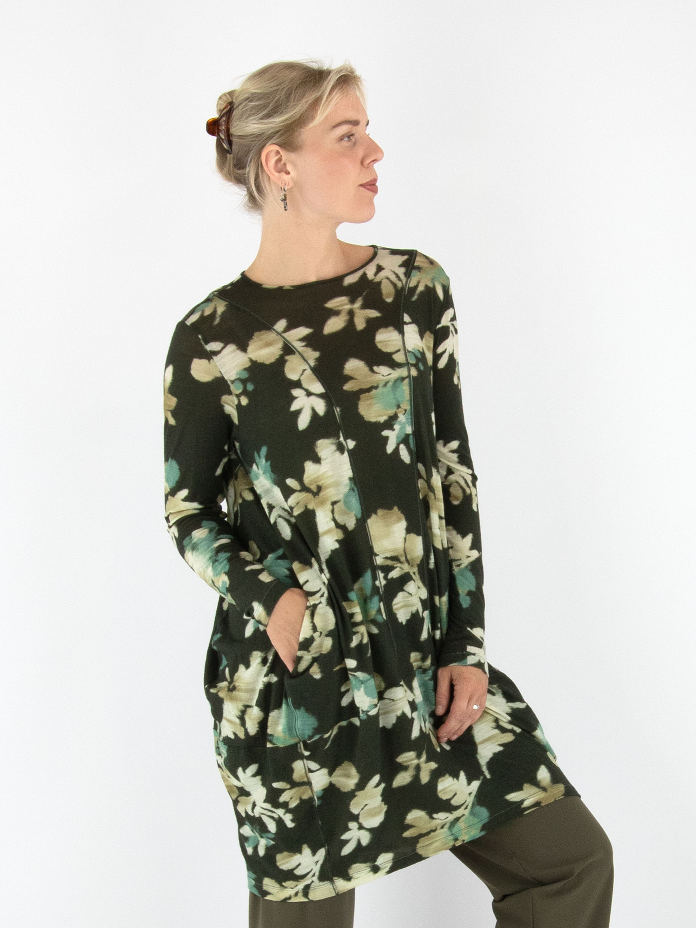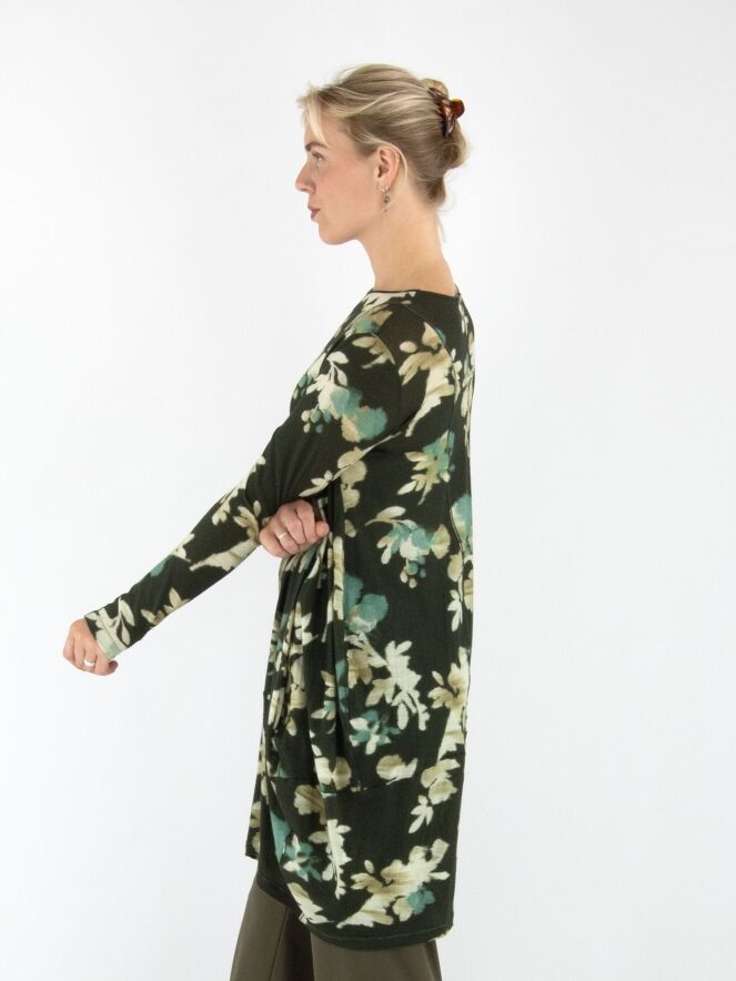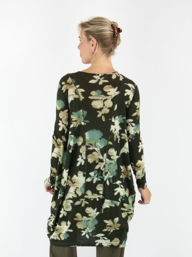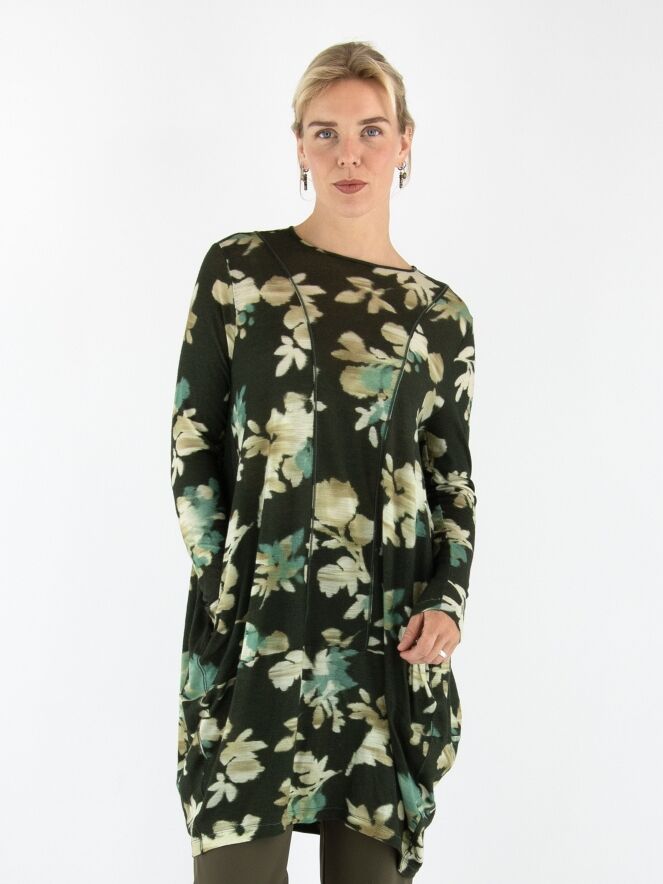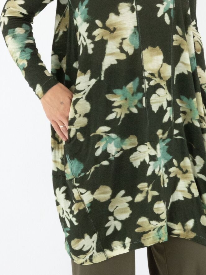 Ein Tunika von High mit einem grafischen Blumenmuster in Beige, Türkis und Off-White auf olivgrünem Hintergrund. Die Tunika hat einen runden Ausschnitt, lange Ärmel und verläuft ab der Hüfte schmal zulaufend. Diese Tunika sollte von Hand gewaschen werden.