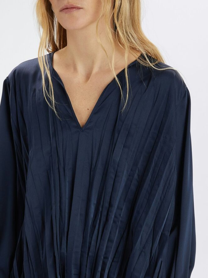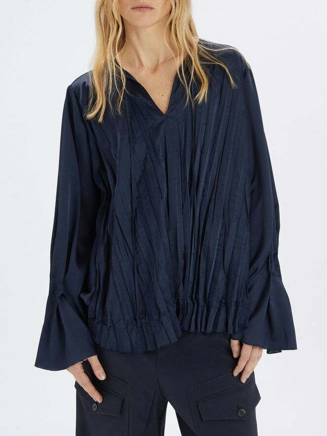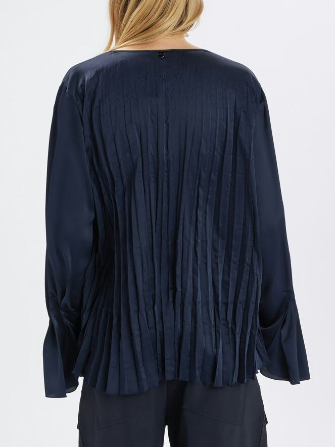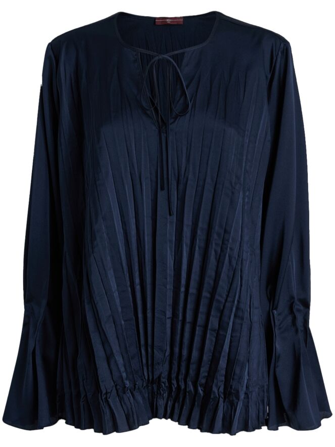 Eine Bluse von High in Marineblau. Die Bluse ist aus feinem Plissé gearbeitet und hat mittig einen V-Ausschnitt mit zwei schmalen Bändern, die vom Rundhalsausschnitt ausgehen. Die Ärmel sind aus glattem Stoff gefertigt und weit ausgestellt an den Enden. Diese Bluse kann bei 30 Grad gewaschen werden.