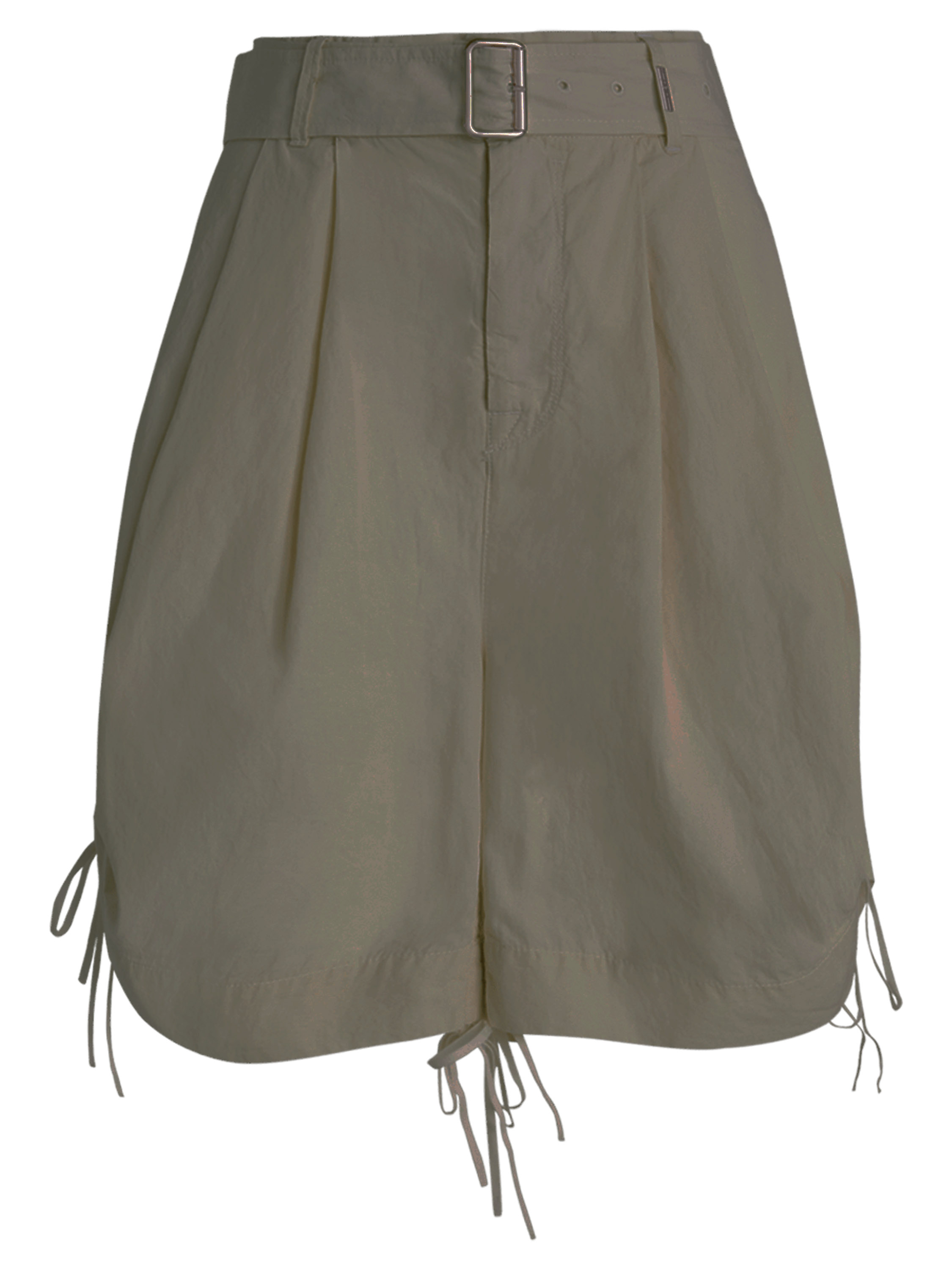 Eine Bermuda von High in einem weichen Olivgrün. Auf der Rückseite des Bundes ist ein elastischer Einsatz mit fein gerafftem Stoff eingearbeitet, der für zusätzlichen Komfort sorgt. In der Taille befindet sich ein breiter Gürtel aus dem gleichen Material. Sowohl an den Innen- als auch an den Außenseiten der Beinabschlüsse sind Tunnelzüge angebracht, mit denen sich ein dezenter Falteneffekt erzeugen lässt. Die Bermuda verfügt über seitliche Eingrifftaschen und sollte per Hand gewaschen werden.