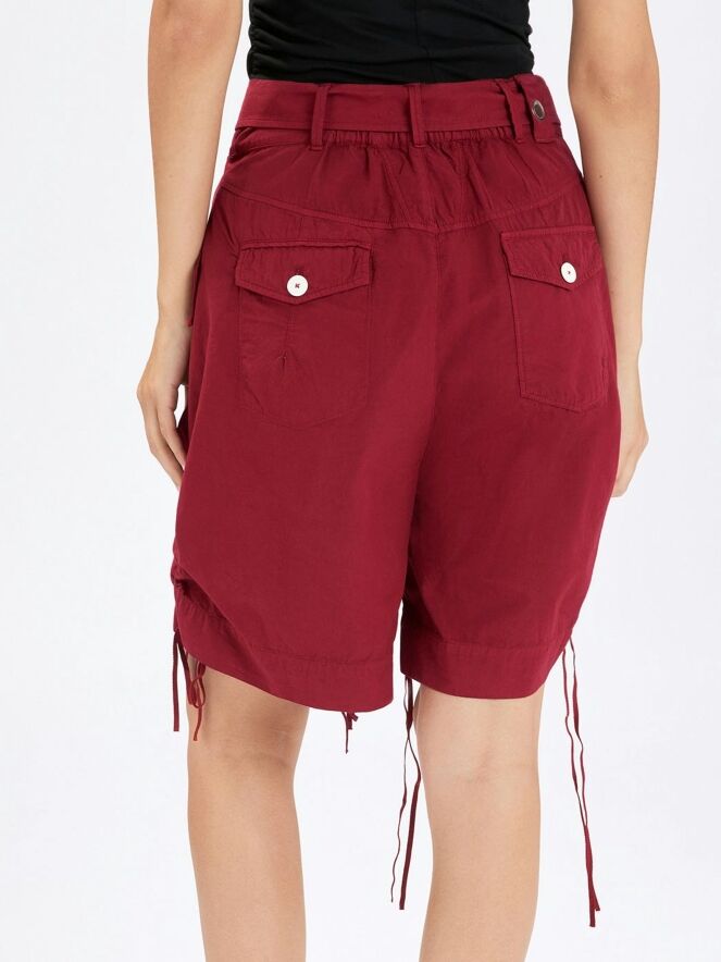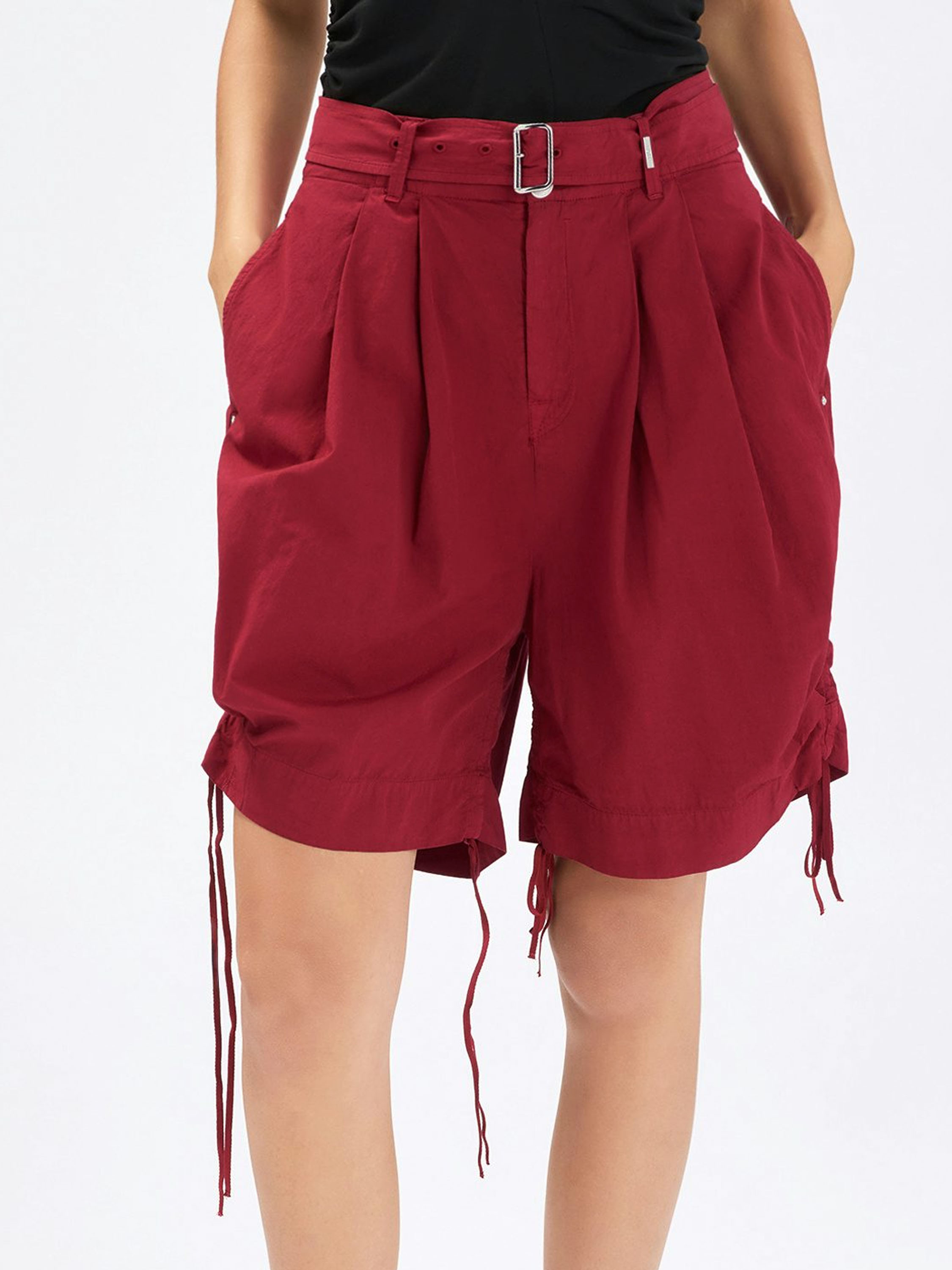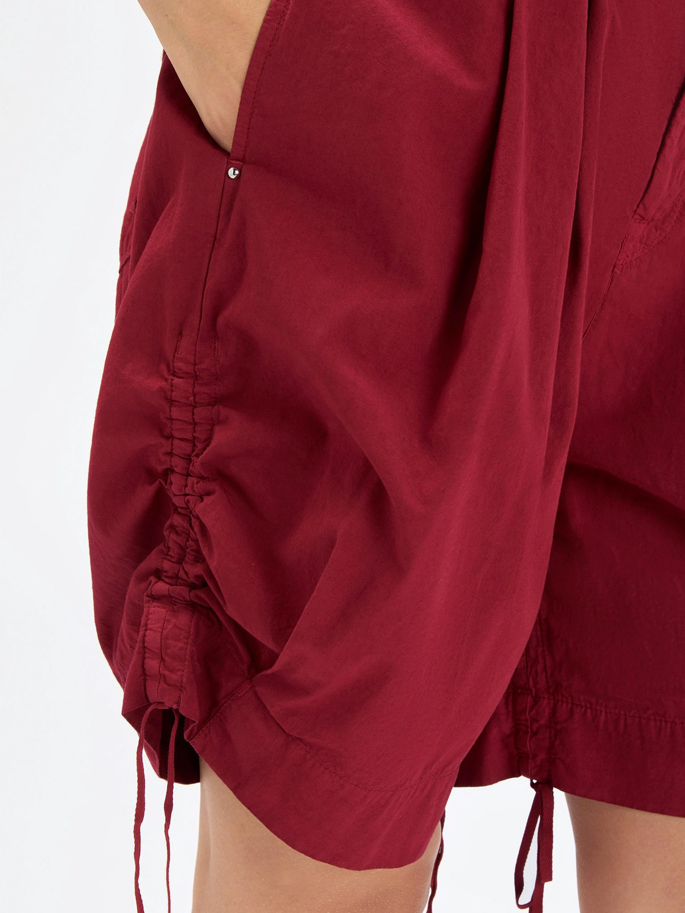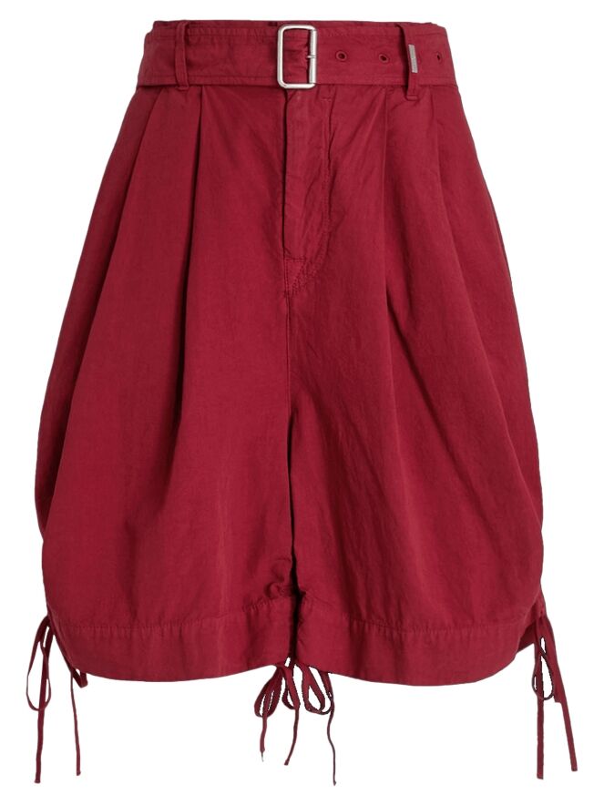 Eine Bermuda von High in einem satten himbeerroten Farbton. Die Rückseite des Bundes ist mit einem elastischen, fein gerafften Einsatz versehen, der für zusätzlichen Komfort sorgt. In der Taille befindet sich ein breiter Gürtel aus dem gleichen Material. Sowohl an der Innen- als auch an der Außenseite der Beinabschlüsse sind Tunnelzüge eingearbeitet, mit denen sich ein dezenter Falteneffekt erzeugen lässt. Die Bermuda verfügt über seitliche Eingrifftaschen und sollte per Hand gewaschen werden.