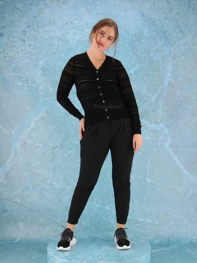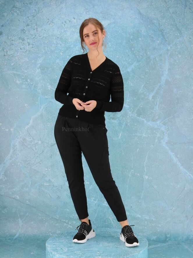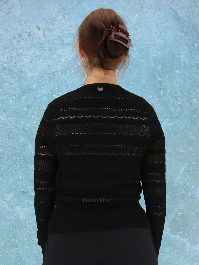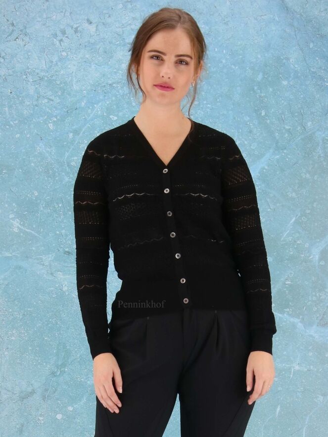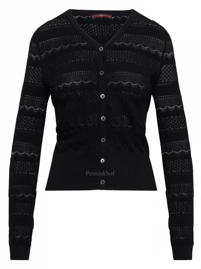 Ein grobmaschiger Cardigan der Designermarke High mit verschiedenen Lochmustern in der Farbe Schwarz. Der untere Saum und der Abschluss der Ärmel sind mit einem breiten Strickbündchen versehen. Diese Strickweste kann von Hand gewaschen werden.
