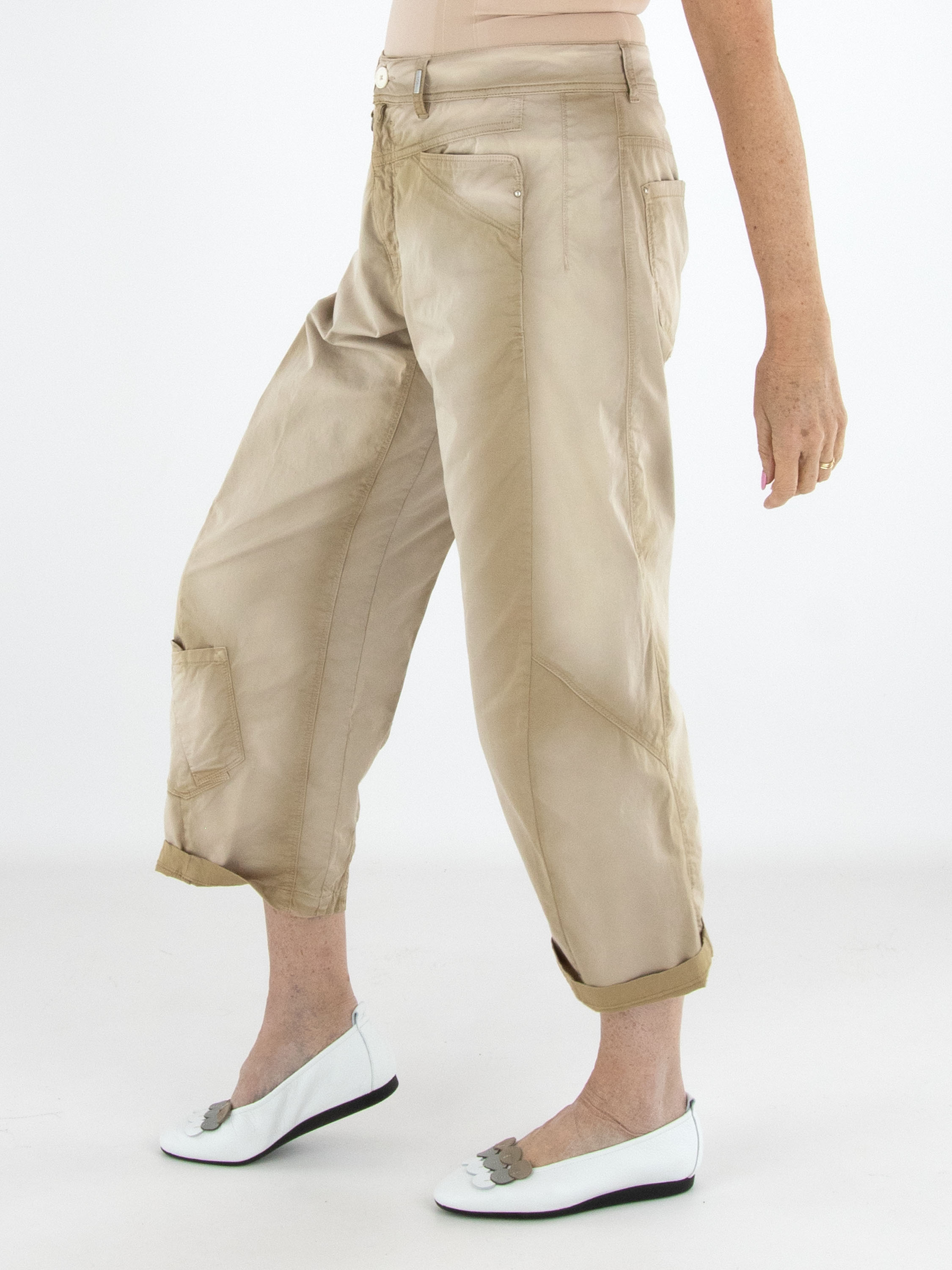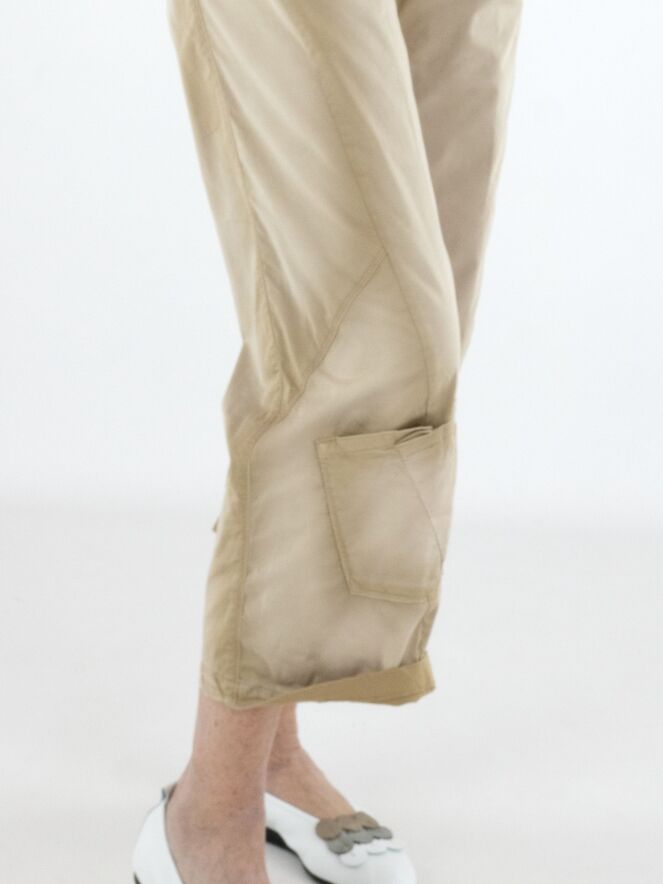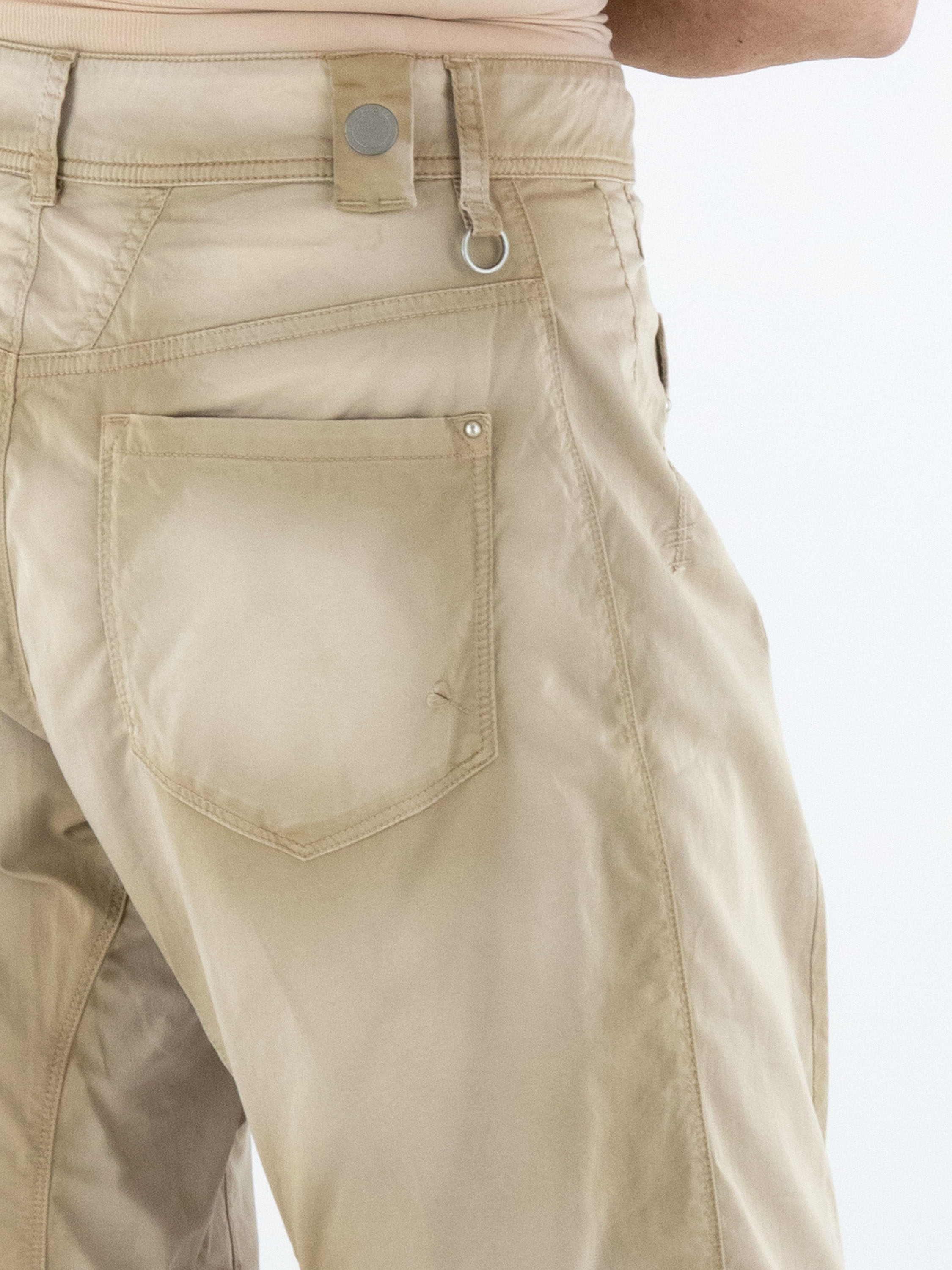 Used-Jeans aus einer sommerlichen Baumwollqualität mit feiner, gesprenkelter Struktur. Am unteren Teil des rechten Hosenbeins ist eine dekorative Tasche diagonal aufgesetzt, die dem Design eine moderne, verspielte Note verleiht. Unterhalb der Knie verlaufen an der Außenseite der Beine formgebende Nähte, die die Silhouette dezent modellieren. Diese Jeans kann bij 30 Grad gewaschen werden.