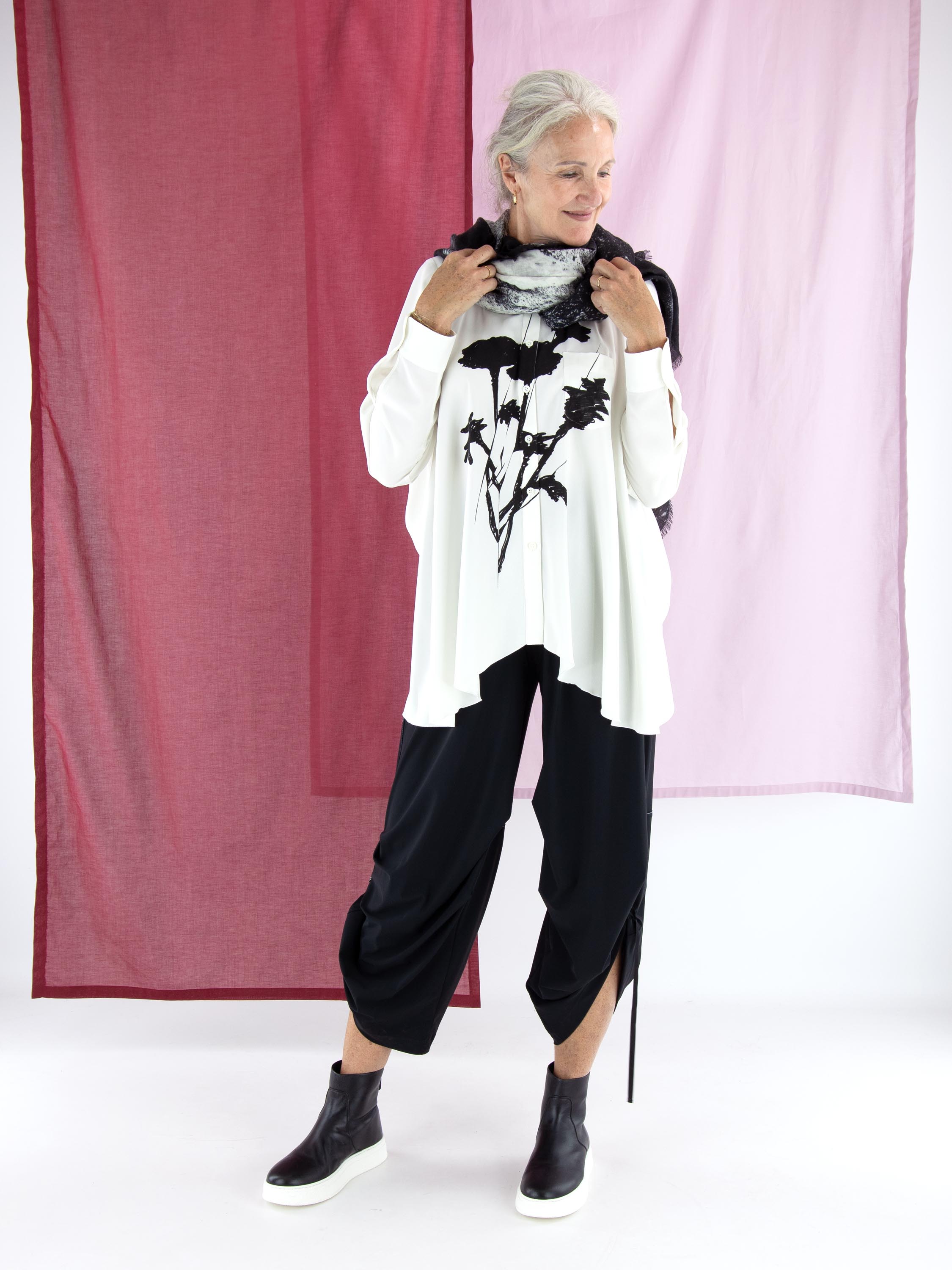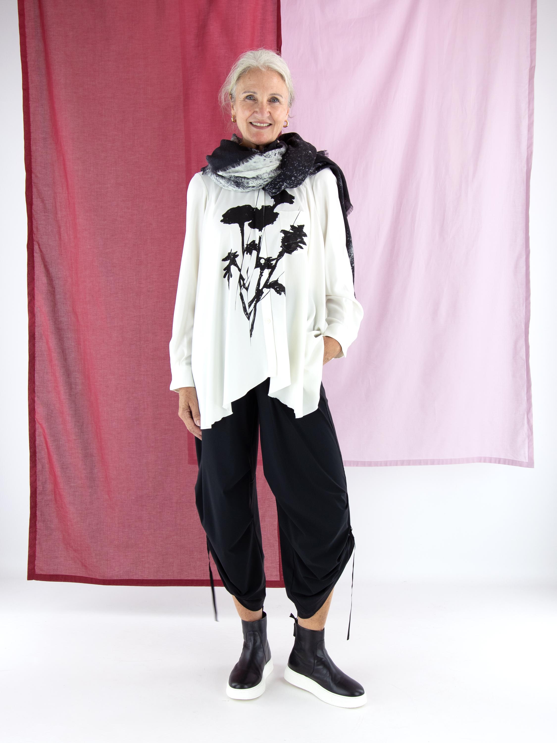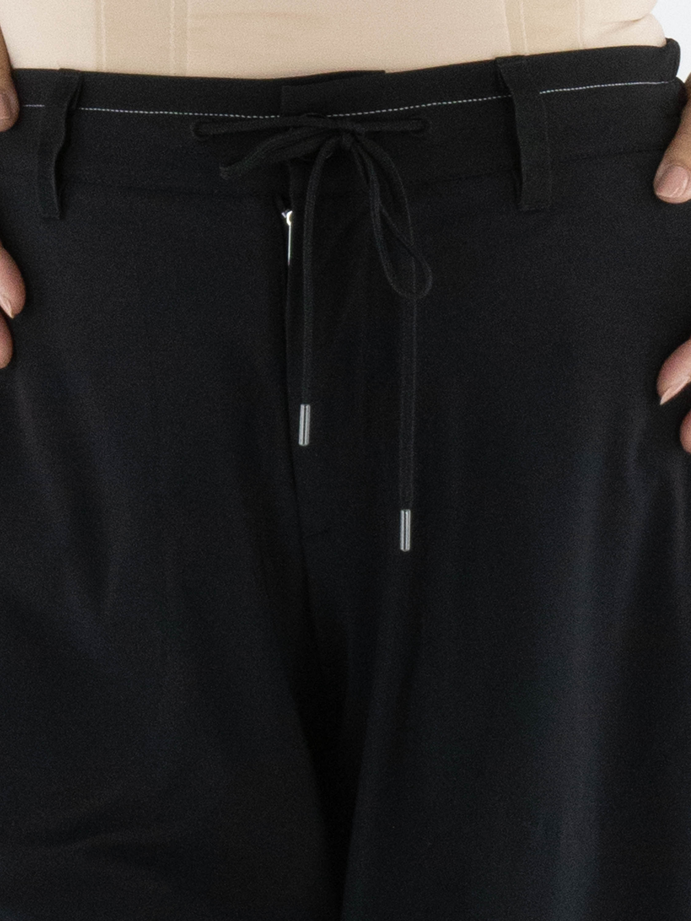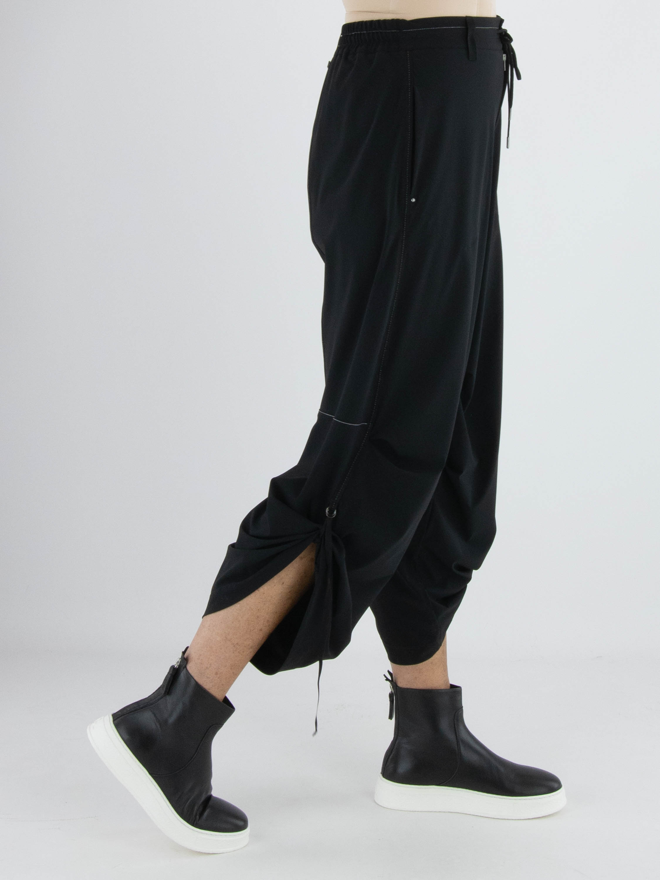 Eine Hose von High in Schwarz. Hinten am Bund befindet sich ein fein plissiertes elastisches Band. Zusätzlich ist ein Kordelzug in Tunnelverarbeitung eingearbeitet. Entlang der Nähte wurde an mehreren Stellen weißes Garn als dekoratives Detail verwendet. Am unteren Ende befinden sich an den Seiten Bänder, mit denen mithilfe eines Ringschlusses ein Raffeffekt erzeugt werden kann. Die Hose hat Seitentaschen und sollte per Hand gewaschen werden.