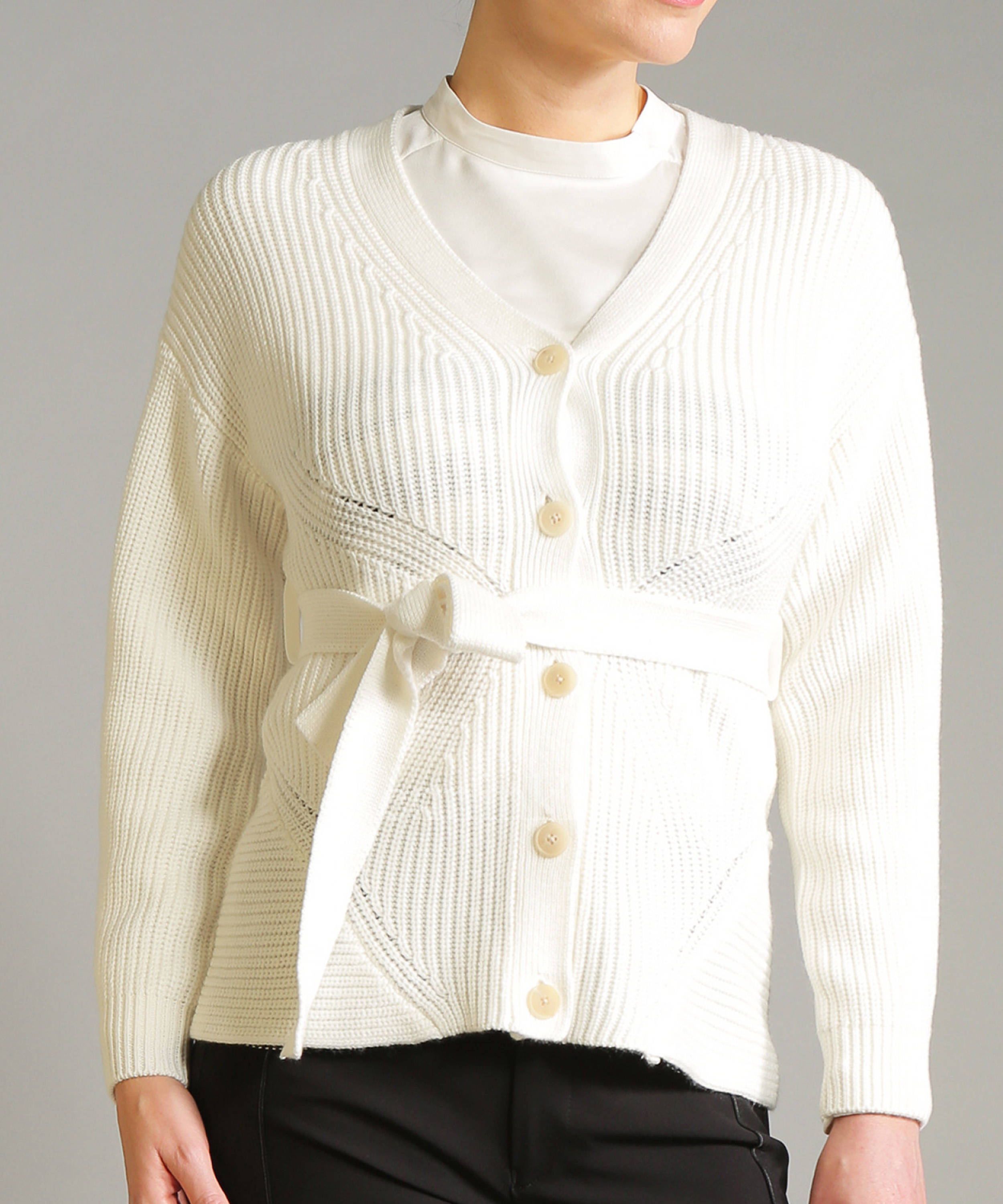 Ein Cardigan der Designermarke High in Cremeweiß. Der Cardigan hat einen V-Ausschnitt und wird mit vier Knöpfen geschlossen. An der Taille befindet sich ein Strickgürtel. Diese Strickjacke kann von Hand gewaschen werden.