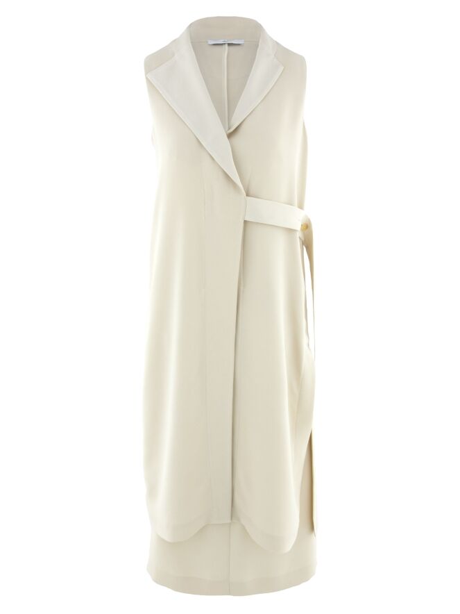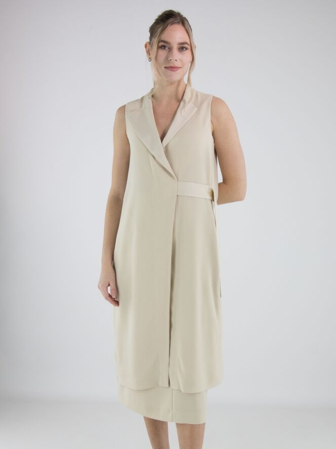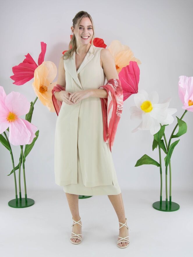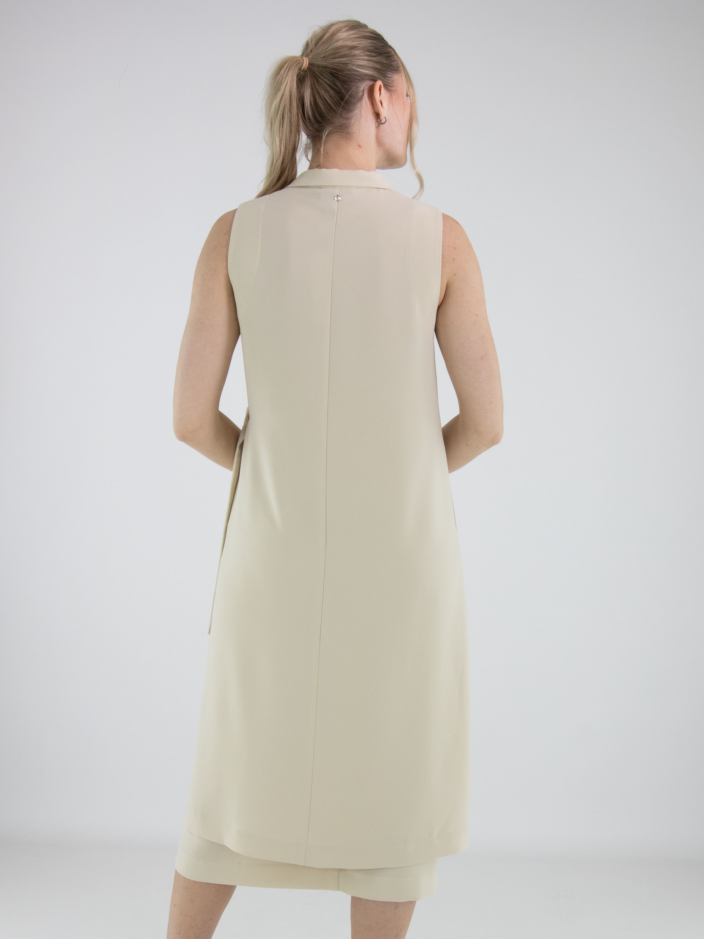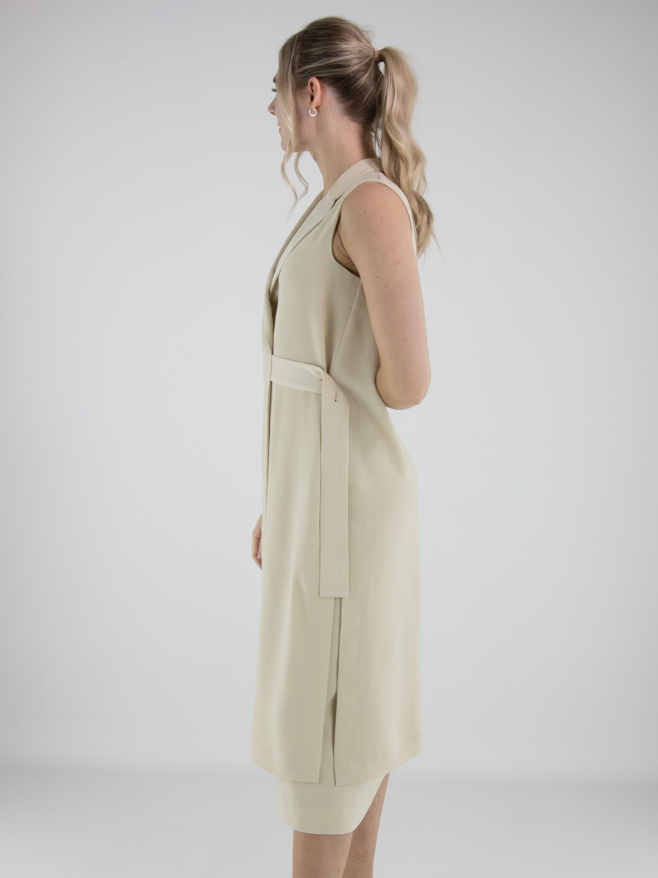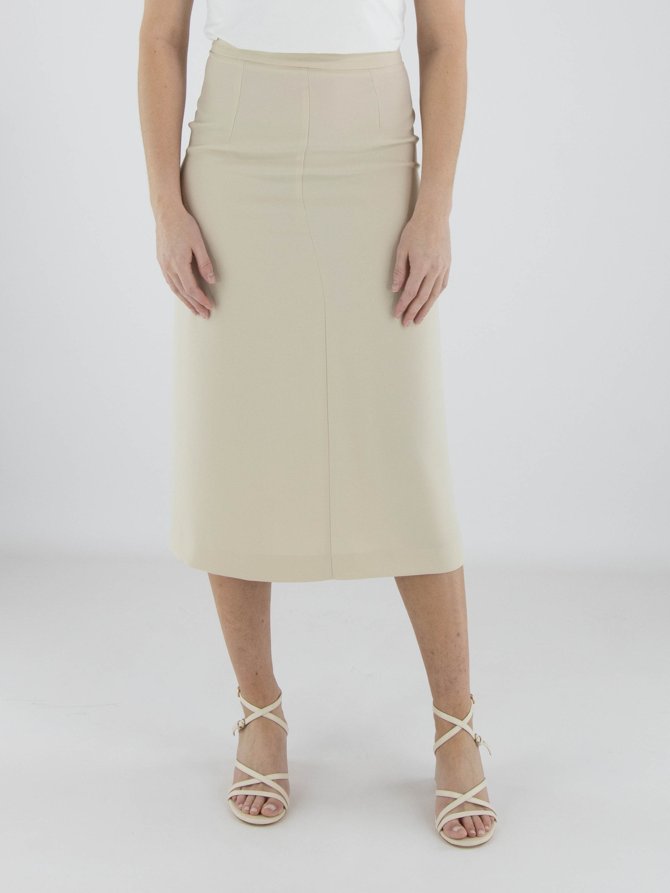 Zweiteiliges Set von High, bestehend aus einer Wickeltunika und einem Rock in einem eleganten Beigeton. Die Tunika wird mit zwei verdeckten Knöpfen und einem Band geschlossen, das an der linken Seite gebunden werden kann. Sie verfügt über einen V-Ausschnitt und tiefe seitliche Schlitze bis zur Taille, die eine fließende, moderne Silhouette schaffen. Auf Taillenhöhe sind Eingrifftaschen eingearbeitet. Der Rock ist gerade geschnitten und hat einen seitlichen Reißverschluss. Dieses Set sollte per Hand gewaschen werden.
