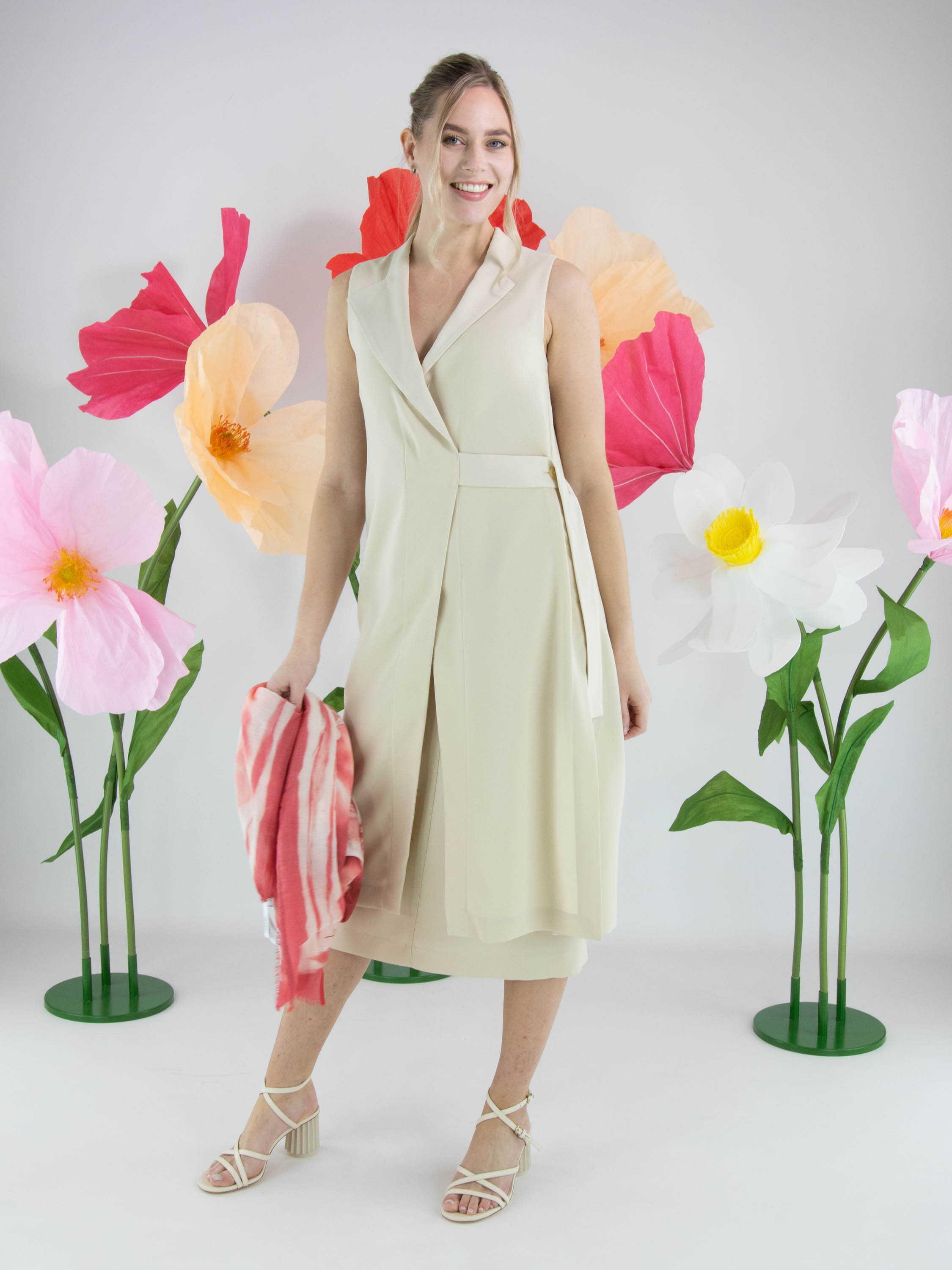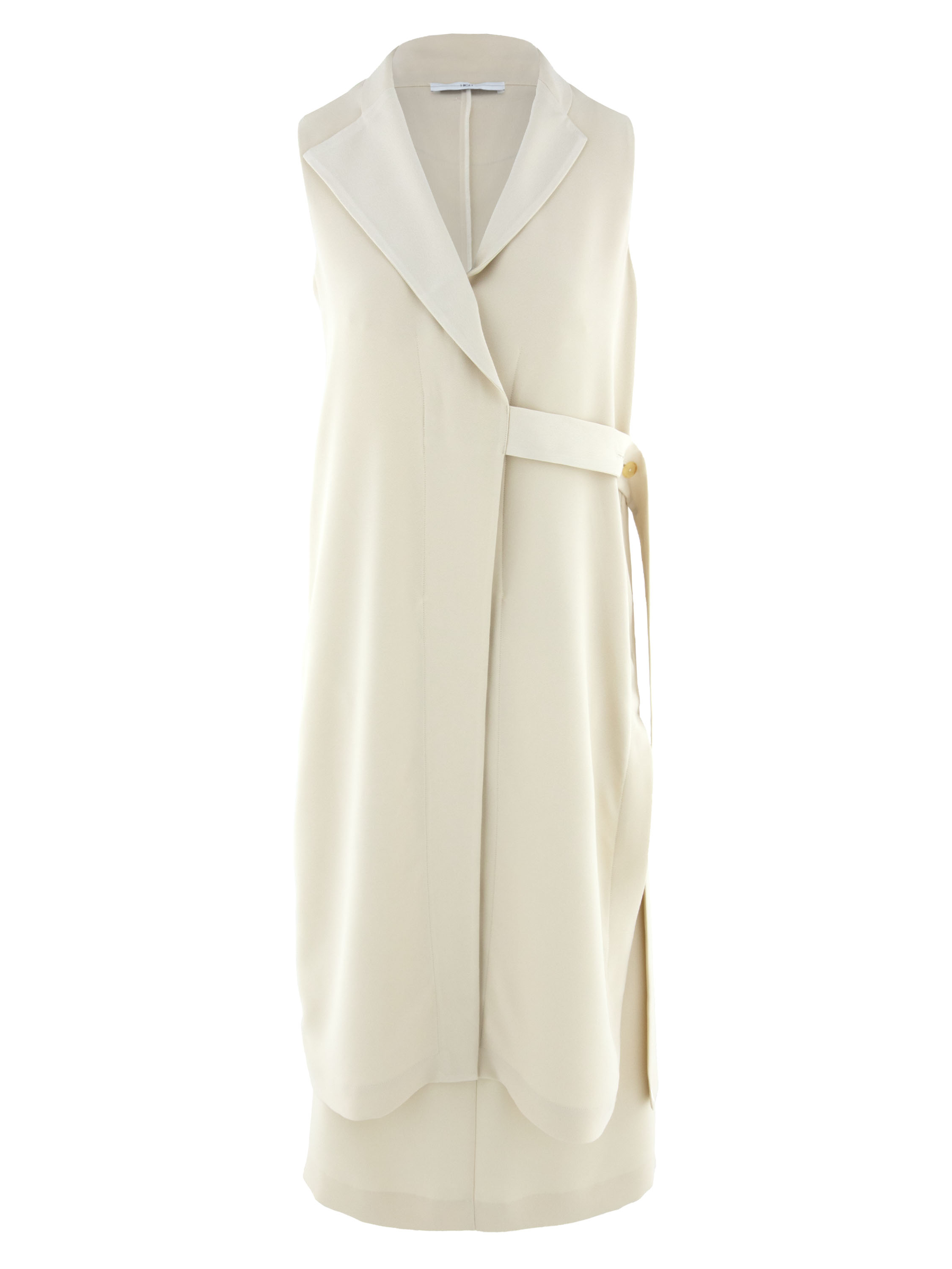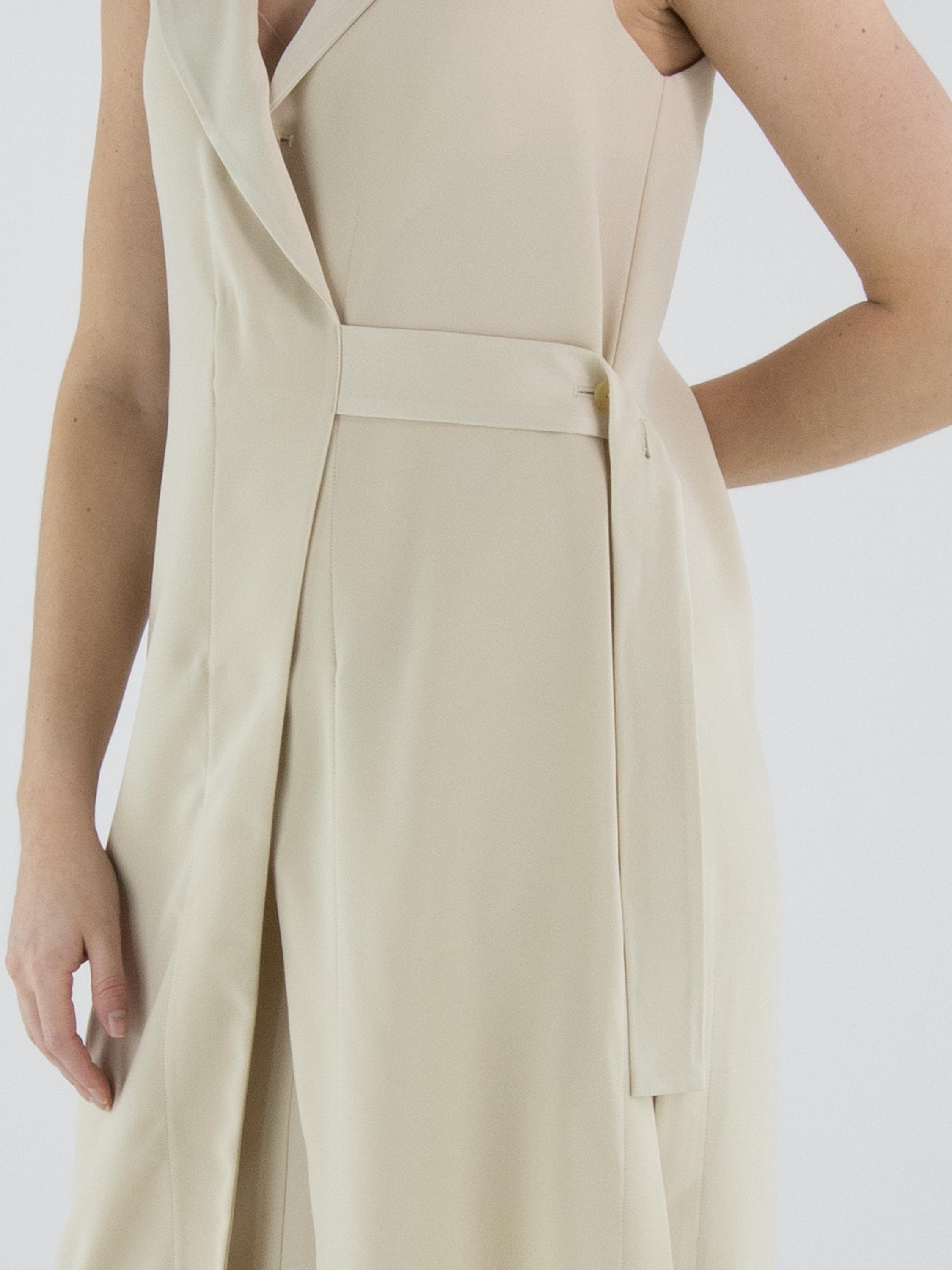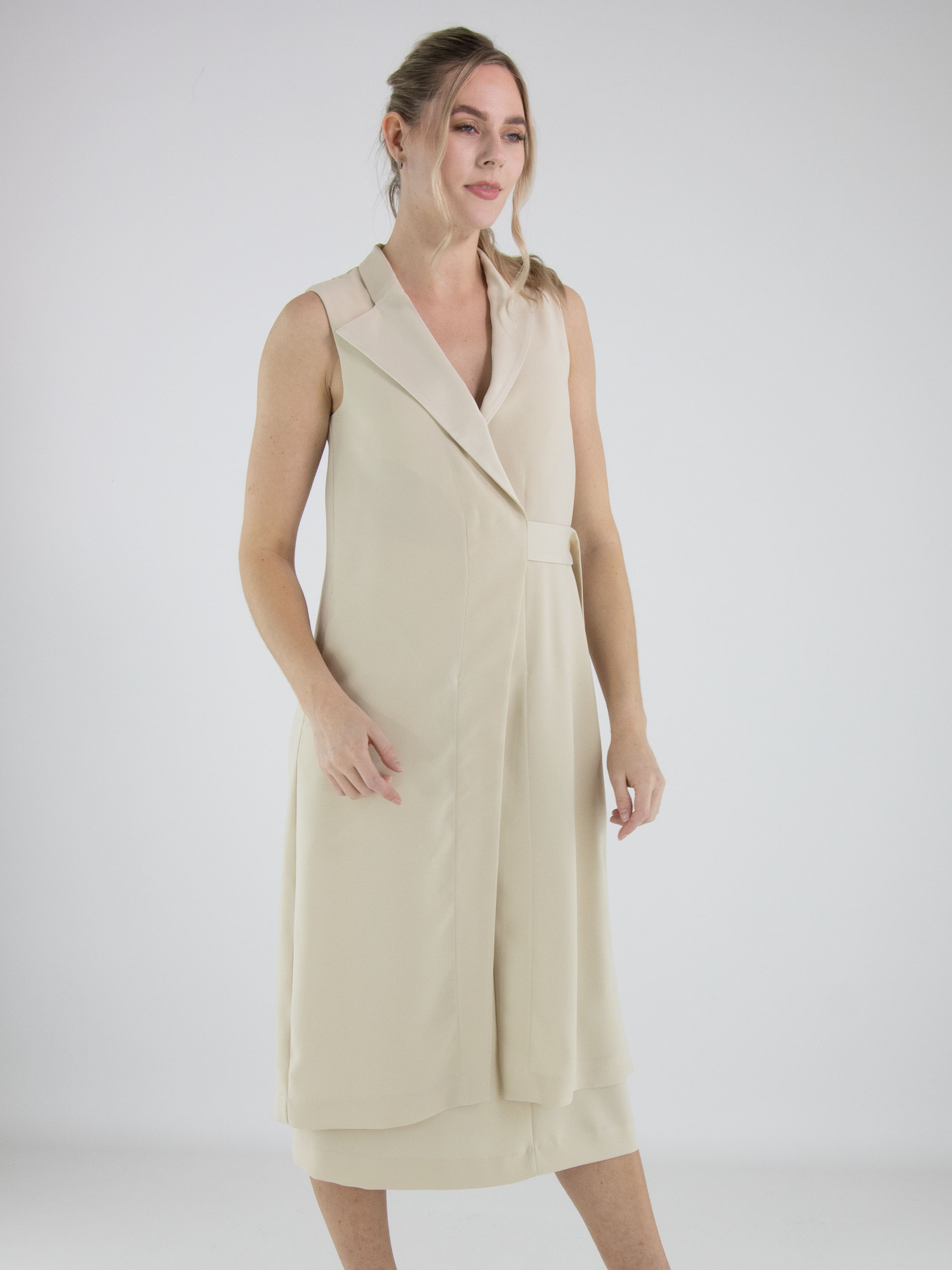 Zweiteiliges Set von High, bestehend aus einer Wickeltunika und einem Rock in einem eleganten Beigeton. Die Tunika wird mit zwei verdeckten Knöpfen und einem Band geschlossen, das an der linken Seite gebunden werden kann. Sie verfügt über einen V-Ausschnitt und tiefe seitliche Schlitze bis zur Taille, die eine fließende, moderne Silhouette schaffen. Auf Taillenhöhe sind Eingrifftaschen eingearbeitet. Der Rock ist gerade geschnitten und hat einen seitlichen Reißverschluss. Dieses Set sollte per Hand gewaschen werden.