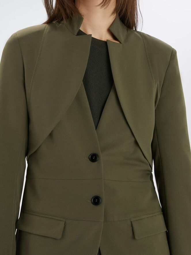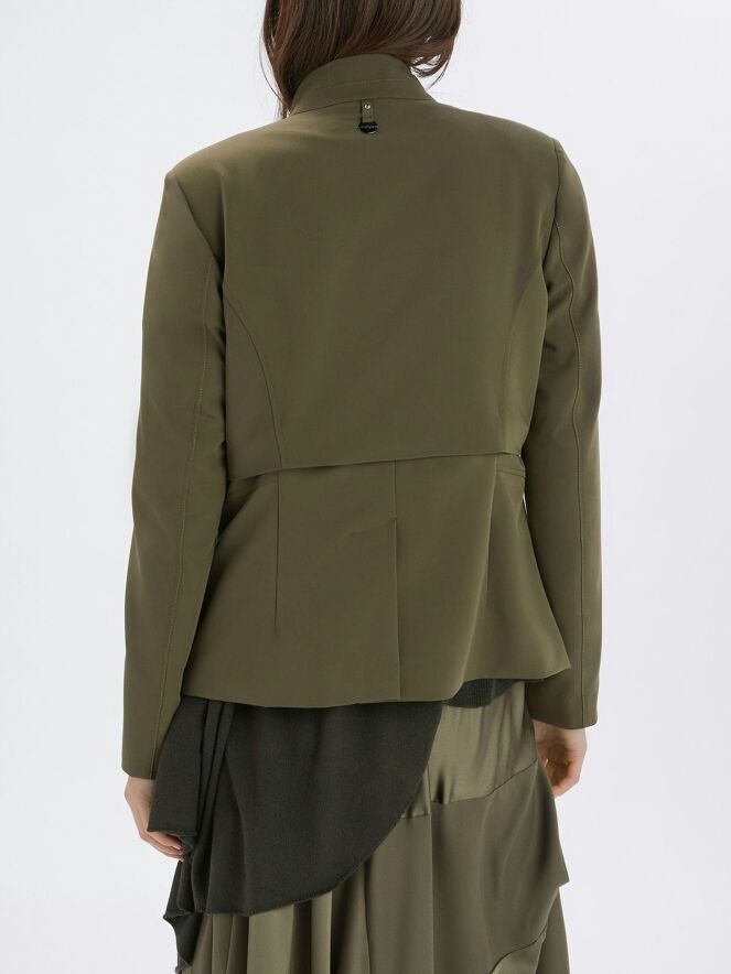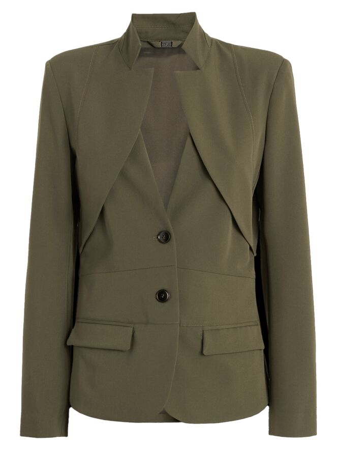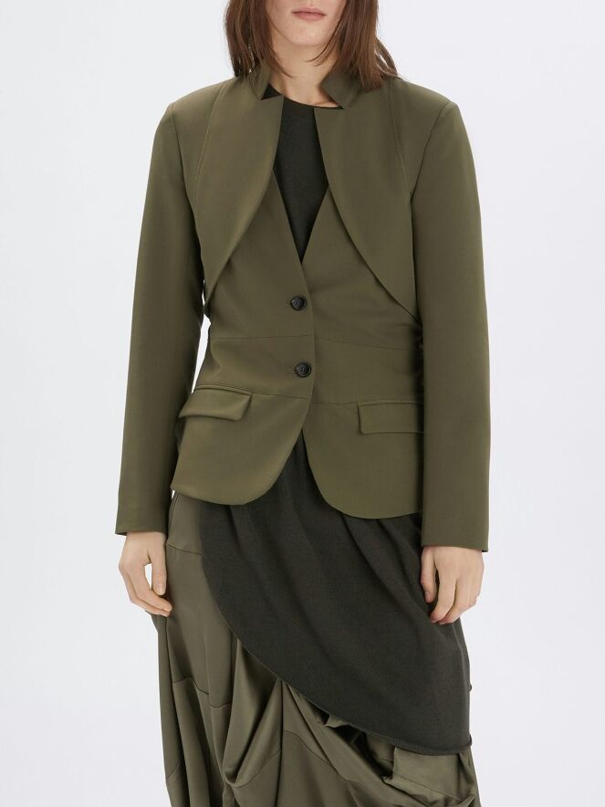 Ein Blazer von High in Olivgrün. Auf der Vorderseite verläuft ab dem Ärmeleinsatz eine zweite Stofflage, die teilweise als Revers dient. Der Blazer hat einen Zweiknopfverschluss und ist komplett gefüttert. Dieser Blazer darf nicht gewaschen werden.