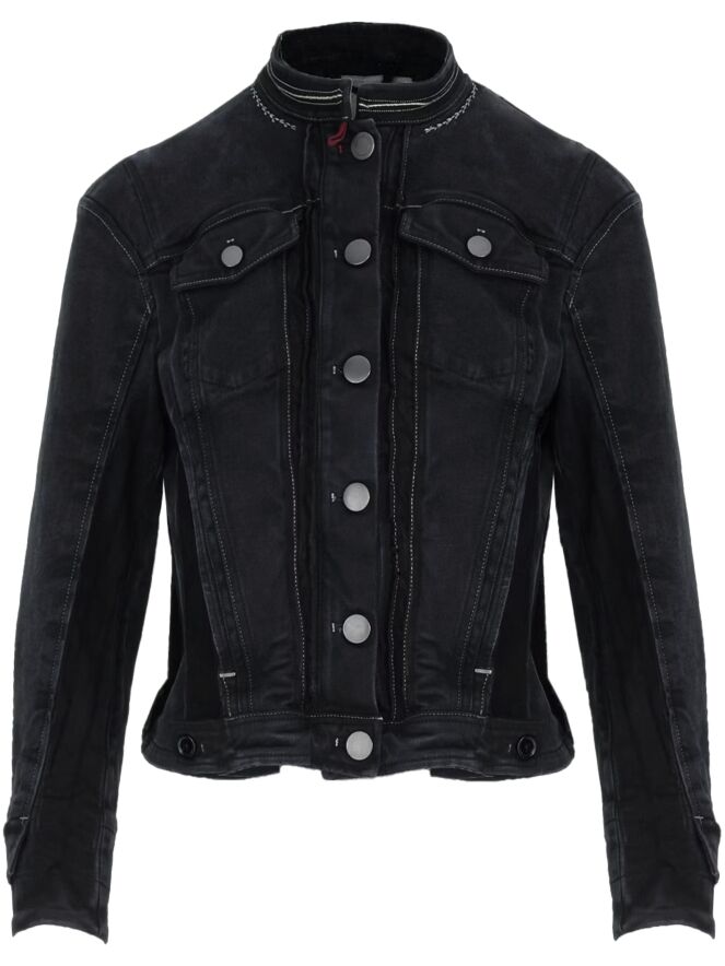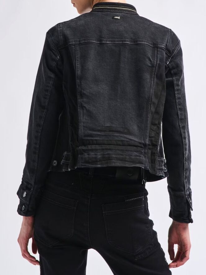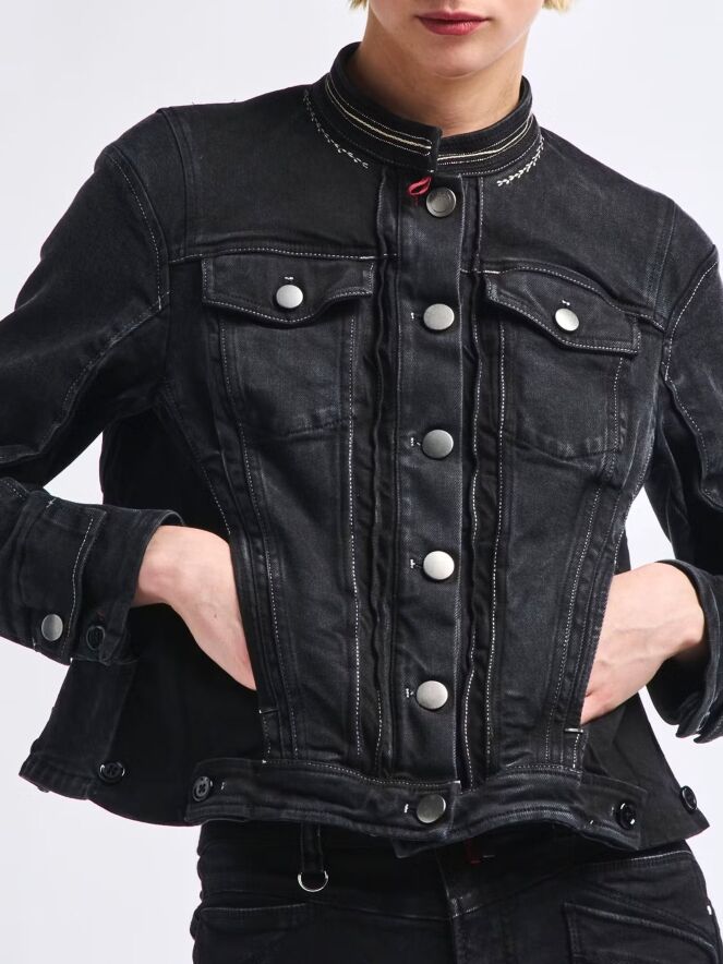 Ein Jeansblazer von High in dunkelblauer Denimfarbe. Der Halsrand ist mit einem Strassfaden und einer Naht als Borte versehen. Auf der Vorderseite gibt es mehrere vertikale Nähte. Mit Knöpfen an der Unterseite der Seiten kann der Blazer enger oder weiter tailliert eingestellt werden. Dieser Jeansblazer kann bei 30 Grad gewaschen werden.