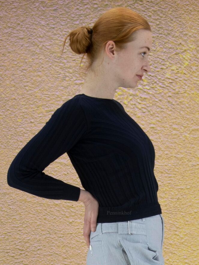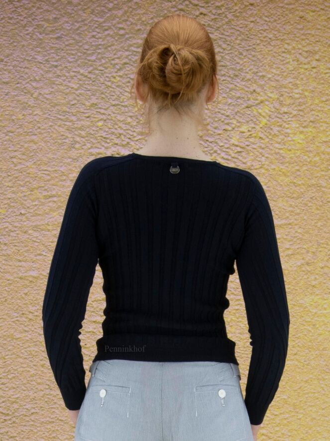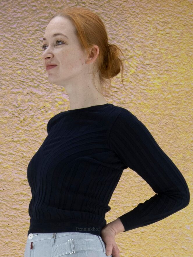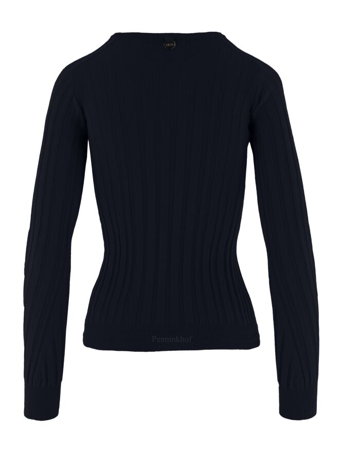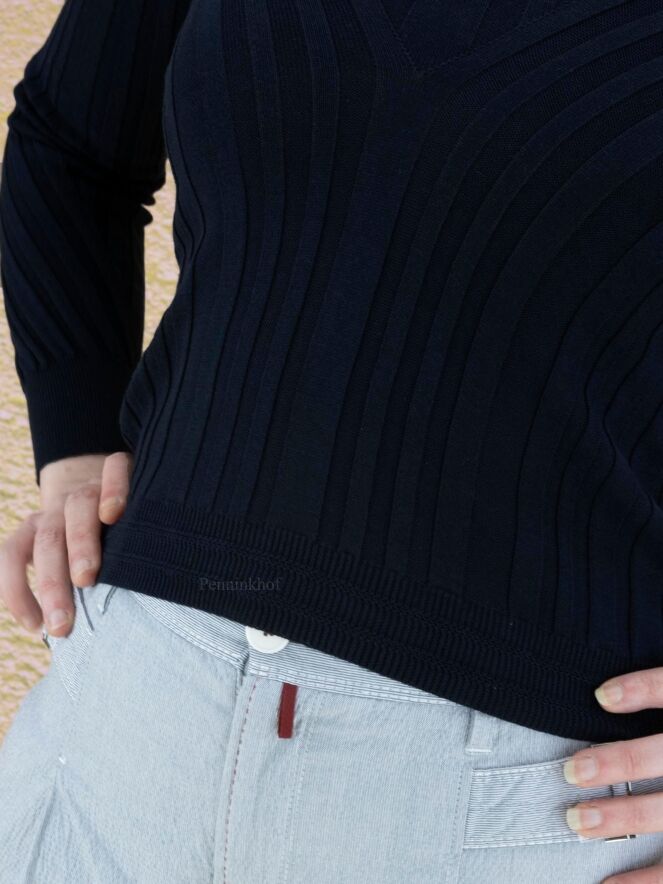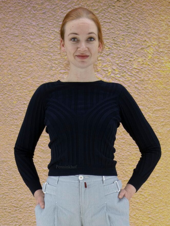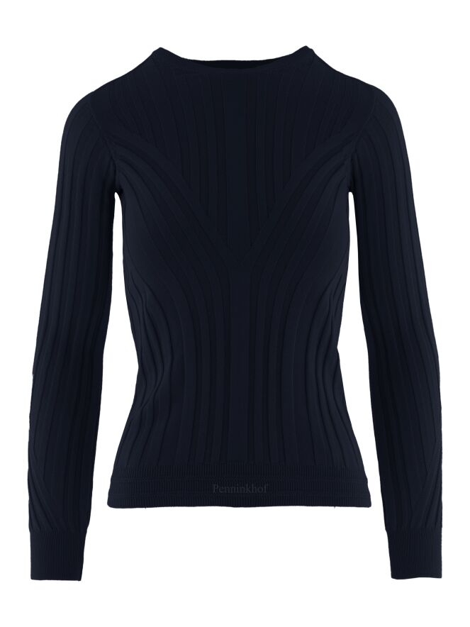 Ein breit gerippter Pullover der Designermarke High in Marineblau. Die Abschlüsse der langen Ärmel sind mit einem breiten Strickbund versehen. Der Pullover hat einen Stehkragen und kann von Hand gewaschen werden.