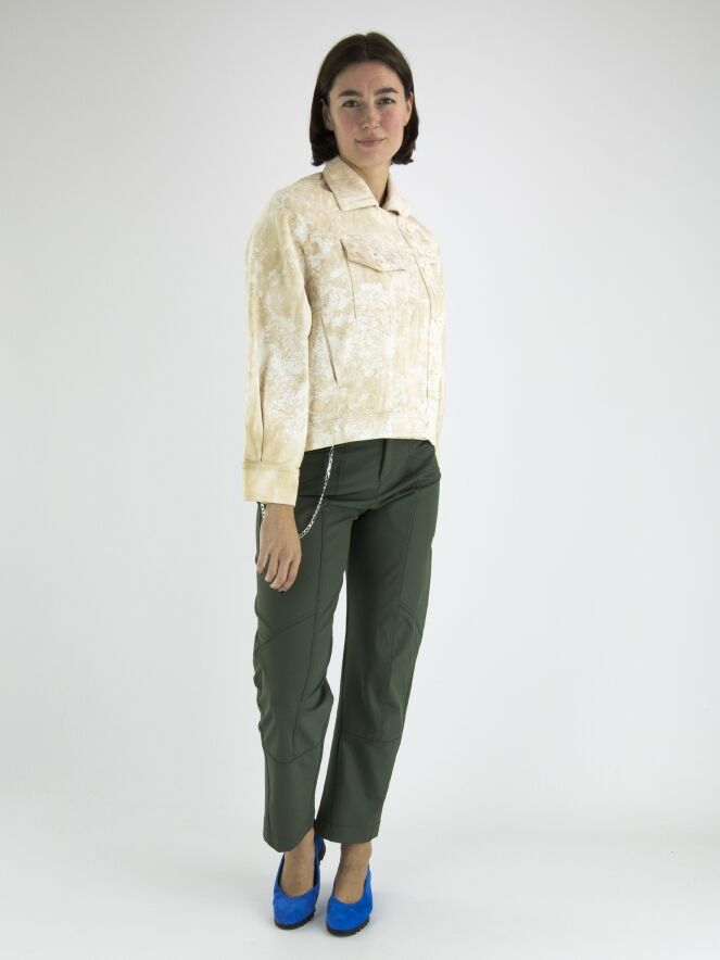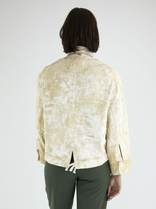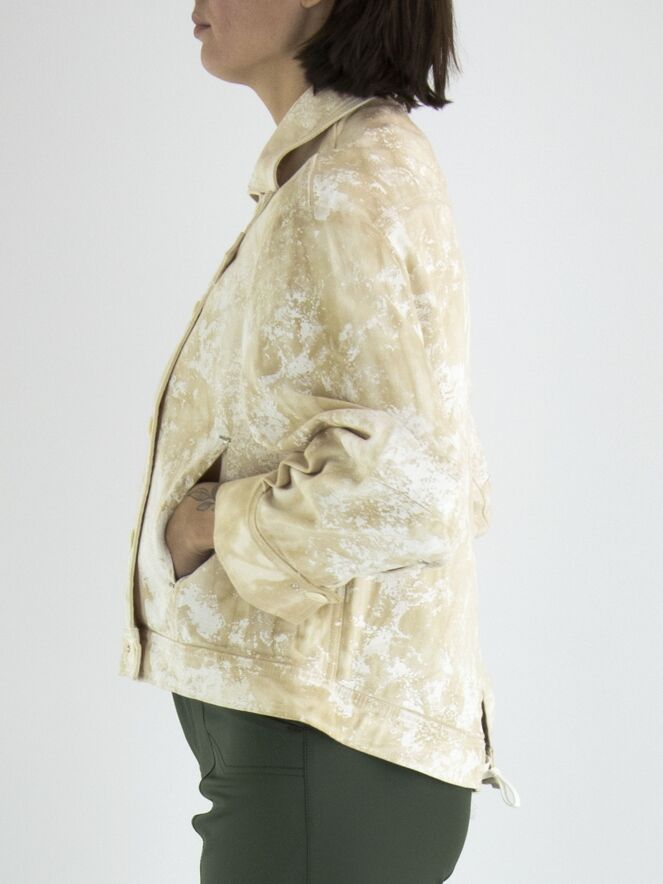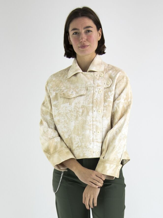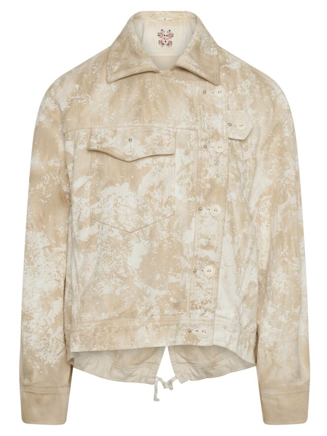 Ein Jeansblazer von High in einem Batik-Druck mit mehreren Sandtönen auf einer cremeweißen Grundfarbe. Der Blazer hat Seitentaschen und einen asymmetrischen Verschluss. Auf der Rückseite befindet sich ein kurzer Schlitz in der Mitte des unteren Rands mit zwei Kordeln, mit denen Falten in den Saum gelegt werden können. Dieser Blazer kann bei 30 Grad gewaschen werden.