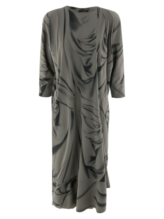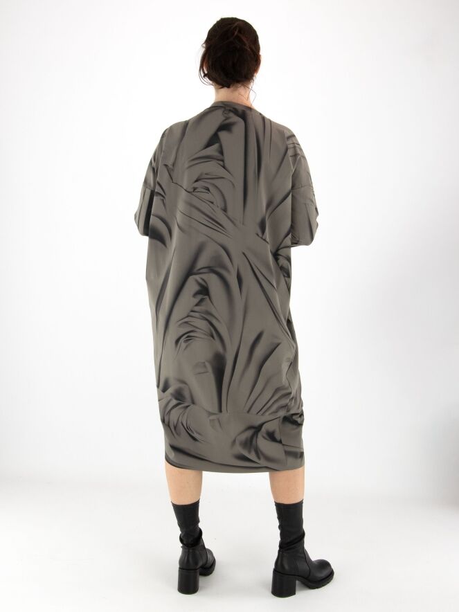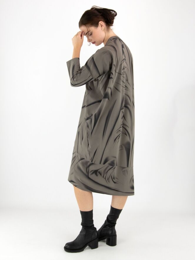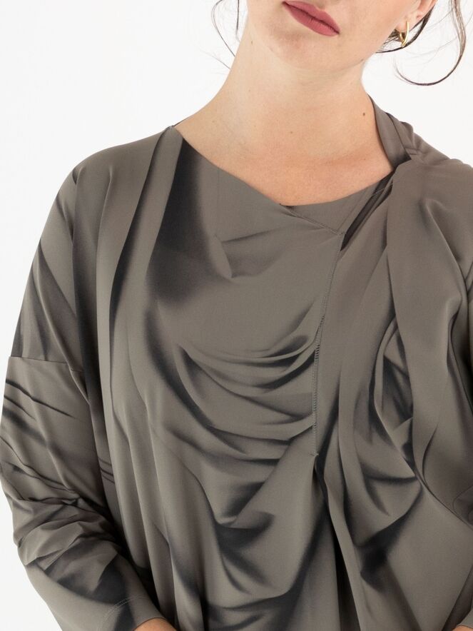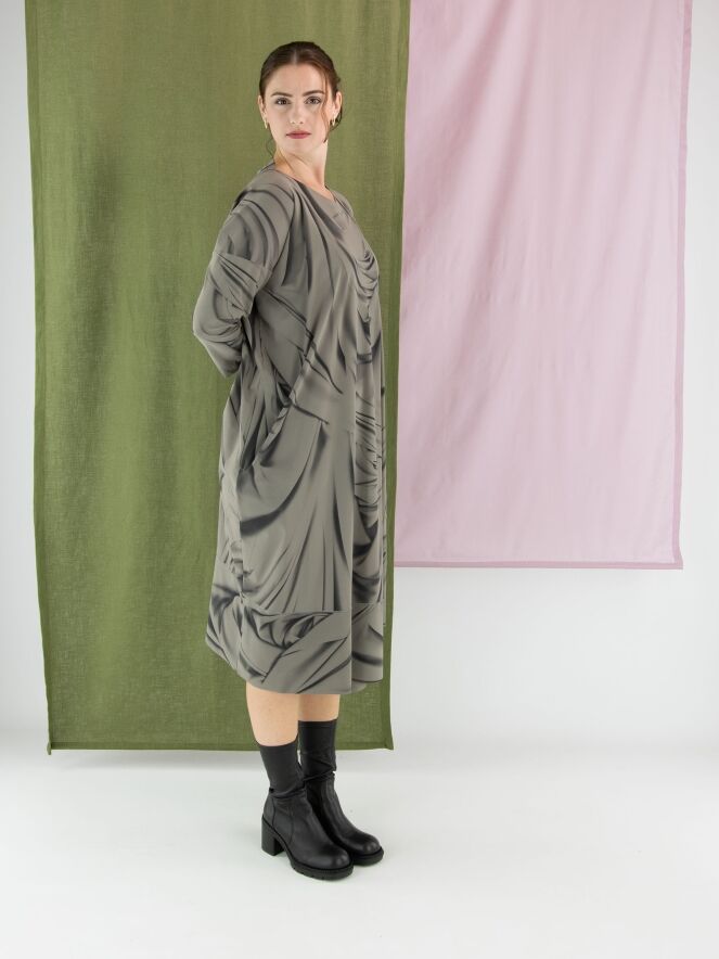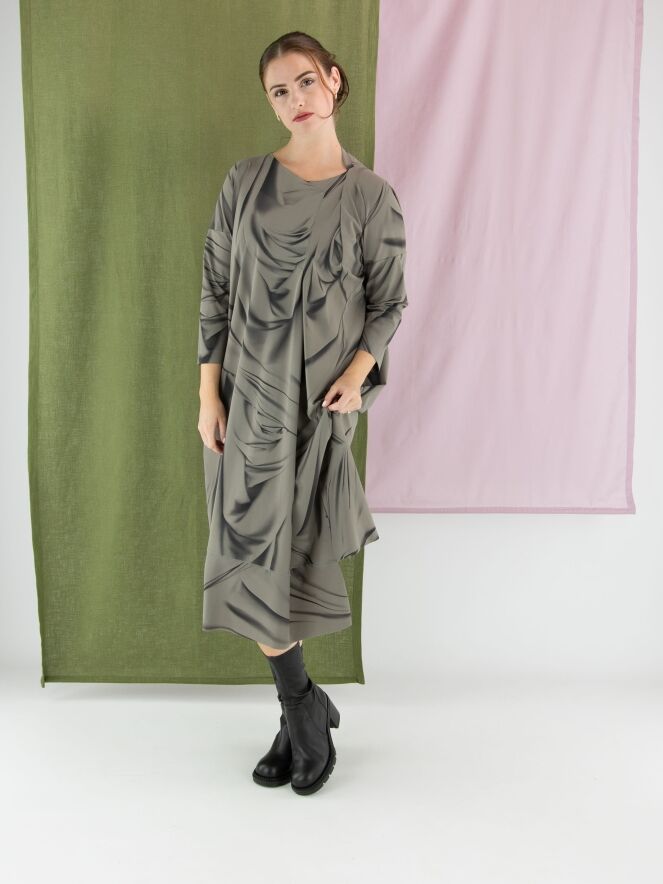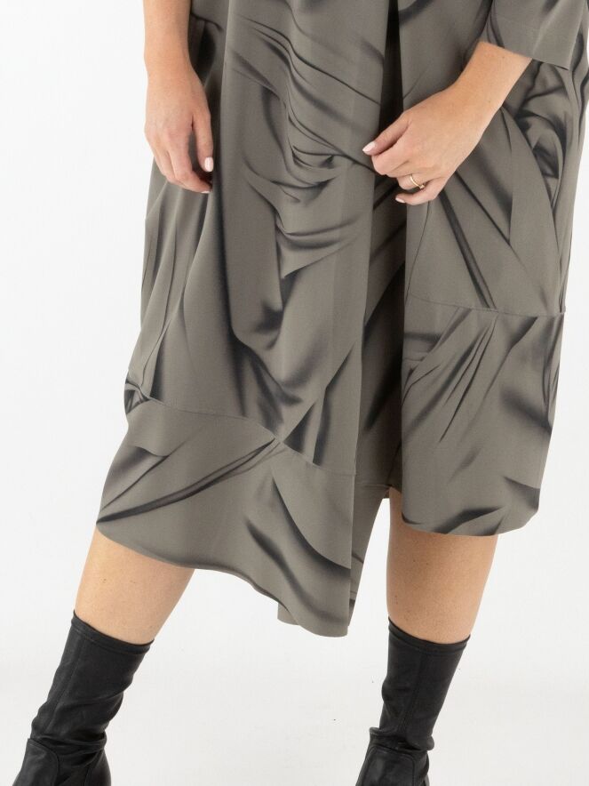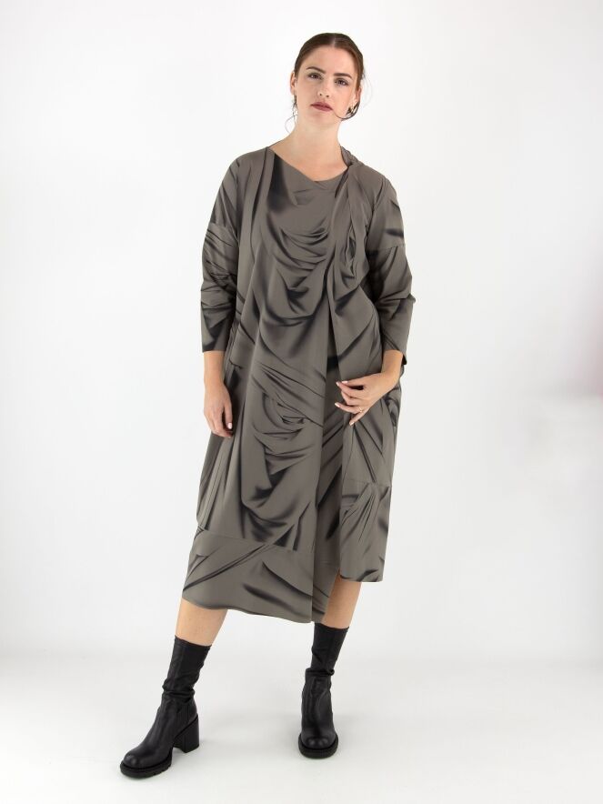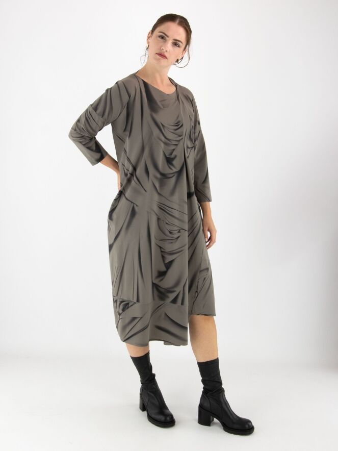 Kleid von High mit einem grafischen Wischprint in Schwarz und Taupe. Der Rand des asymmetrischen Ausschnitts ist mit einer dekorativen Überlappung versehen. Auf Taillenhöhe befindet sich auf der rechten Seite eine Eingrifftasche. Das Kleid hat halblange Ärmel und kann bei 30 Grad gewaschen werden.
