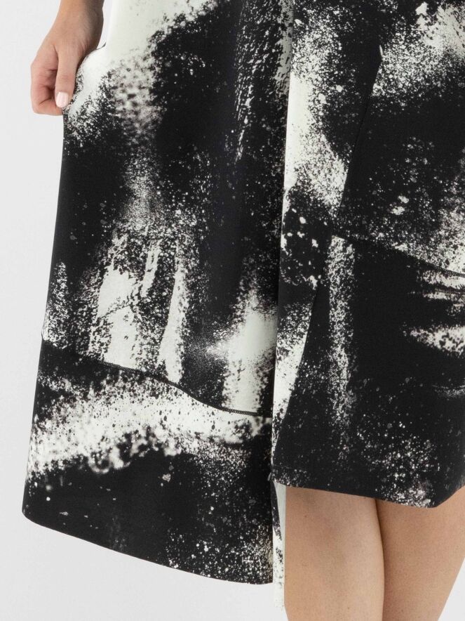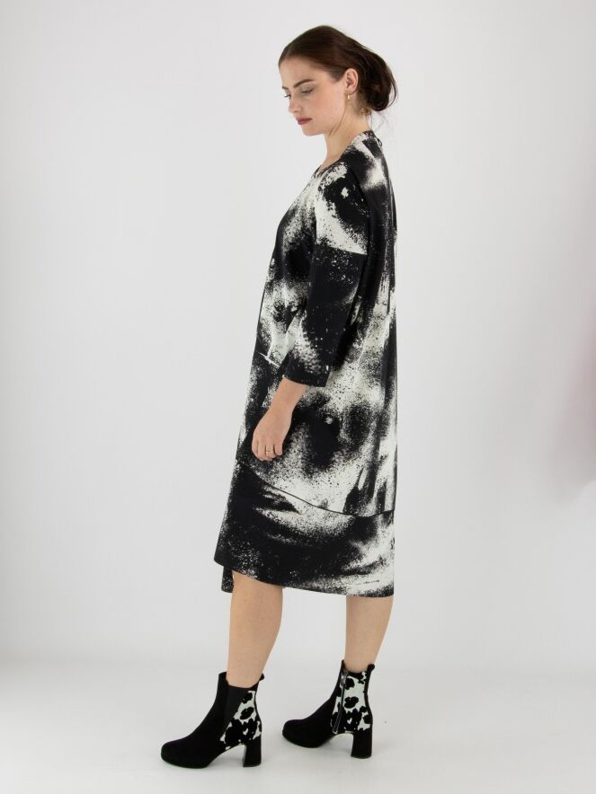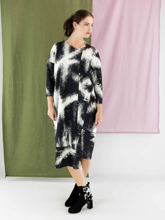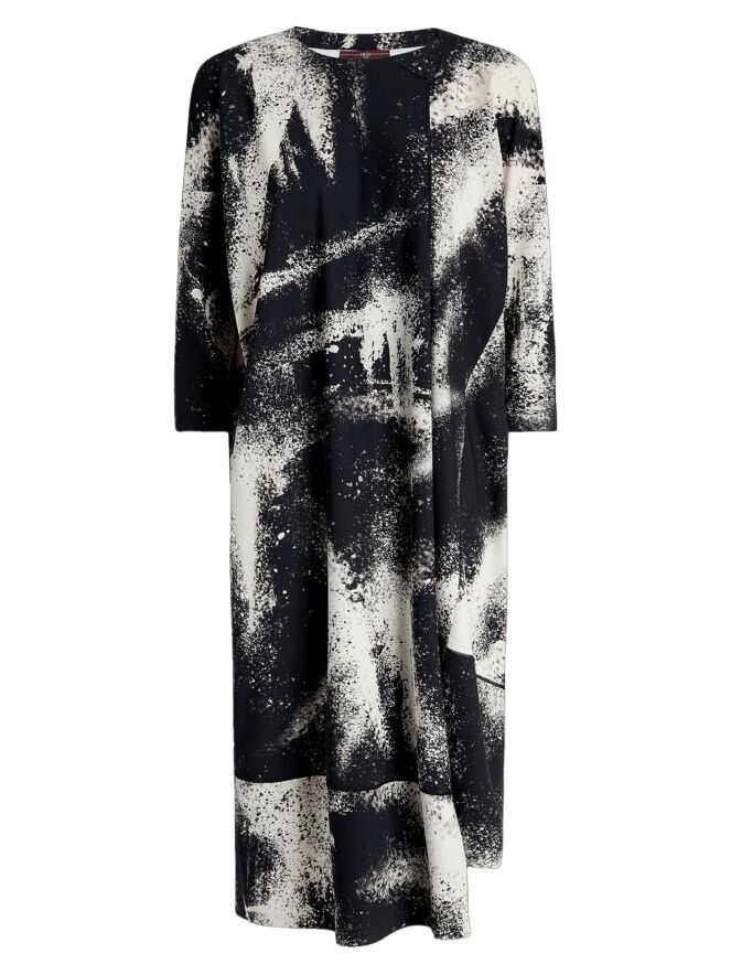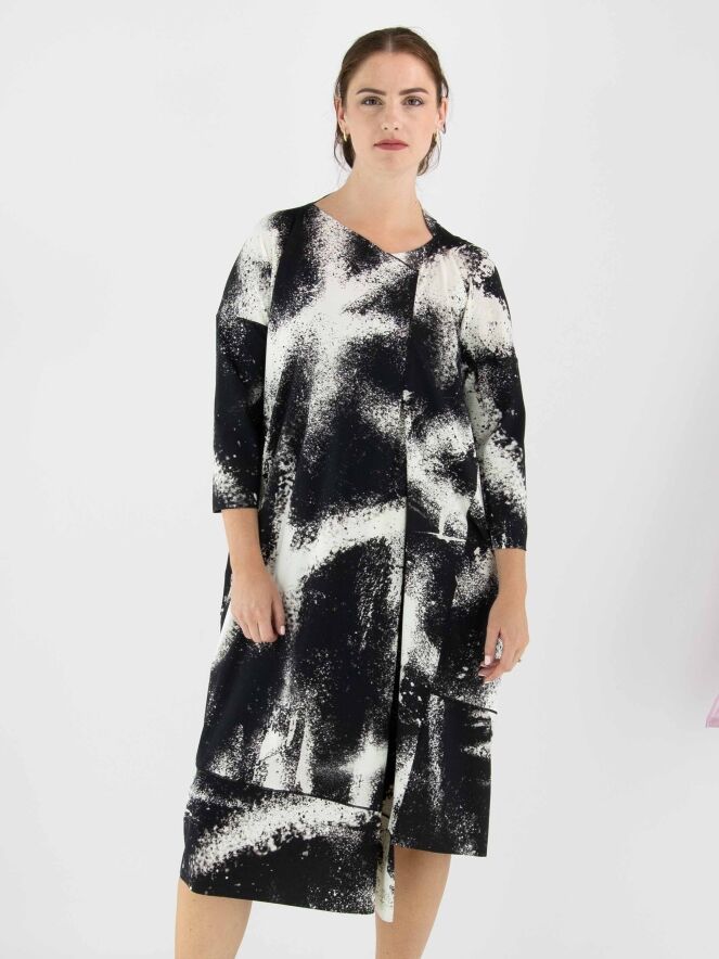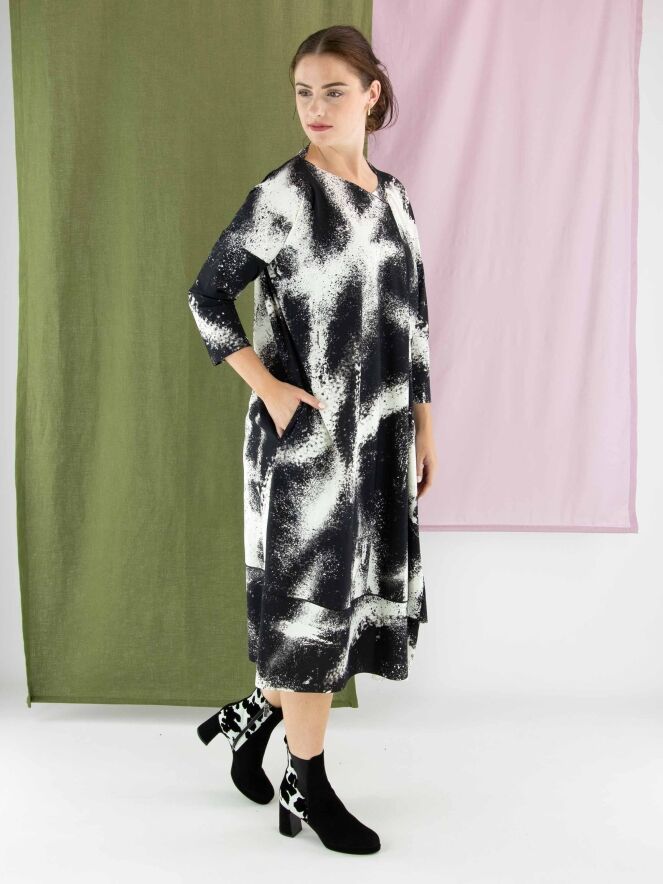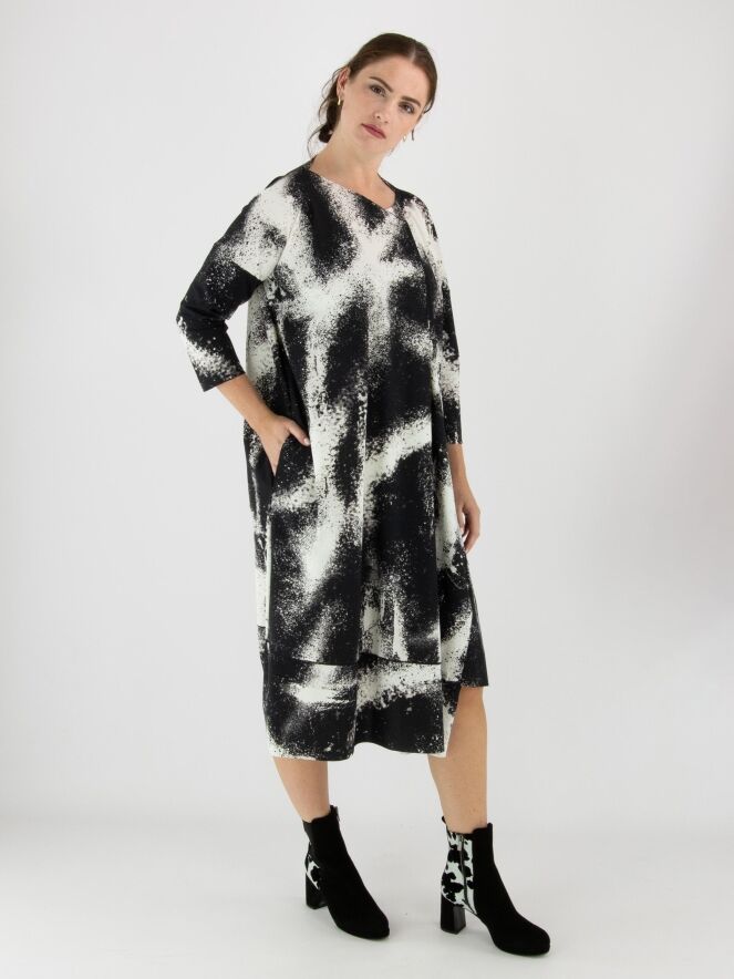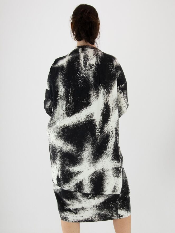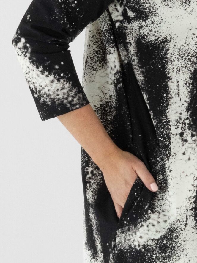 Kleid von High mit grafischem Print in Schwarz und Cremeweiß. Der Rand des asymmetrischen Ausschnitts hat eine dekorative Überlappung. Auf der rechten Seite befindet sich auf Taillenhöhe eine Eingrifftasche. Das Kleid hat halblange Ärmel und darf bei 30 Grad gewaschen werden.