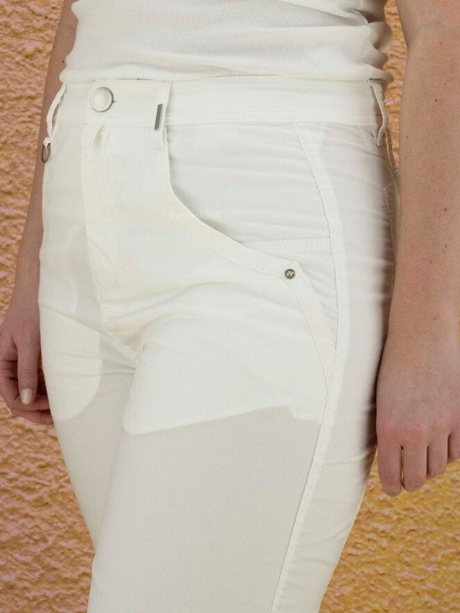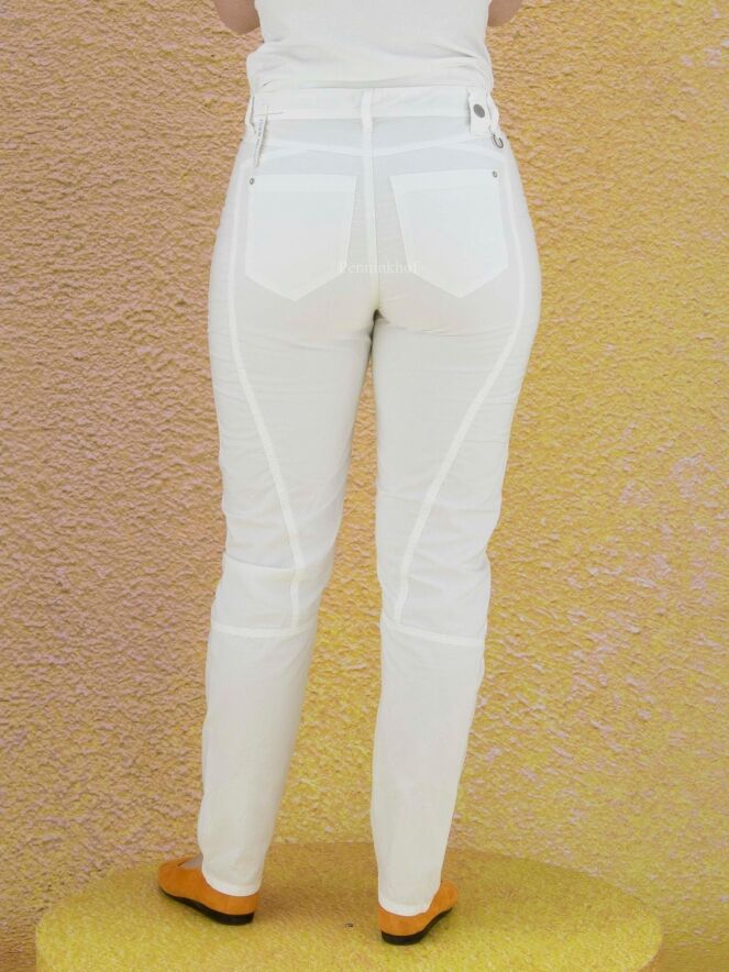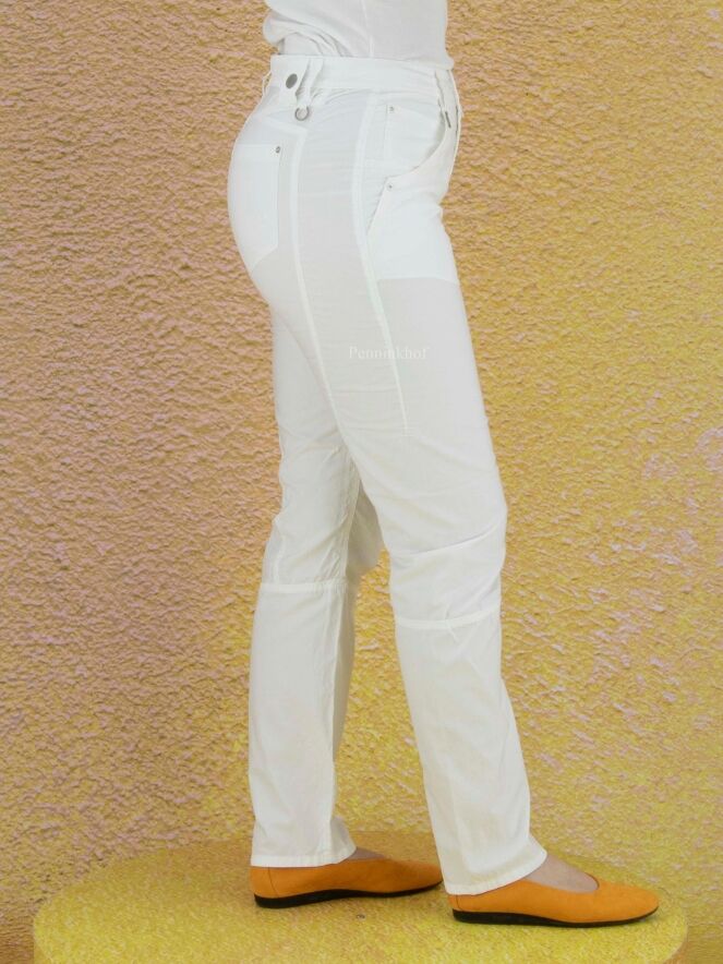 Eine weiße Hose der Designermarke High in weicher Baumwollqualität. Die Ränder der abgerundeten Taschen sind breit eingefasst. Unterhalb des Knies befindet sich eine horizontale Naht. Diese Hose kann bei 30 Grad gewaschen werden.
