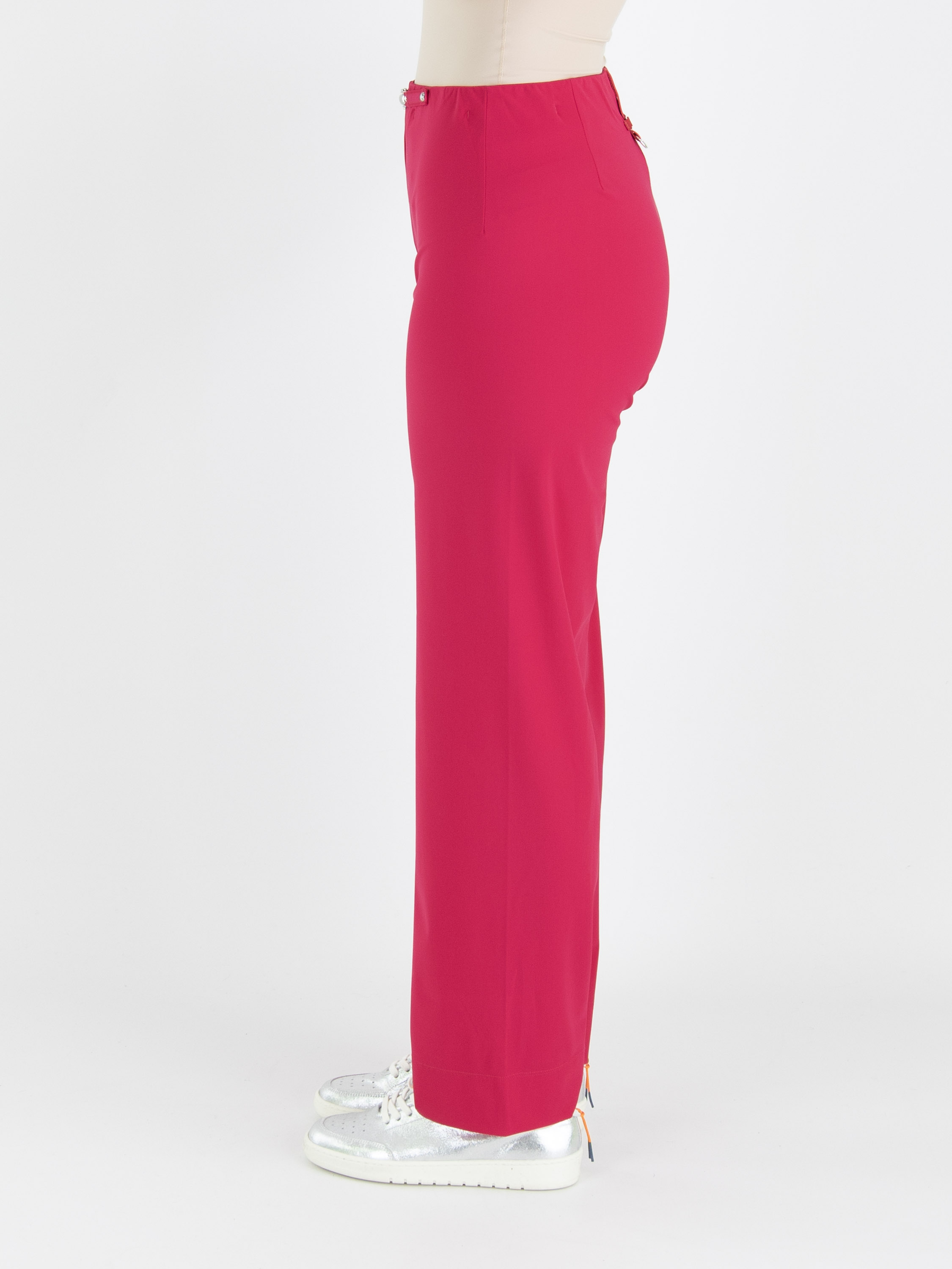 Eine Hose von High in Fuchsia. In der Taille befindet sich ein elastisches Band. Auf der Vorderseite, auf Höhe der Taille, befindet sich eine dekorative Schnalle in Nickel-Farbe mit 2 Nieten. Diese Hose kann bei 30 Grad gewaschen werden.