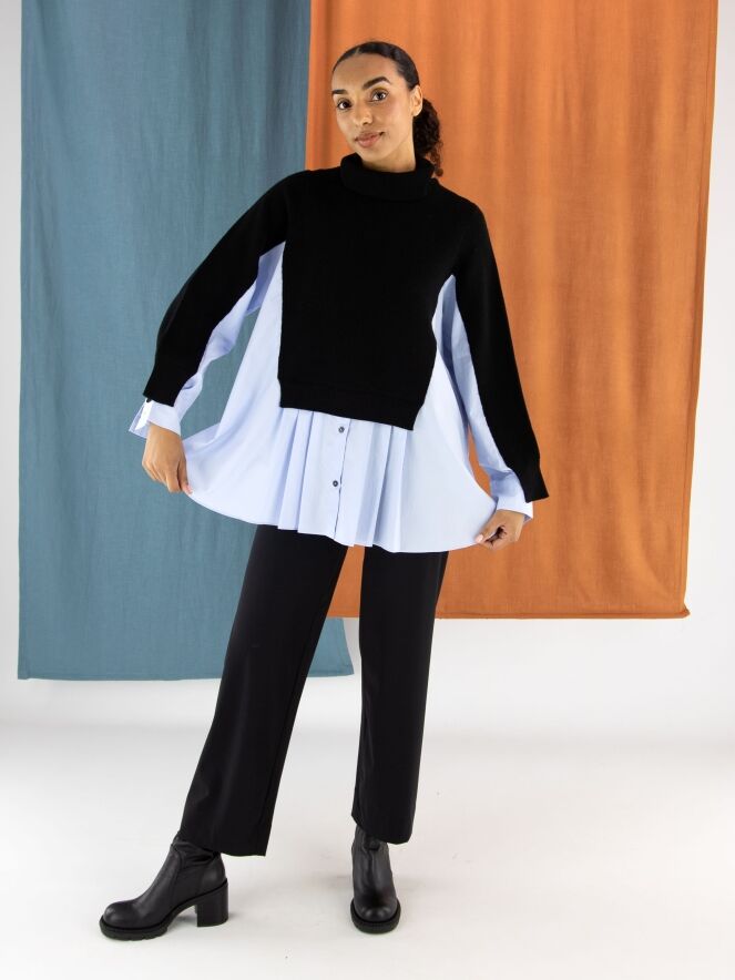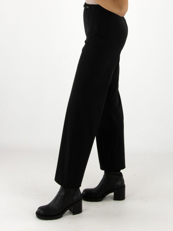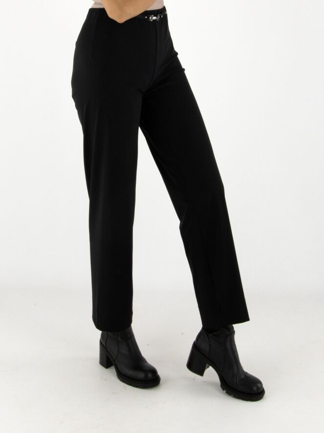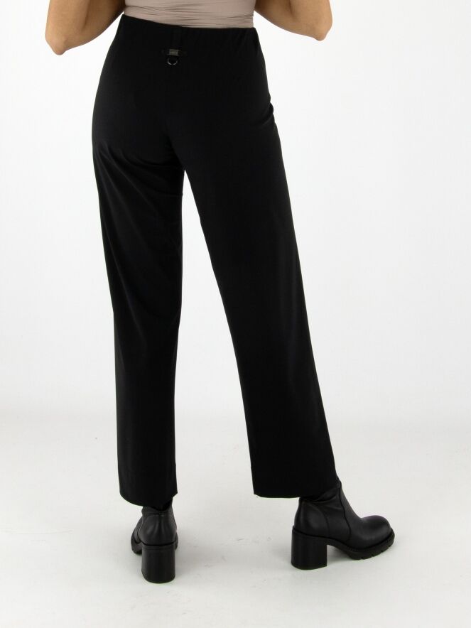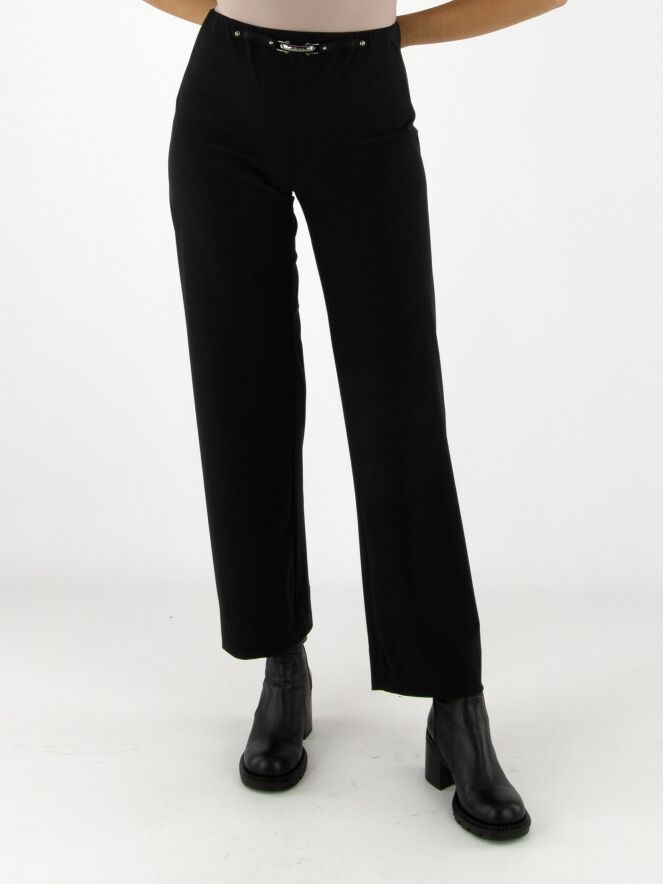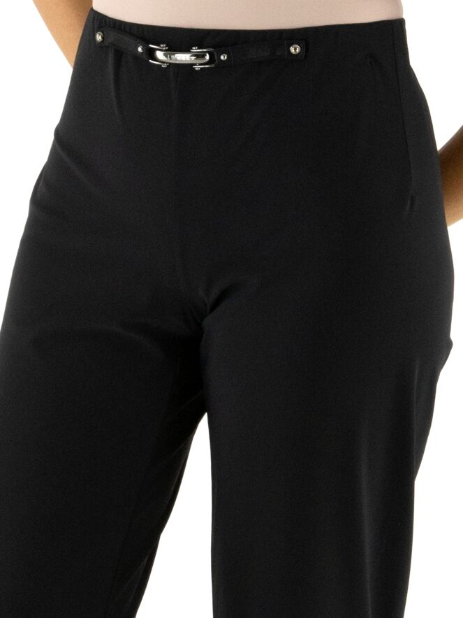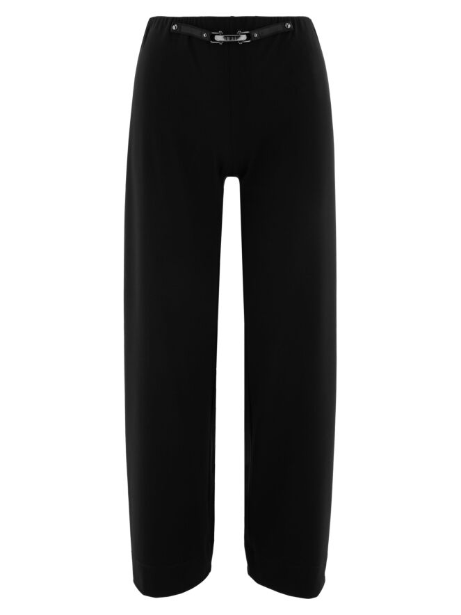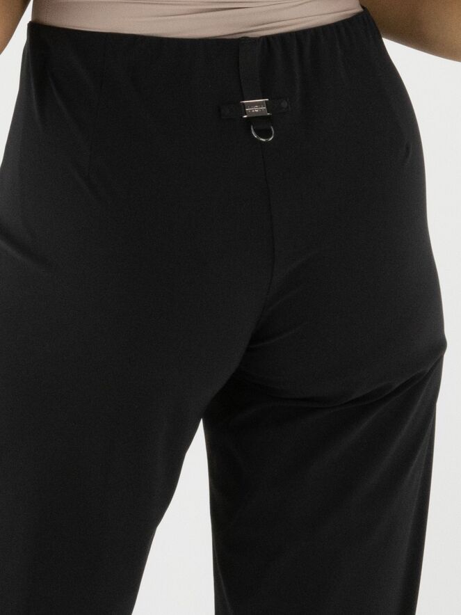 Eine Hose von High in der Farbe Schwarz. Der Bund ist elastisch. Vorne auf Taillenhöhe befindet sich eine dekorative nickelfarbene Schnalle mit zwei Nieten. Diese Hose kann bei 30 Grad gewaschen werden.