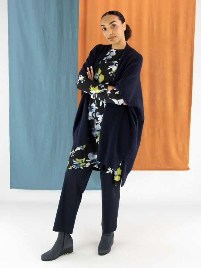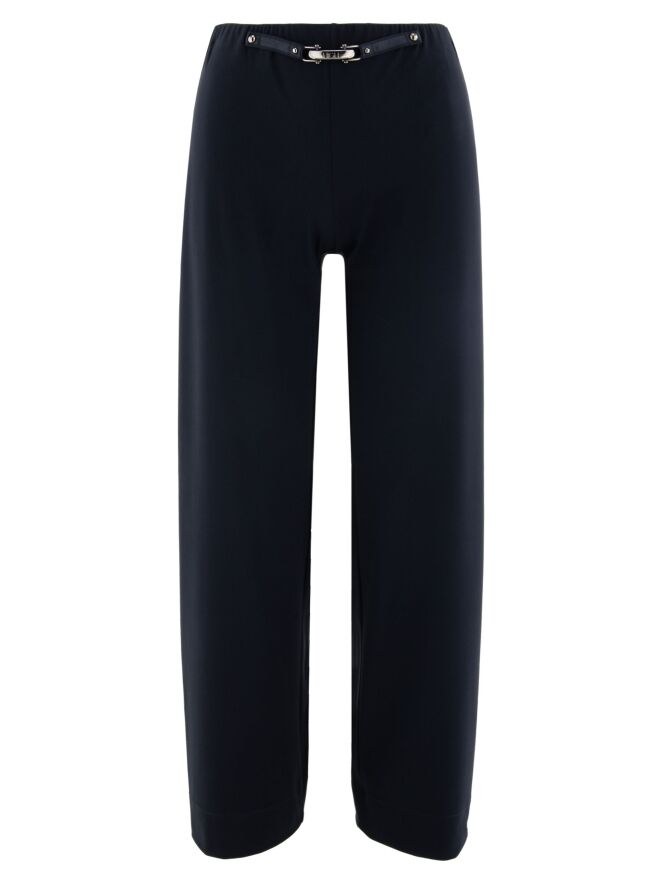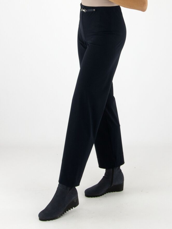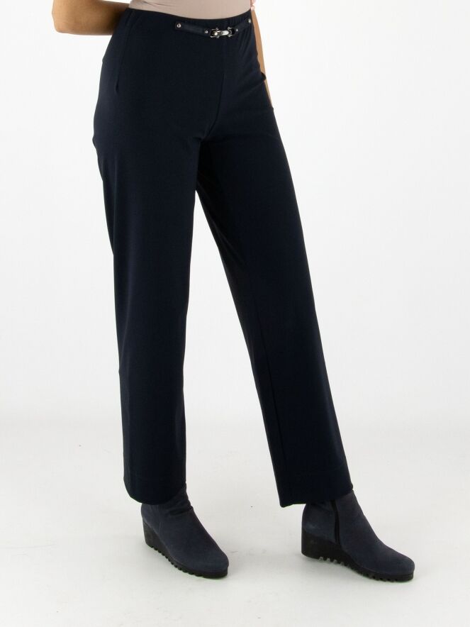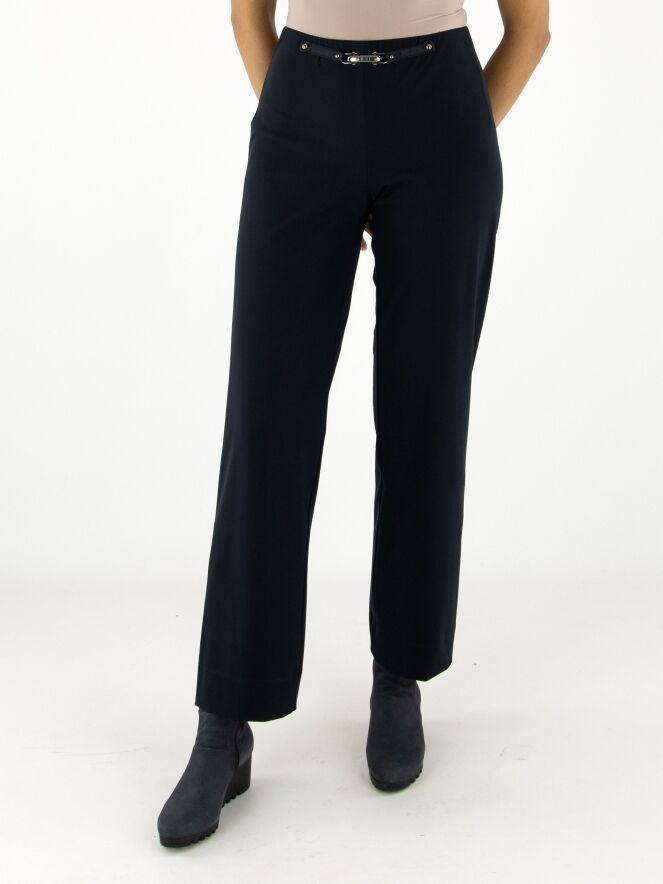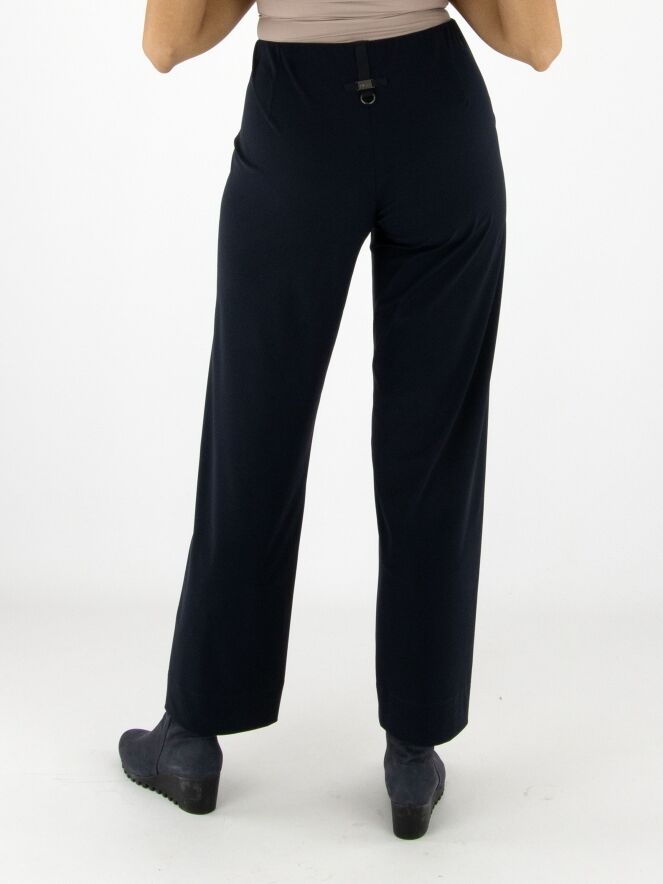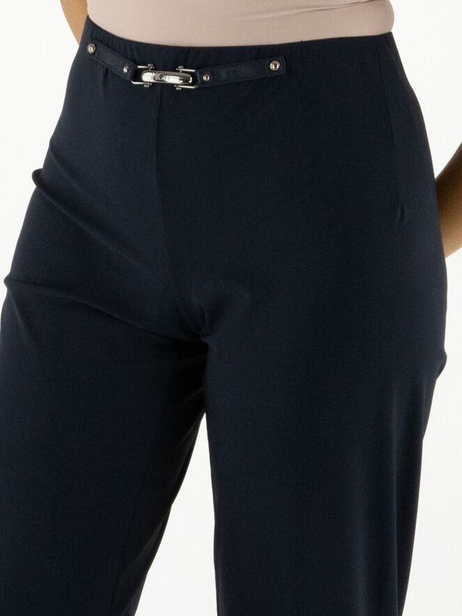 Hose von High in Marineblau. Der Bund ist elastisch. Vorne auf Taillenhöhe befindet sich eine dekorative nickelfarbene Schnalle mit zwei Ziernieten. Diese Hose kann bei 30 Grad gewaschen werden.