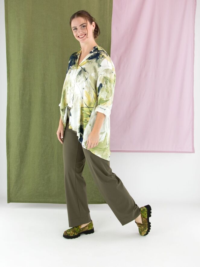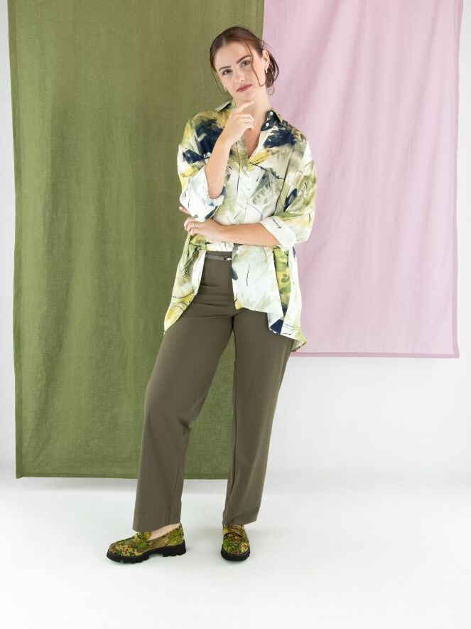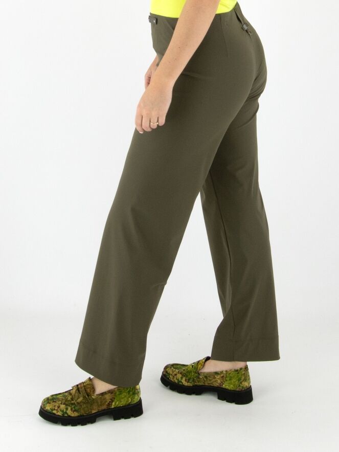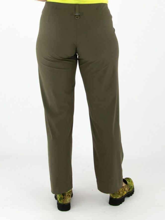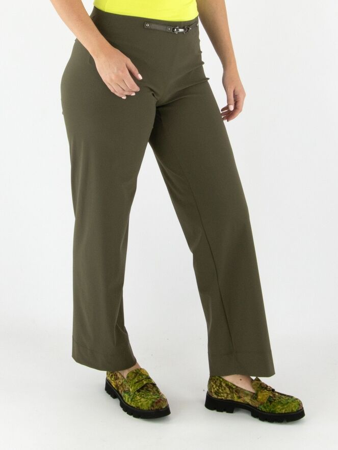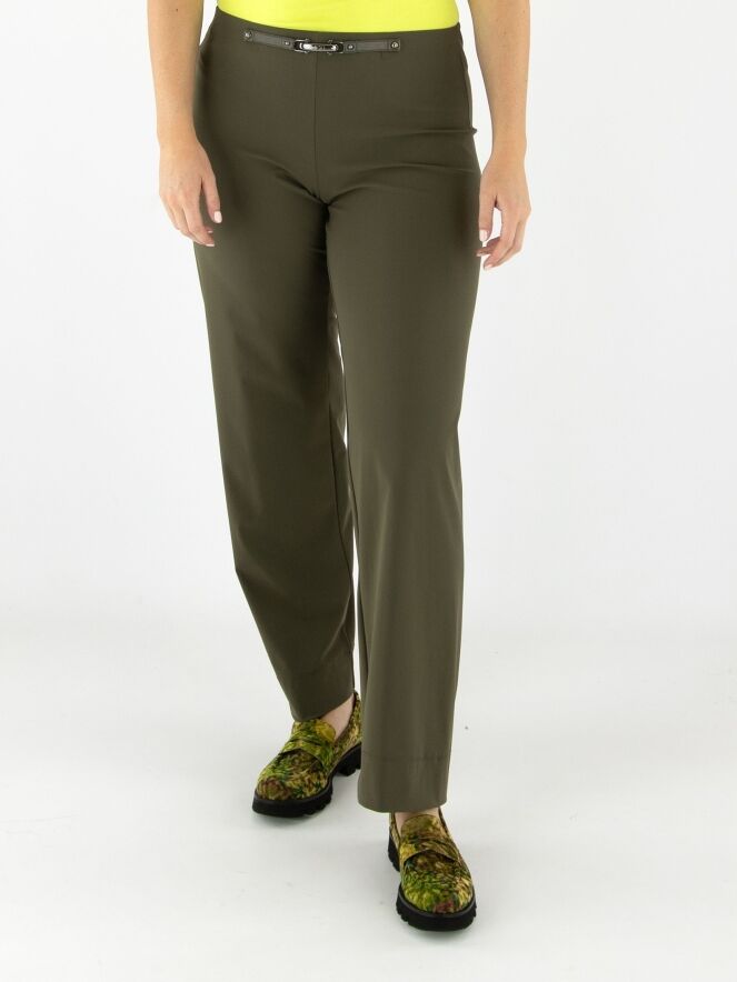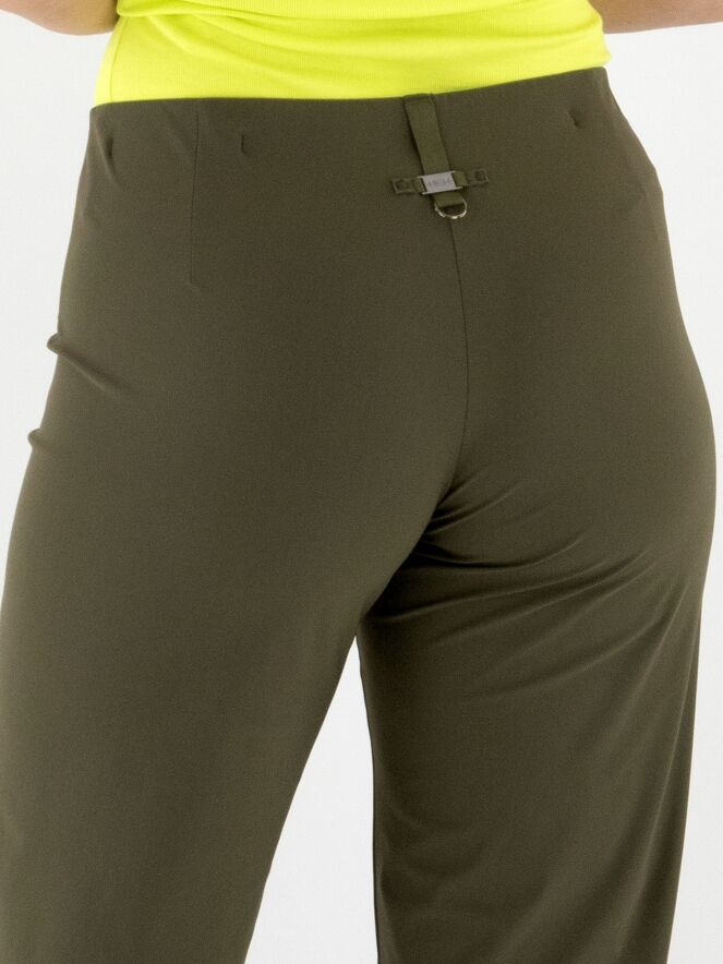 Hose von High in Olivgrün. Der Bund ist elastisch. Vorne auf Taillenhöhe befindet sich eine dekorative Schnalle in Nickelfarbe mit zwei Nieten. Diese Hose kann bei 30 Grad gewaschen werden.
