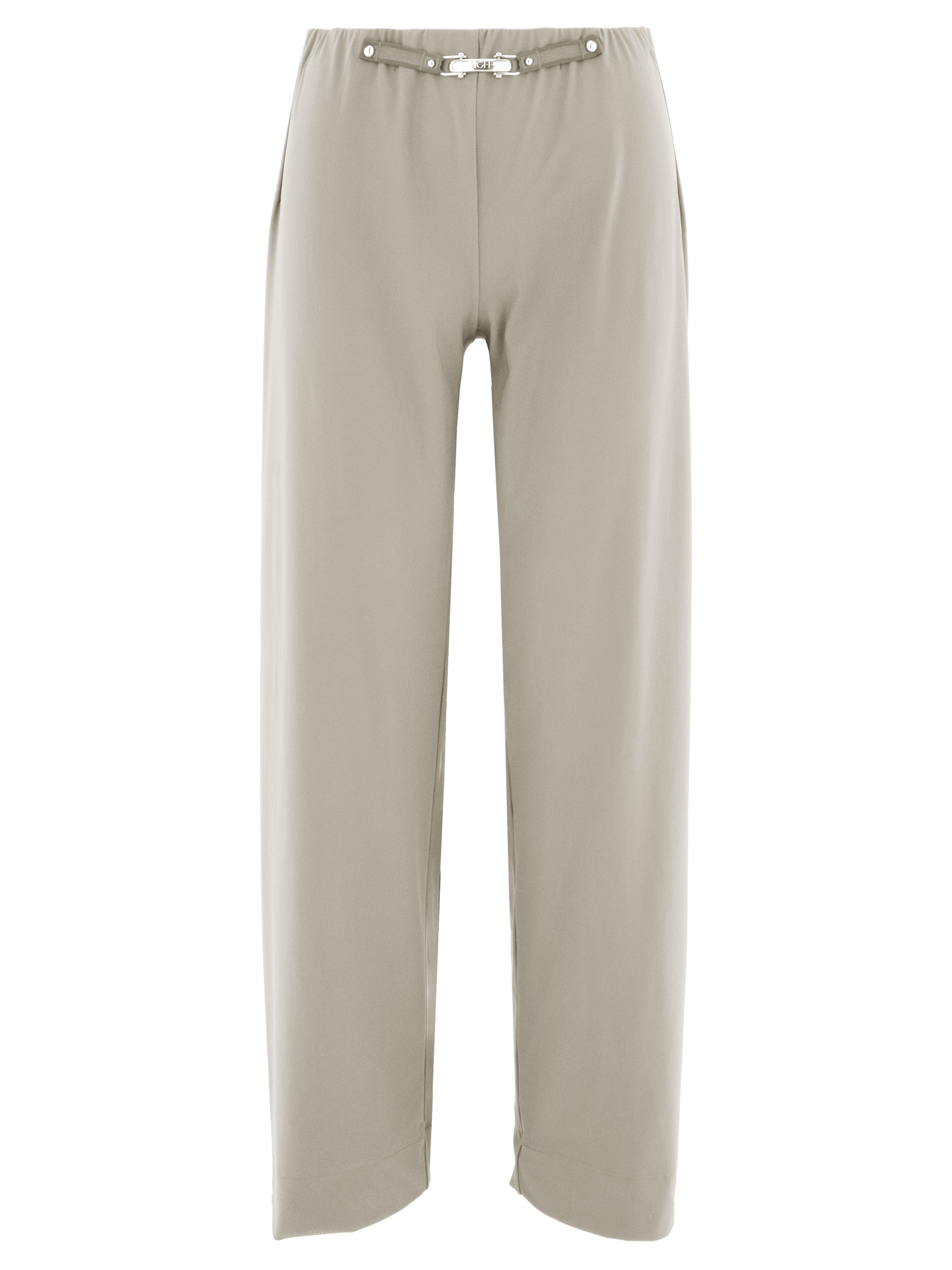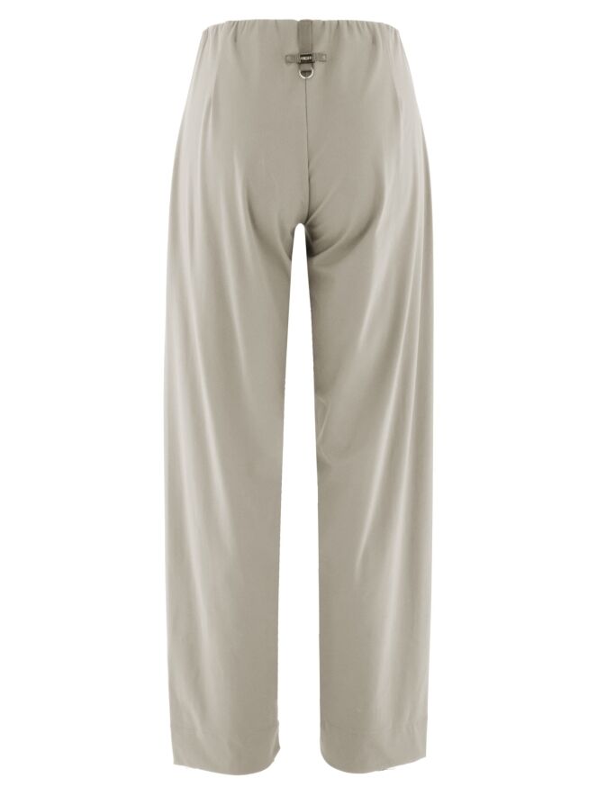 Eine Hose von High in der Farbe Kit. Der Bund ist mit einem elastischen Einsatz und einem dekorativen, länglichen silberfarbenen Metallelement auf der Vorderseite gearbeitet. Die Hosenbeine sind gerade geschnitten und die Hose kann bei 30 Grad gewaschen werden.