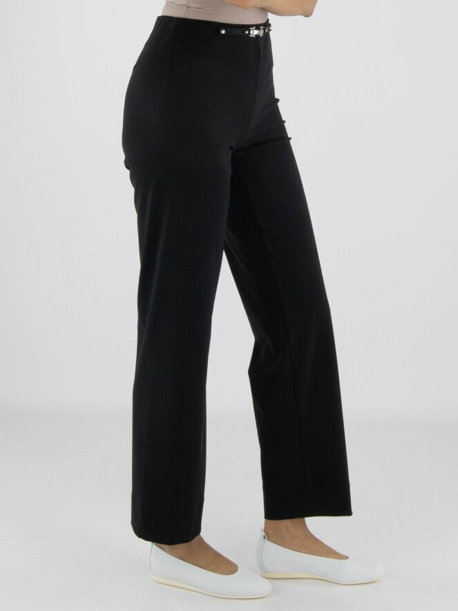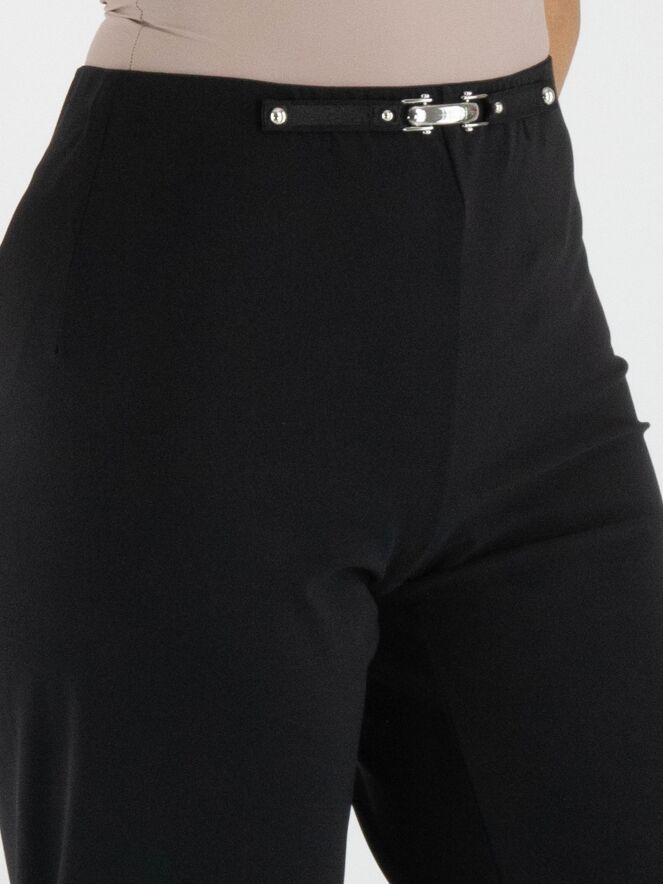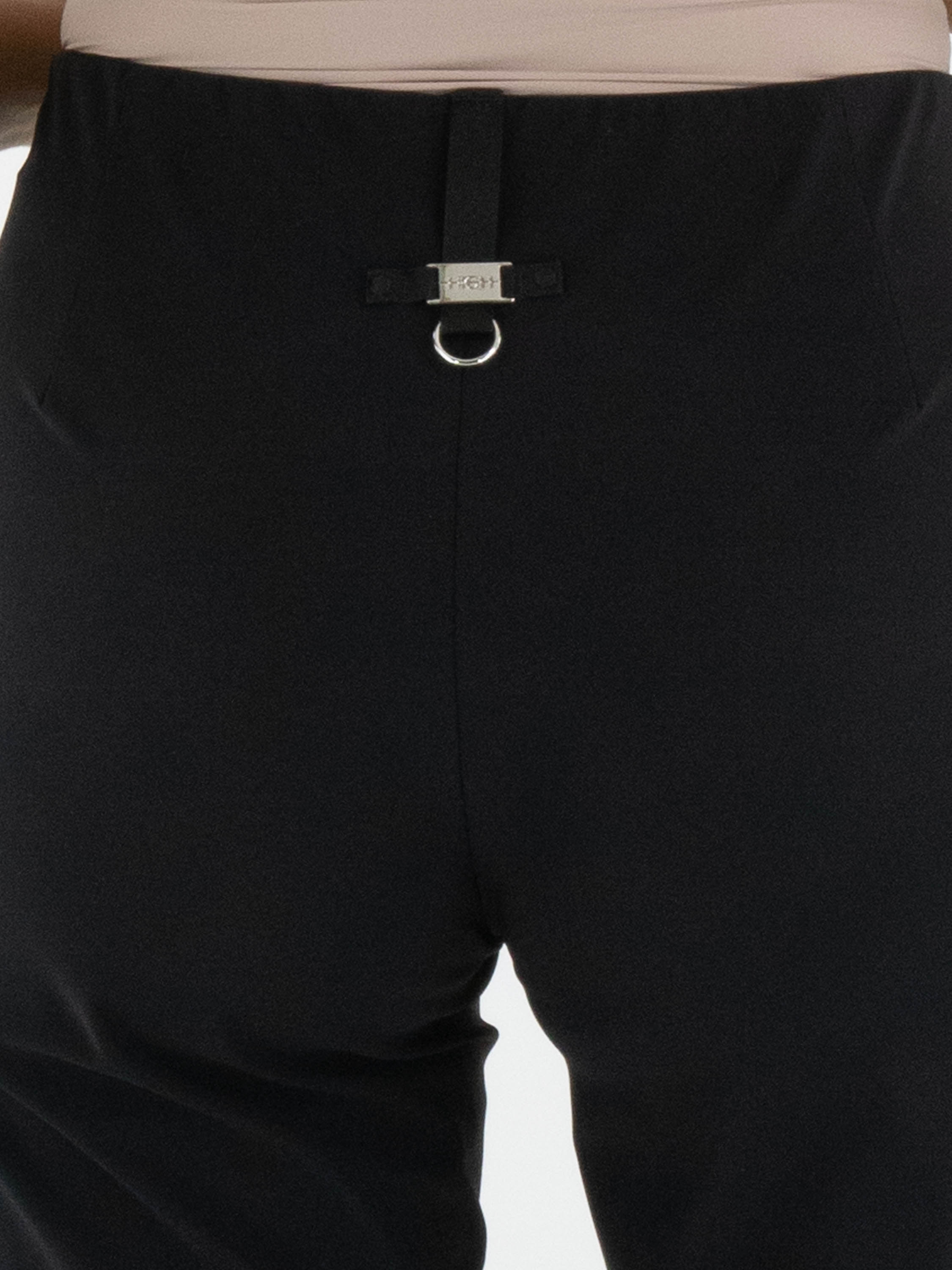 Hose von High in Schwarz. Der elastische Bund ist vorne mit einem dekorativen, silberfarbenen länglichen Zierelement versehen, das einen eleganten Akzent setzt. Die gerade geschnittenen Hosenbeine sorgen für eine zeitlose, stilvolle Silhouette. Diese exklusive Designerhose kann bei 30 Grad gewaschen werden.