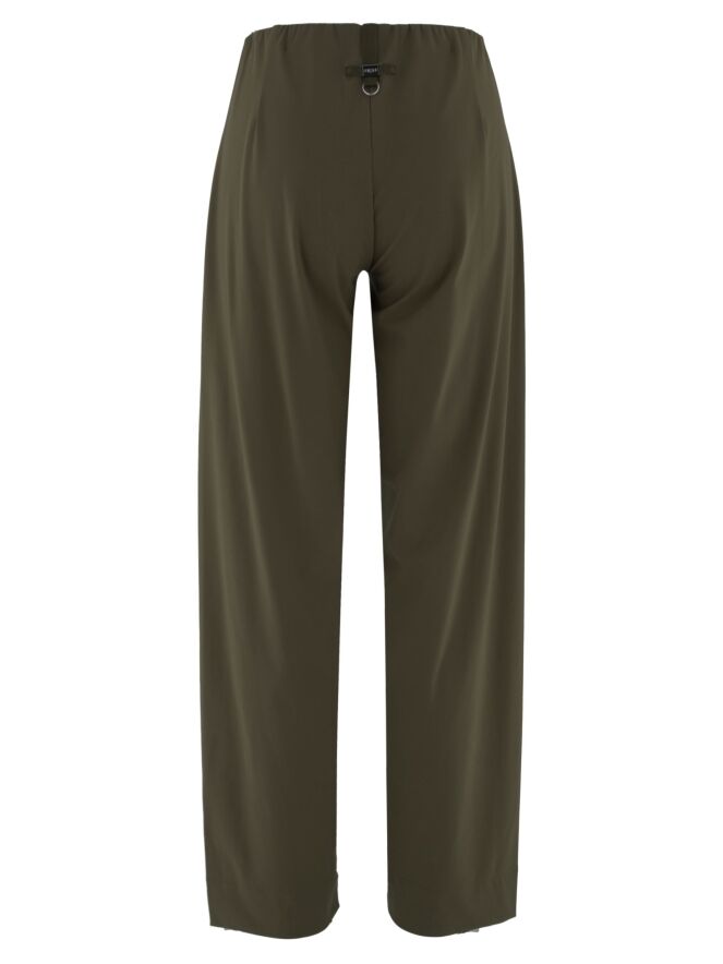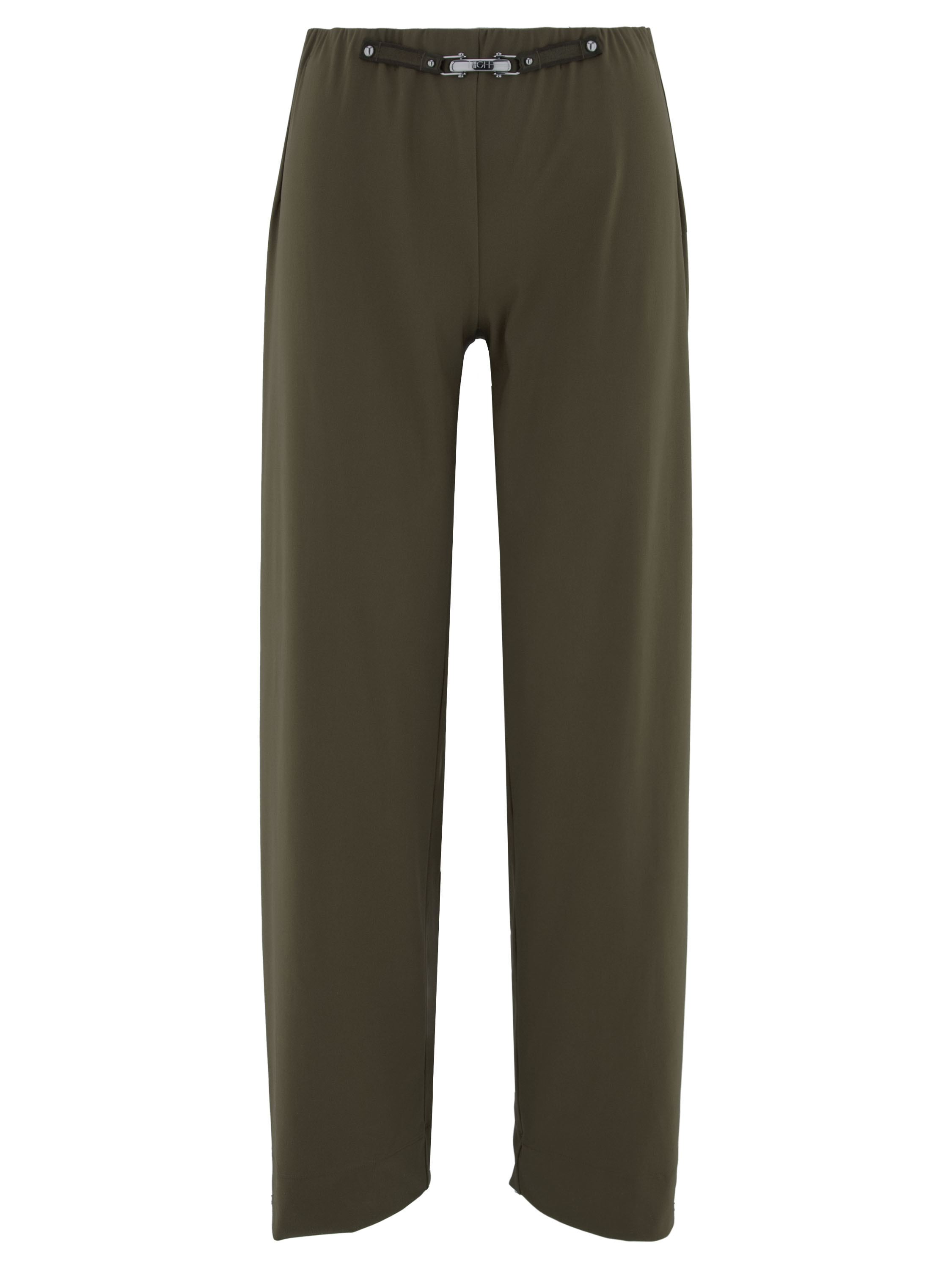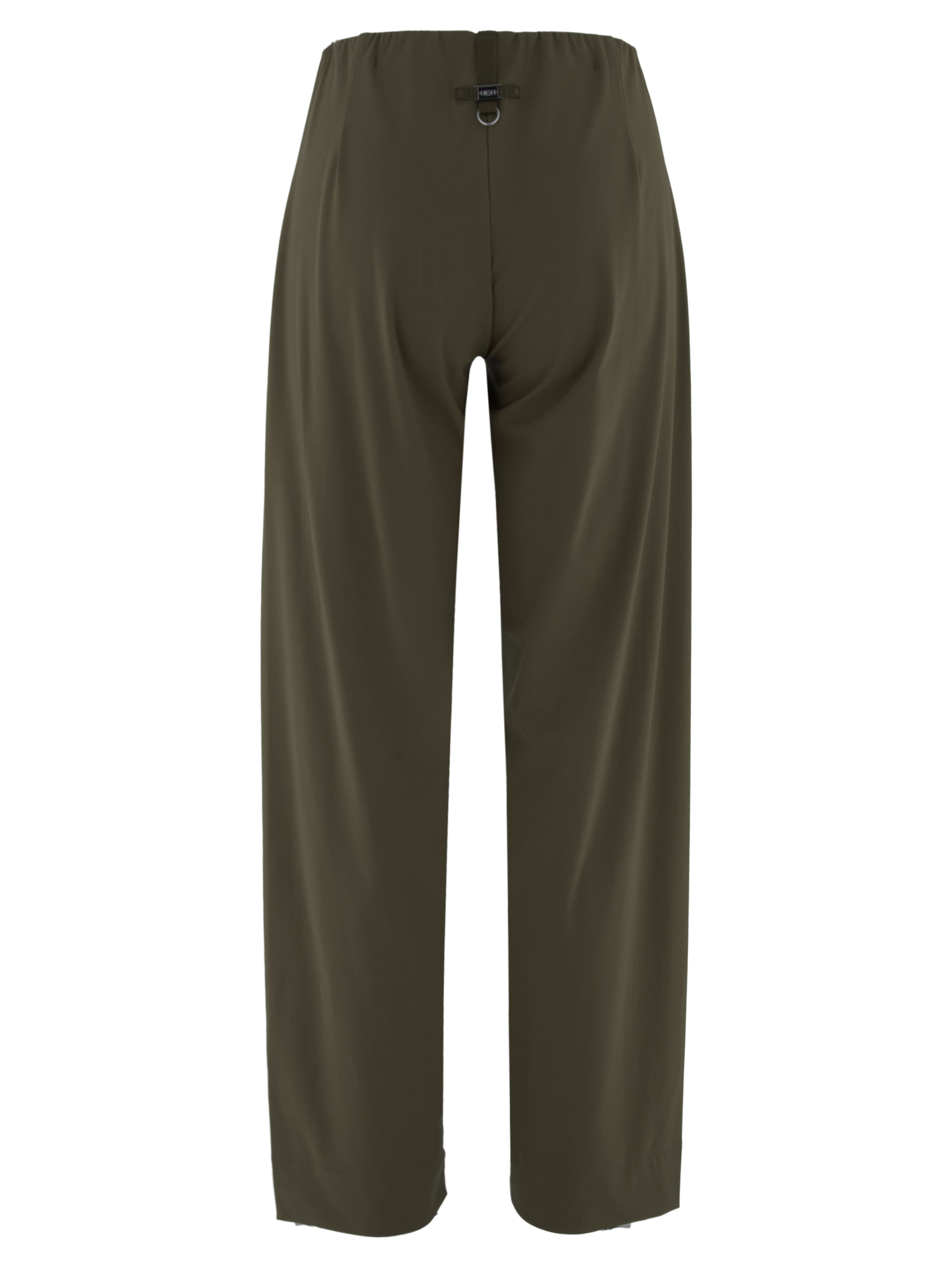 Eine Hose von High in Olivgrün. Der Bund ist mit einem elastischen Einsatz und vorne mit einem dekorativen länglichen silberfarbenen Metallelement versehen. Die Hosenbeine sind gerade geschnitten und die Hose kann bei 30 Grad gewaschen werden.