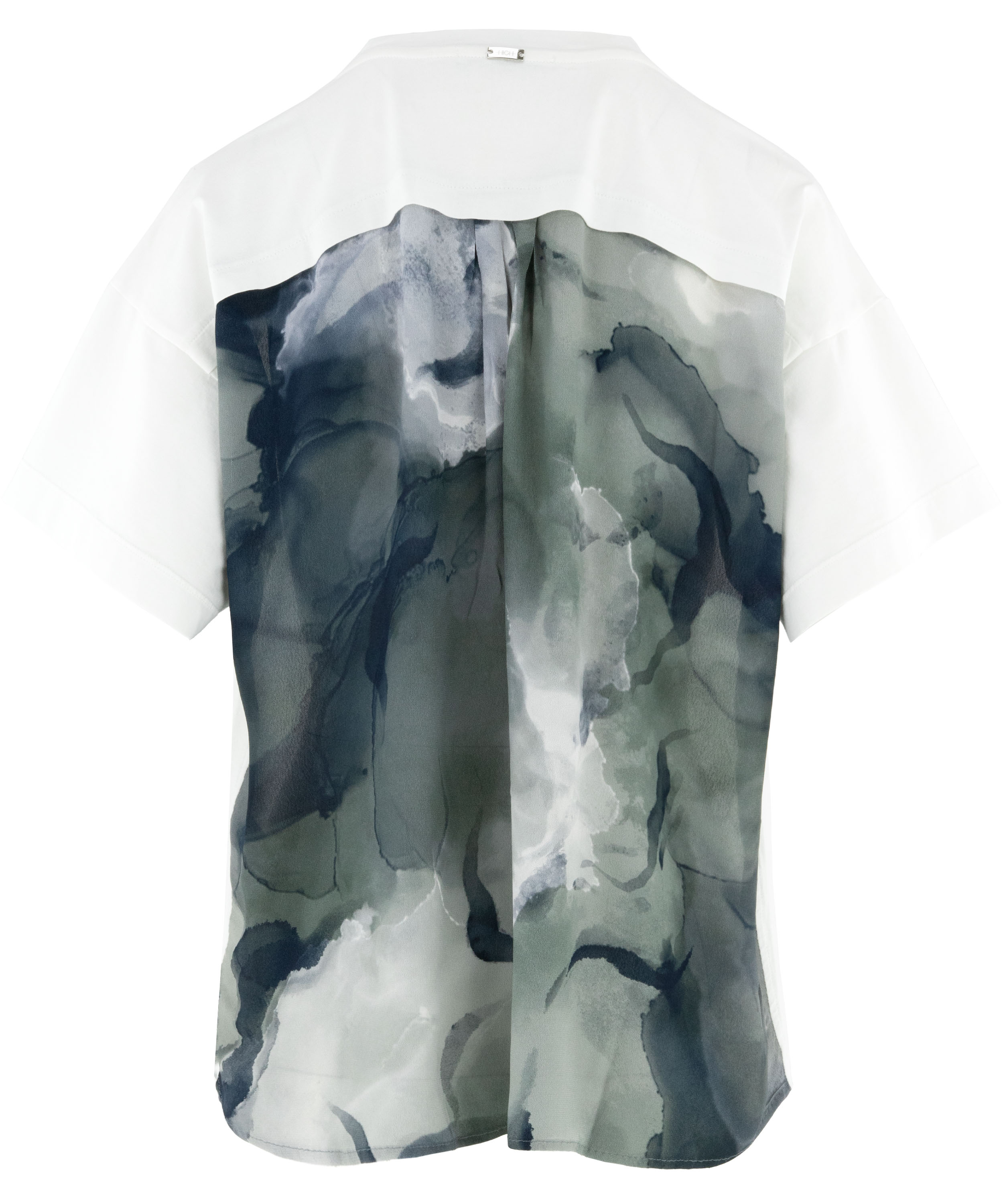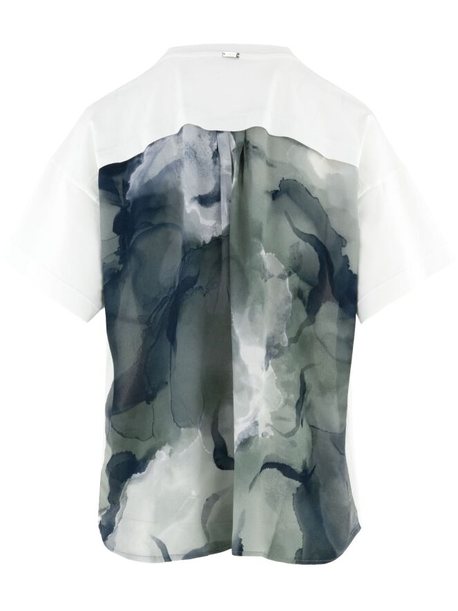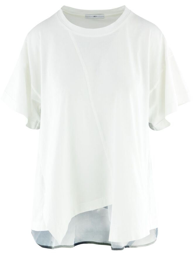 Ein Shirt von High in Cremeweiß. Auf der Rückseite ist der Stoff leicht transparent und mit einem grafischen Print in mehreren Grautönen versehen. Auf der Vorderseite verläuft eine diagonale dekorative Naht. Dieses Shirt kann von Hand gewaschen werden.