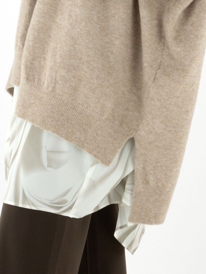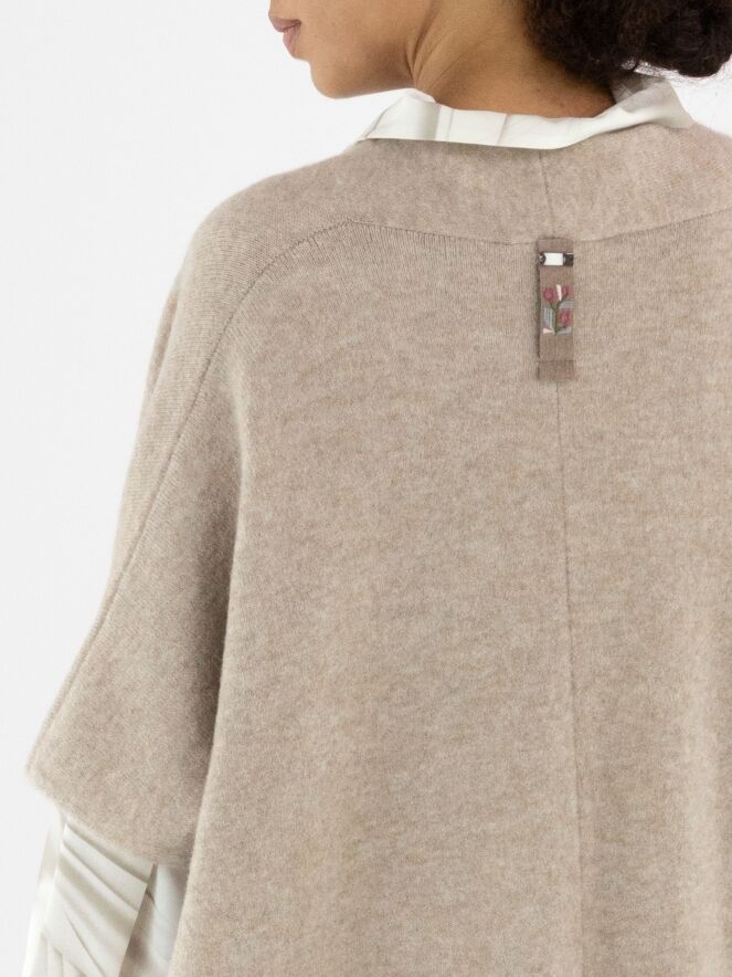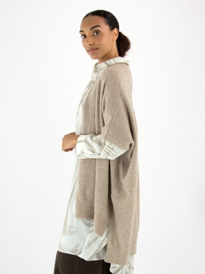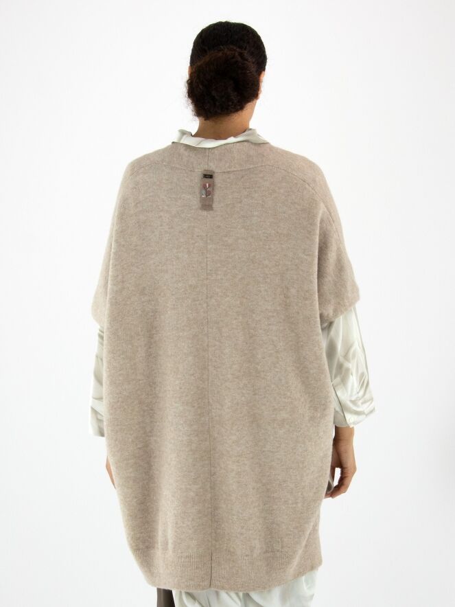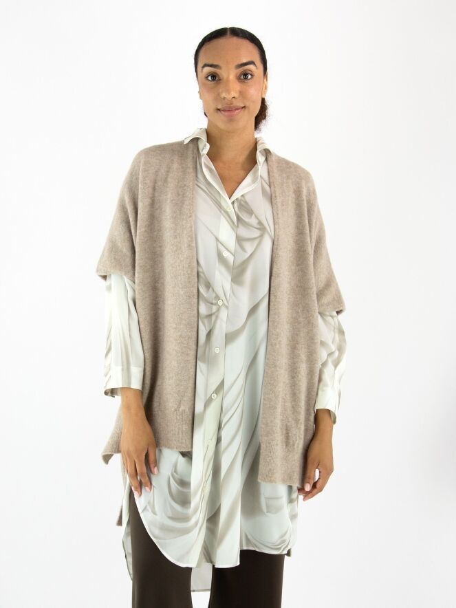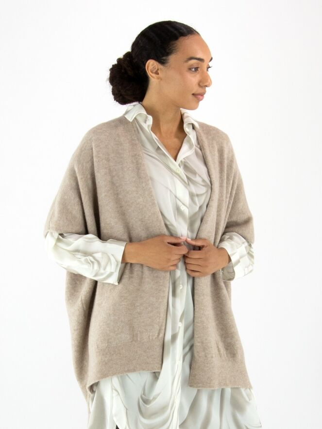 Luxuriöse ärmellose Weste von High in Beige. Die Weste hat keinen Verschluss und sollte von Hand gewaschen werden.