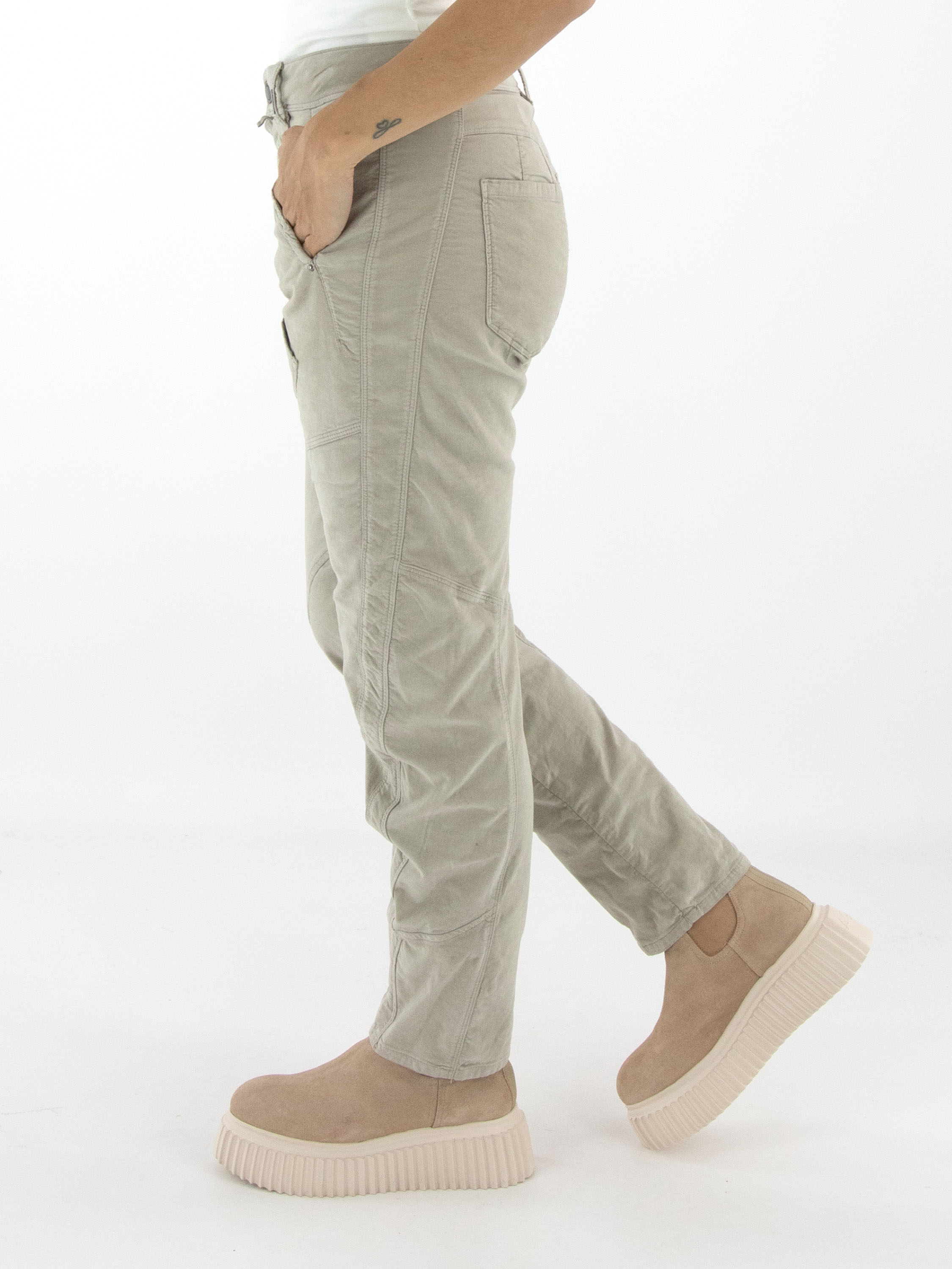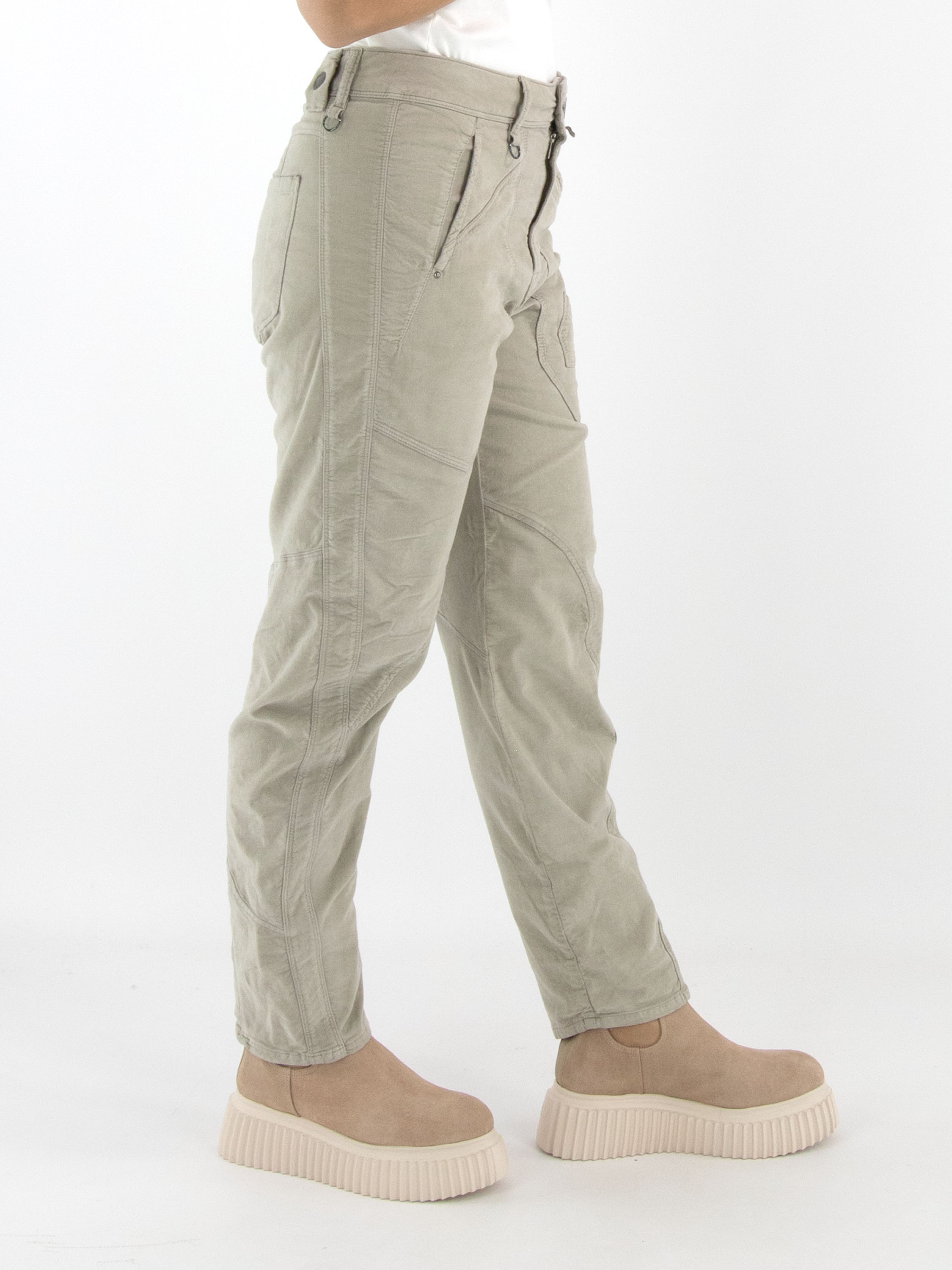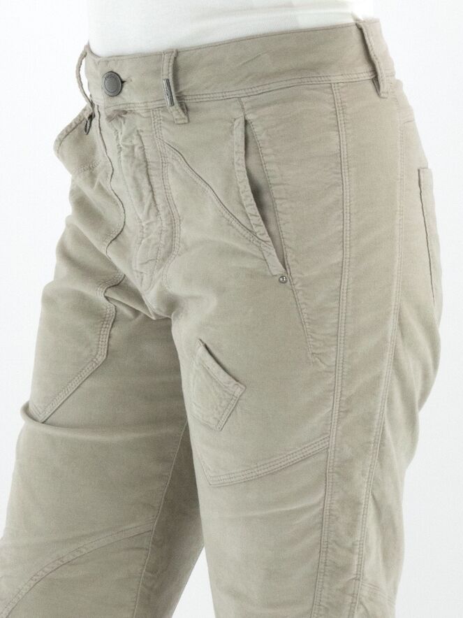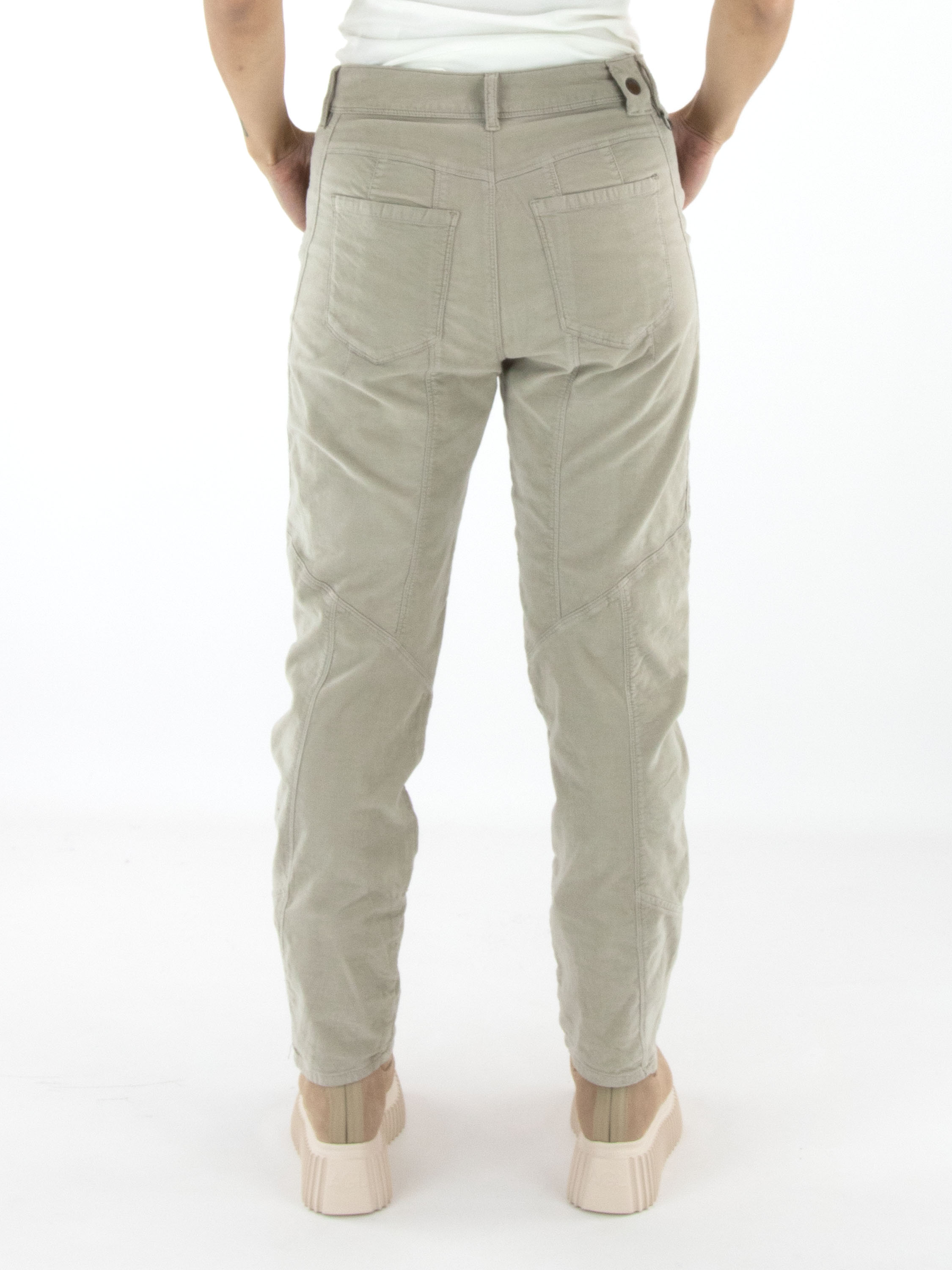Eine Hose von High in weicher Baumwoll-Velours-Qualität in Hellgrau. Die Hose ist mit Eingrifftaschen versehen, wobei auf der linken Tasche ein dekoratives kleines Extrafach eingearbeitet ist. Diese Hose kann bei 30 Grad gewaschen werden.