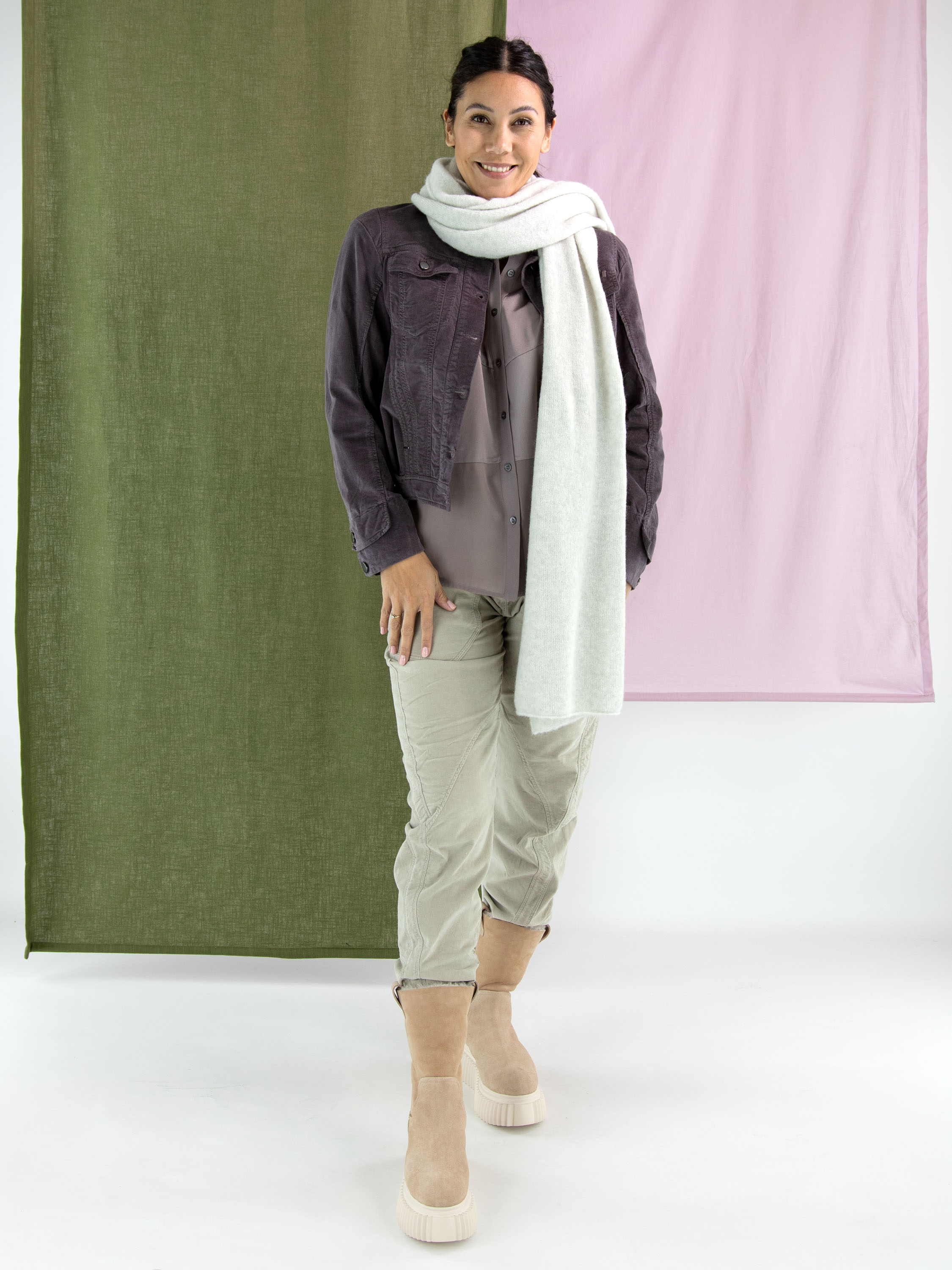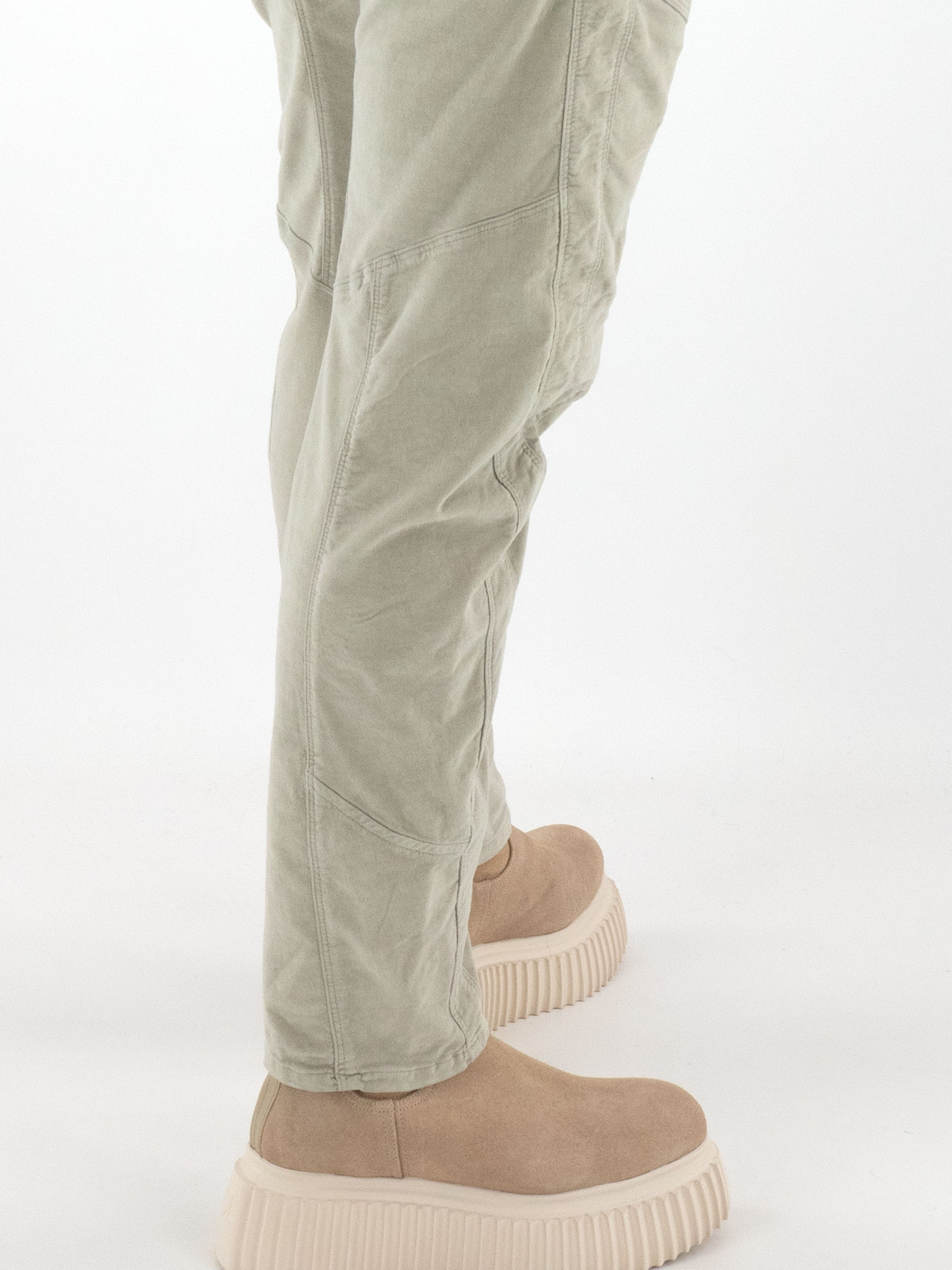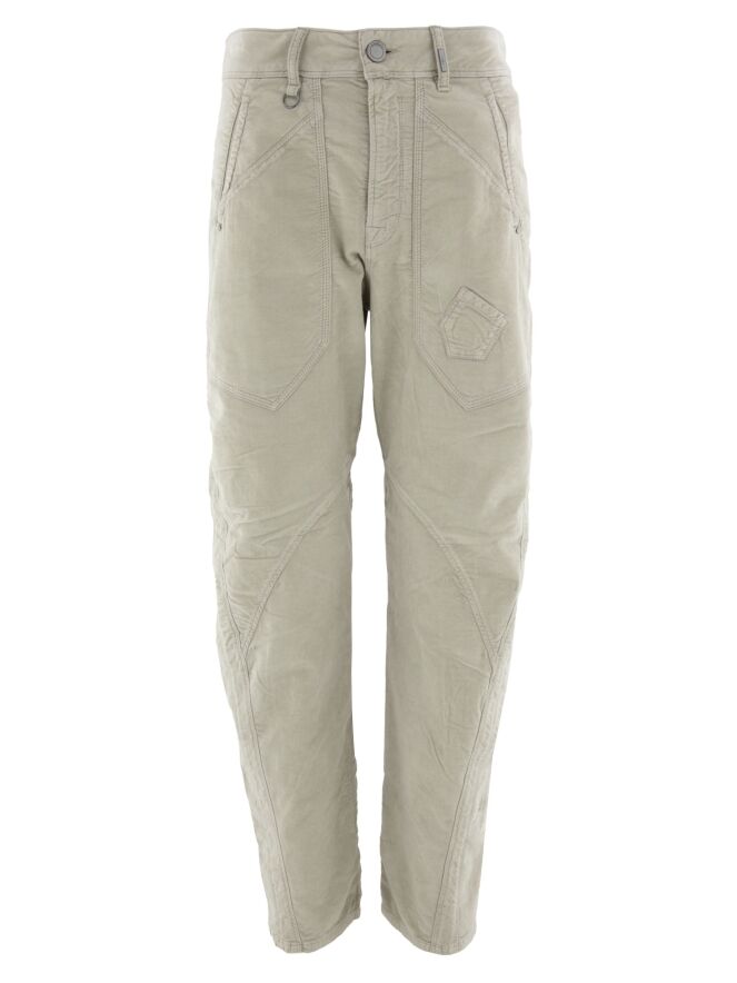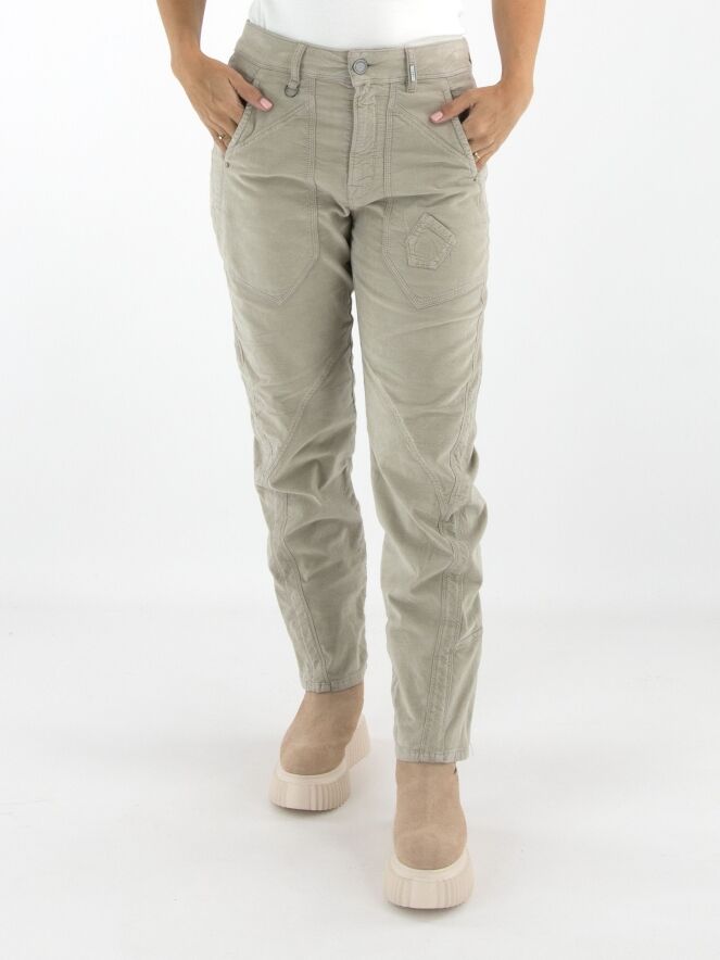 Eine Hose von High in weicher Baumwoll-Velours-Qualität in Hellgrau. Die Hose ist mit Eingrifftaschen versehen, wobei auf der linken Tasche ein dekoratives kleines Extrafach eingearbeitet ist. Diese Hose kann bei 30 Grad gewaschen werden.