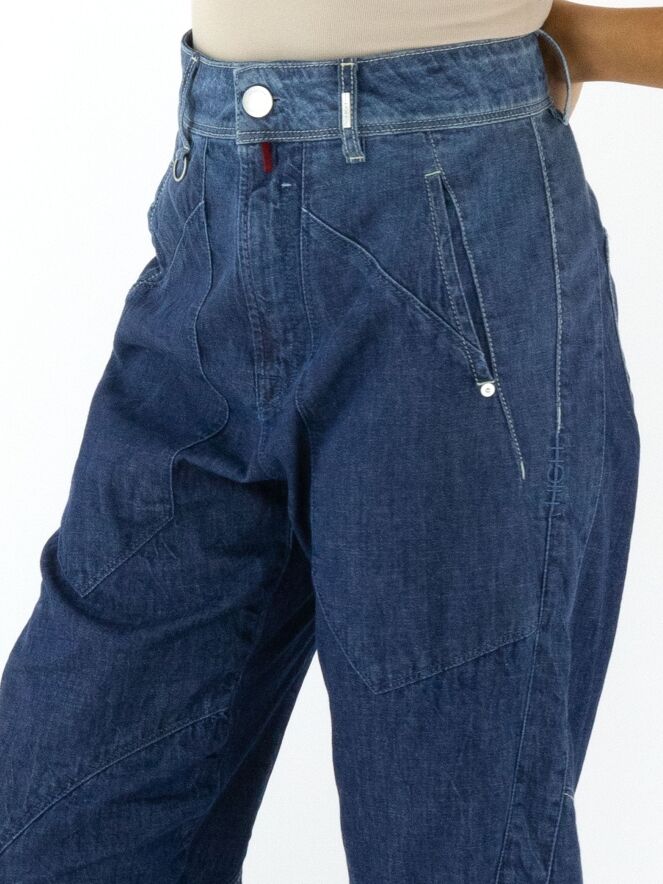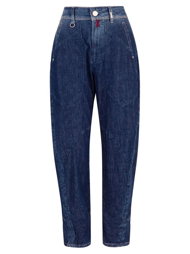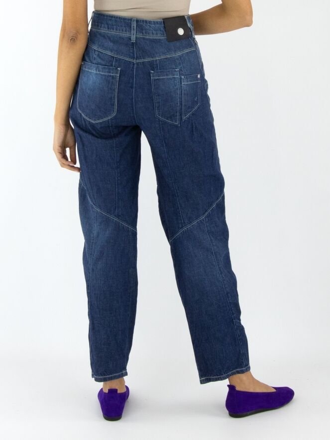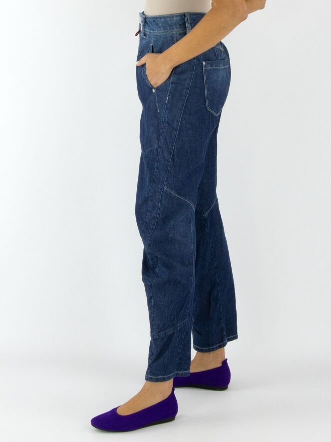 Jeans von High in einer weichen Qualität in einer dunklen Denimfarbe. Die Jeans hat eine Knitteroptik und mehrere diagonale Nähte. Auf der Rückseite ist eine der Taschen auf dekorative Weise zweigeteilt. Die Taschen auf der Vorderseite sind sehr groß. Diese Jeans kann bei 30 Grad gewaschen werden.
