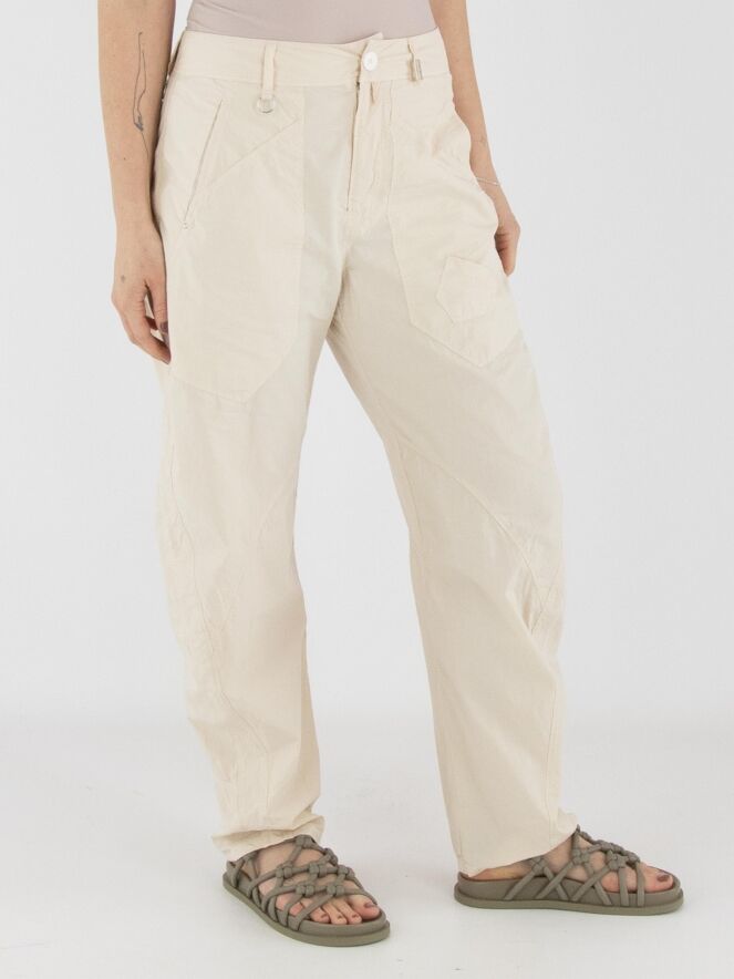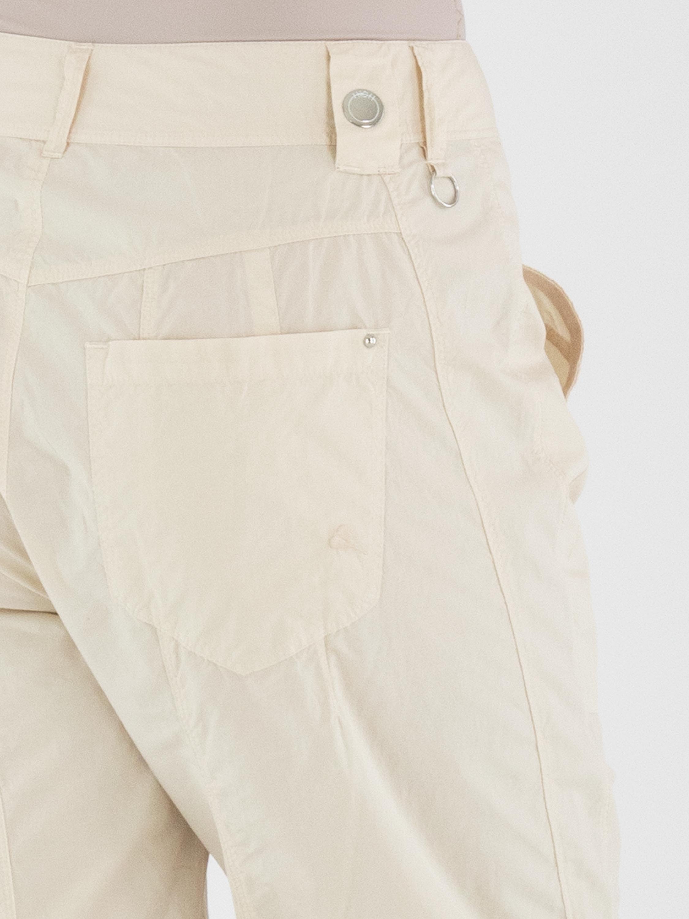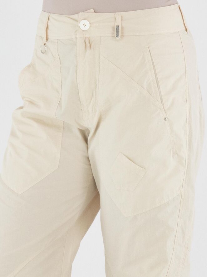 Eine Hose von High aus sommerlicher Baumwollqualität in Beige. Auf der linken Vordertasche befindet sich eine kleine dekorative Tasche mit diagonaler Steppung. Die Hose hat Seitentaschen und kann bei 30 Grad gewaschen werden.