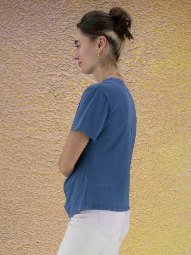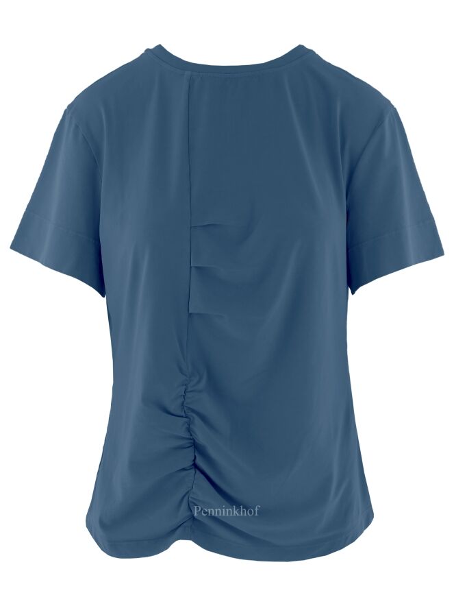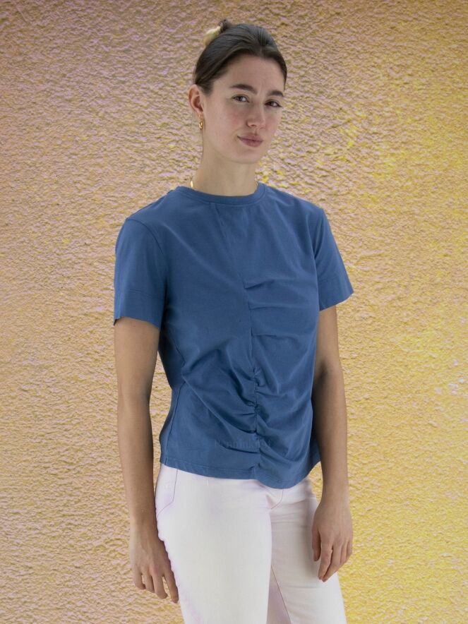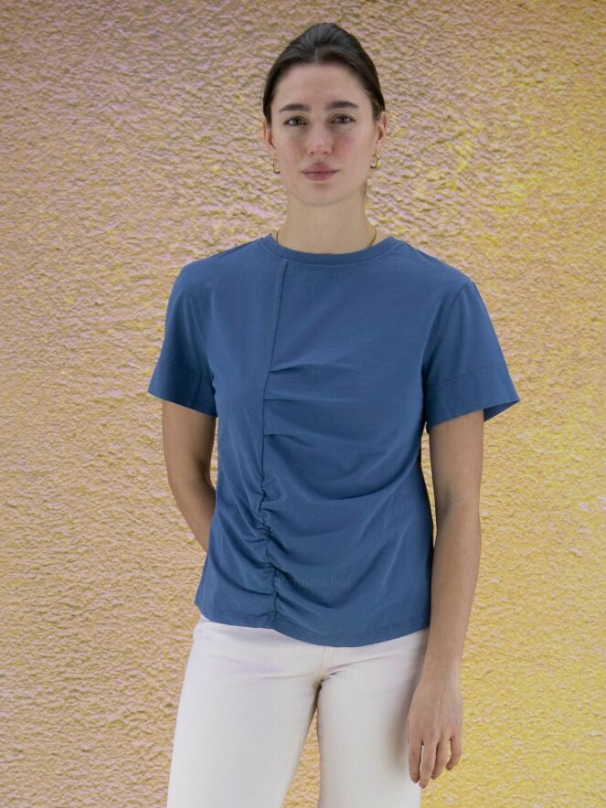 Ein blaues Shirt der Designermarke High. Das Shirt hat kurze Ärmel und einen Rundhalsausschnitt. Auf der Vorderseite des Shirts befindet sich links von der Mitte eine durchgehende Steppnaht mit einigen dekorativen Falten. Dieses Shirt darf von Hand gewaschen werden.