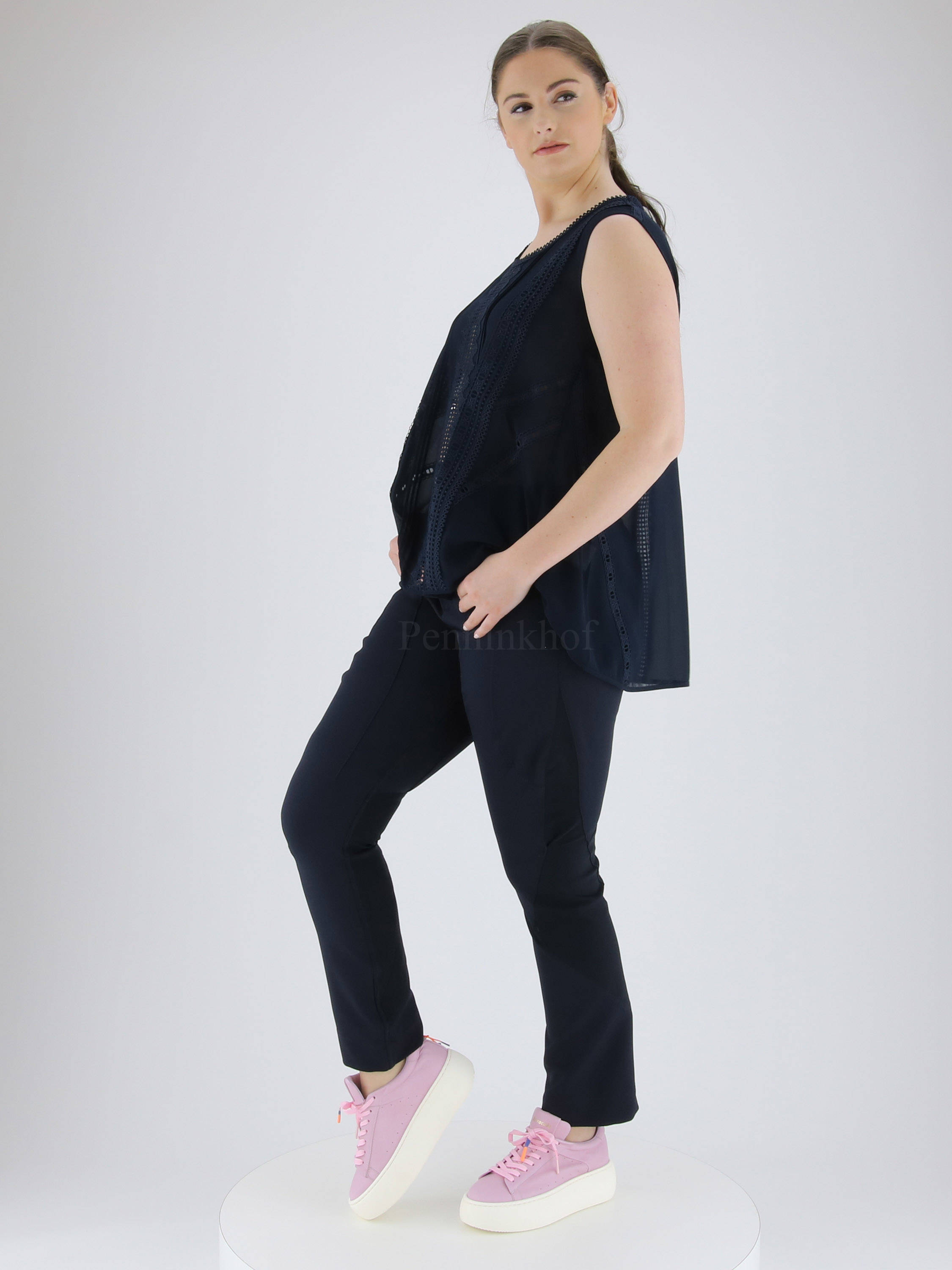 Ein leicht transparentes Top der Designermarke High in Marineblau. An der Vorderseite befinden sich plissierte Bahnen und Streifen aus Spitze in einer vertikalen Linie. Auf der Rückseite befindet sich in der Mitte ein breiter Spitzenbesatz. Die Kante des Rundhalsausschnitts ist aus Ajour. Dieses Top darf von Hand gewaschen werden.