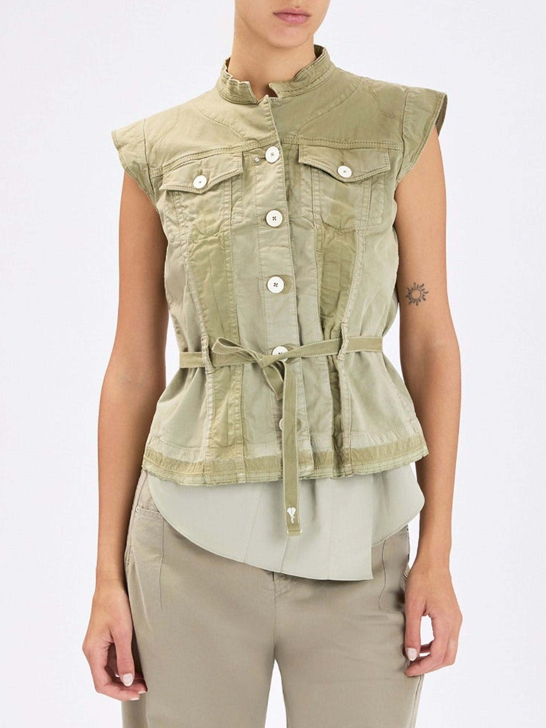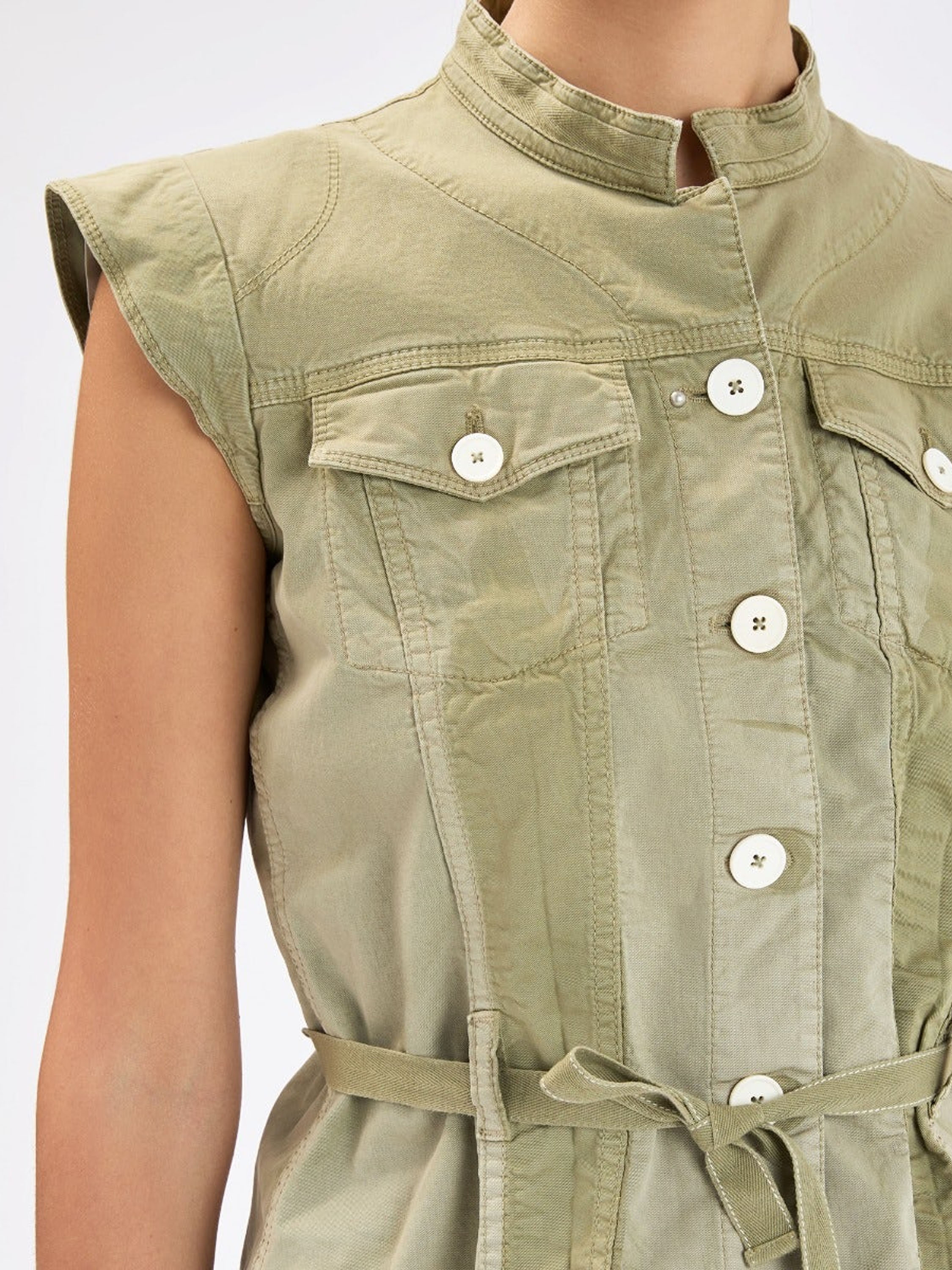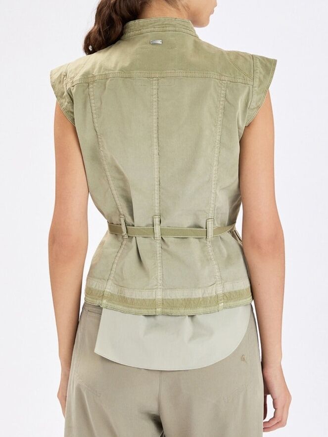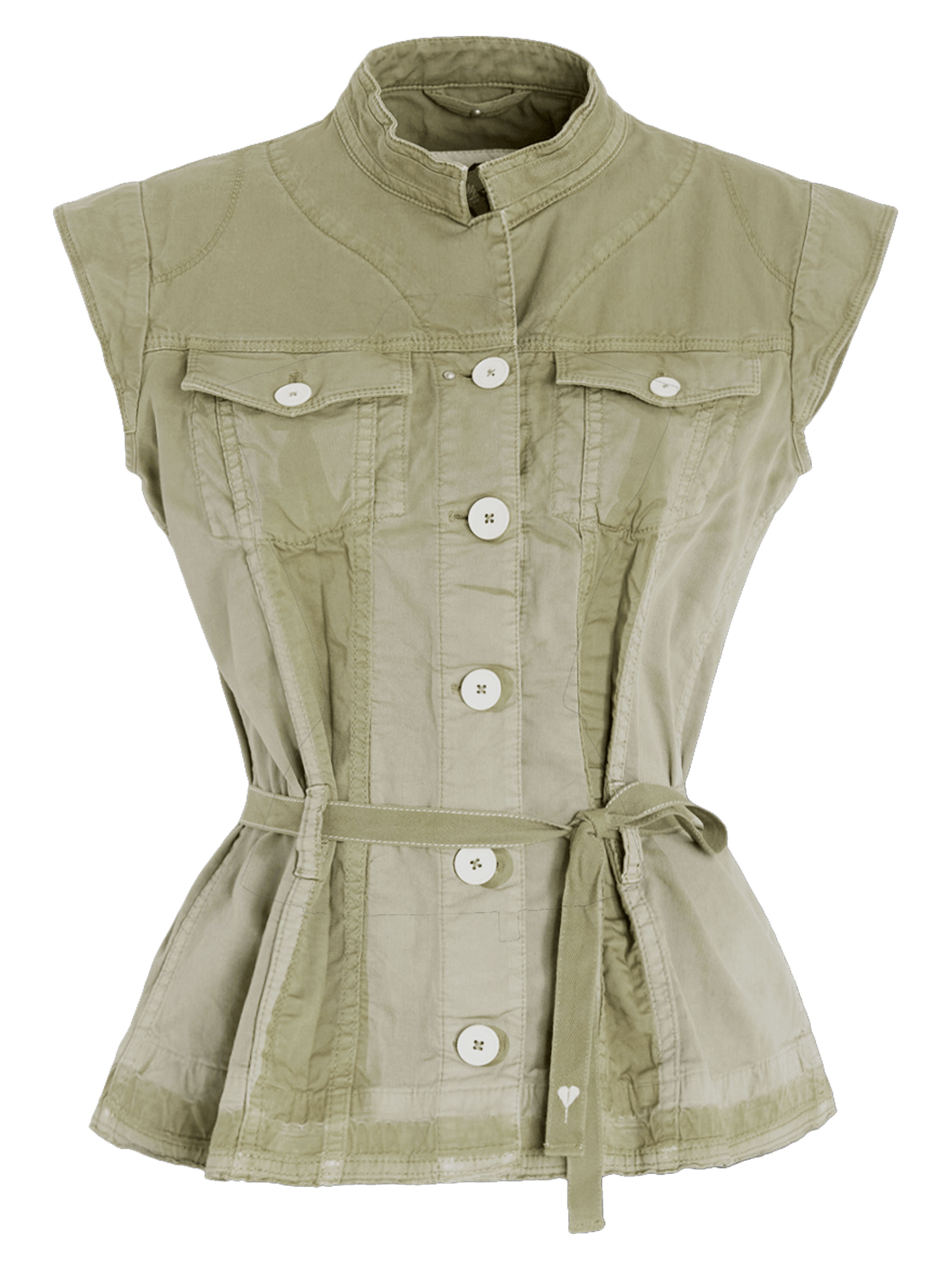 Eine Weste von High in mehreren sanften Olivtönen. In der Taille ist ein schmales Band als Gürtel eingearbeitet, mit dem die Silhouette dezent betont werden kann. Die Weste wird mit elfenbeinfarbenen Knöpfen geschlossen. Sowohl vorne als auch hinten sorgen mehrere Taillennähte für eine schön geformte und feminine Passform. Dieses Modell kann bei 30 Grad gewaschen werden.