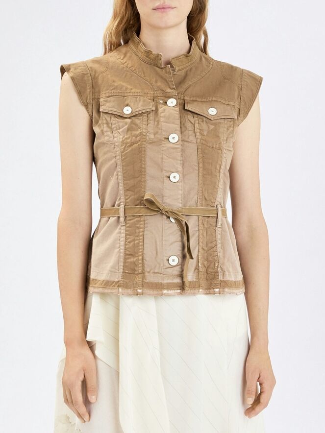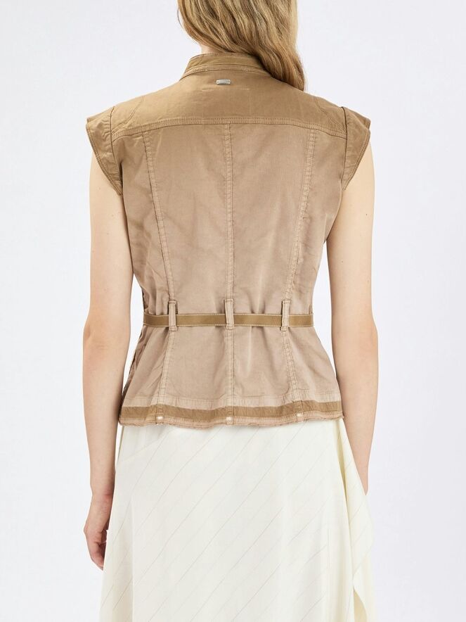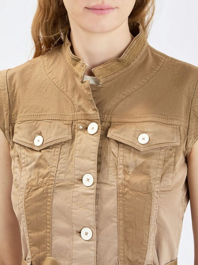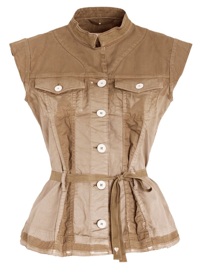 Gilet von High in mehreren weichen Brauntönen. In der Taille ist ein schmaler Bindegürtel in Form eines Bandes verarbeitet, mit dem die Silhouette dezent betont werden kann. Das Modell wird mit elfenbeinfarbenen Knöpfen geschlossen. Sowohl vorne als auch hinten sorgen mehrere Taillennähte für eine feminine, schön geformte Passform. Dieses Gilet kann bei 30 Grad gewaschen werden.