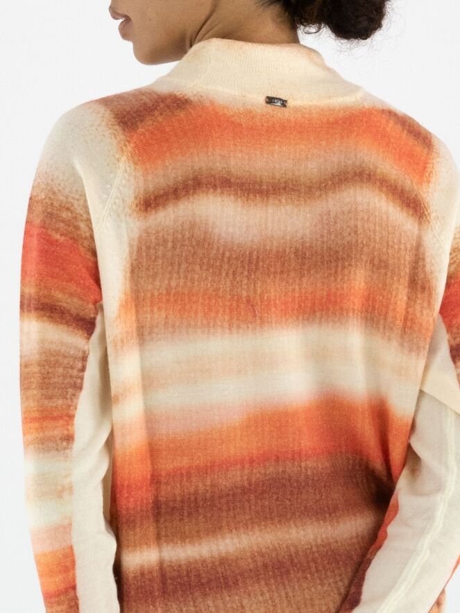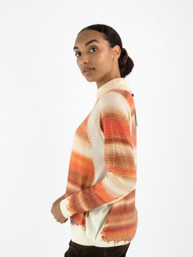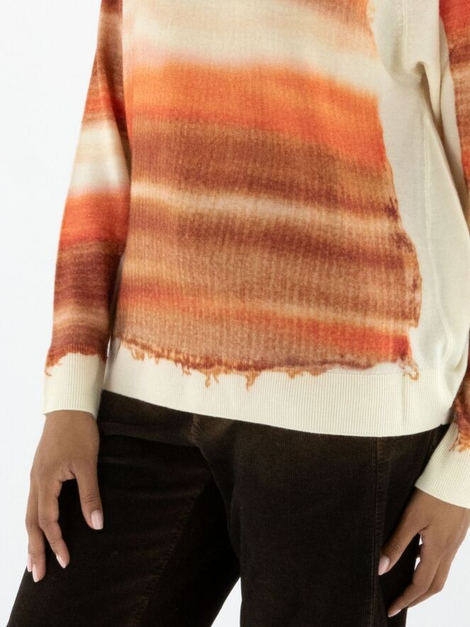 Pullover von High mit einem bedruckten Dégradé in verschiedenen Rottönen und Cremeweiß. Der Halsausschnitt ist mit einem fein gerippten Tricot-Turtleneck versehen. Auch die Ärmelabschlüsse und der Saum sind mit fein geripptem Tricot eingefasst. Dieser Pullover darf nicht gewaschen werden.