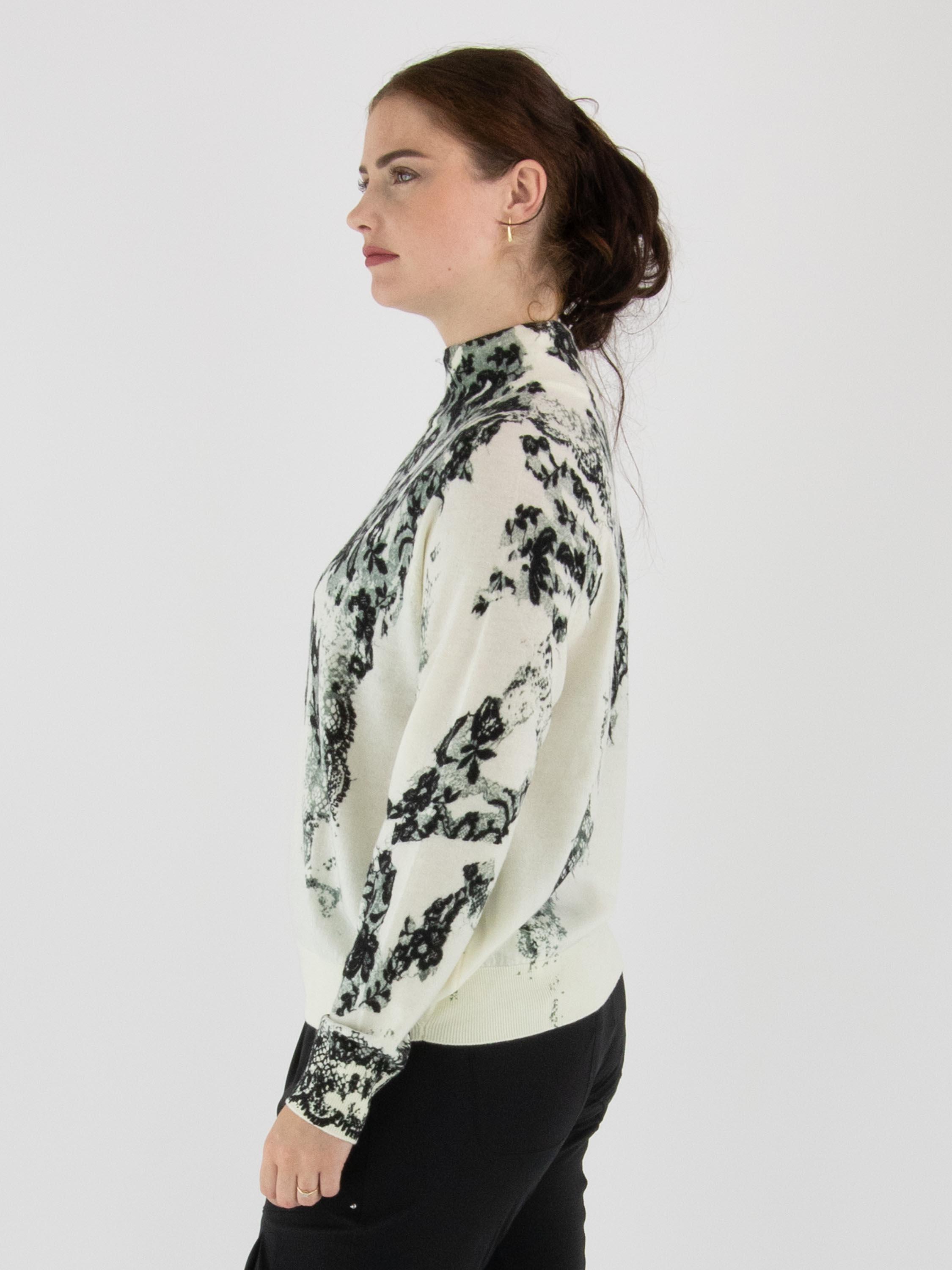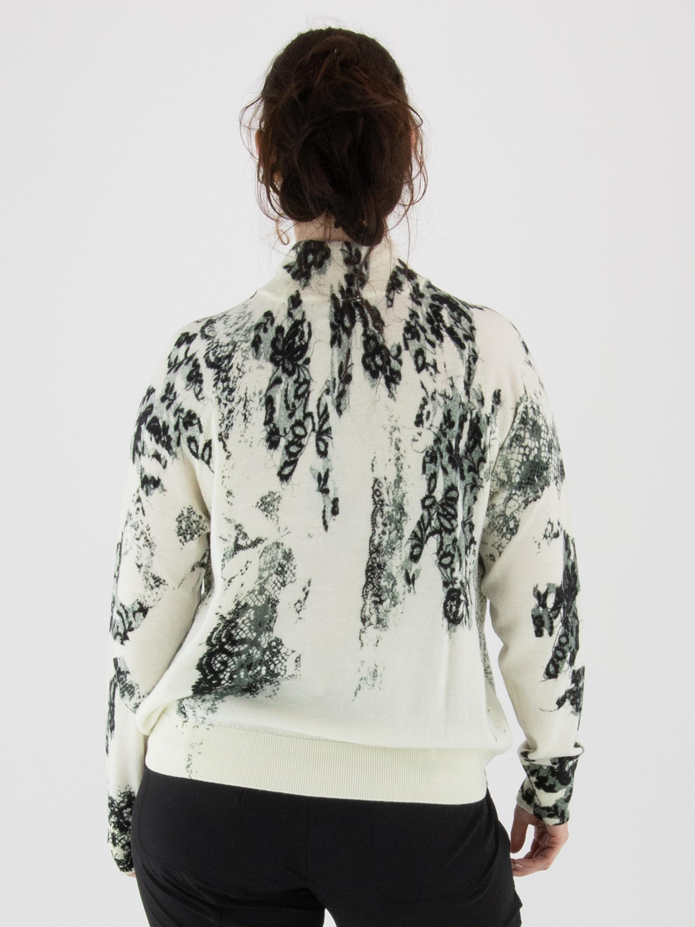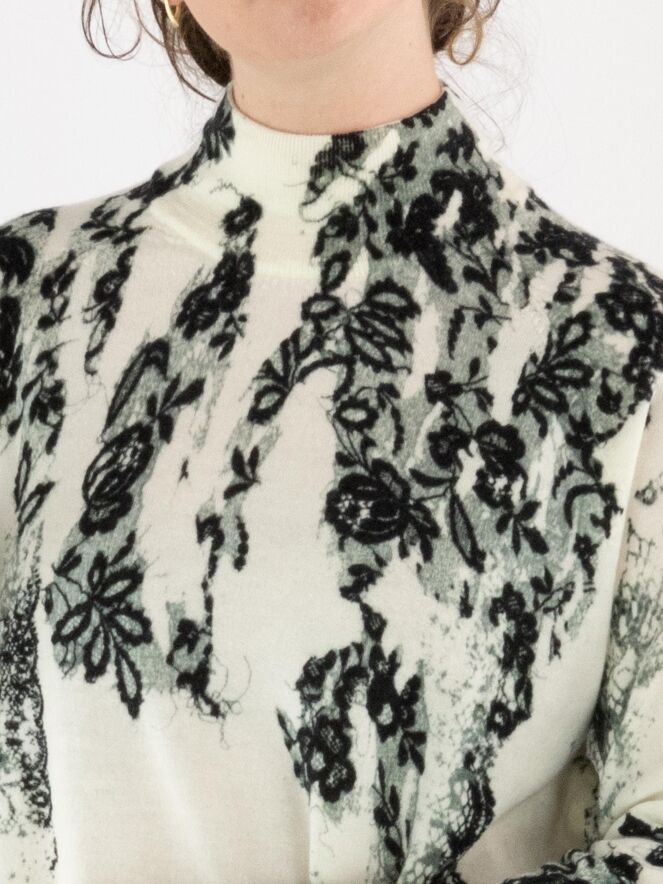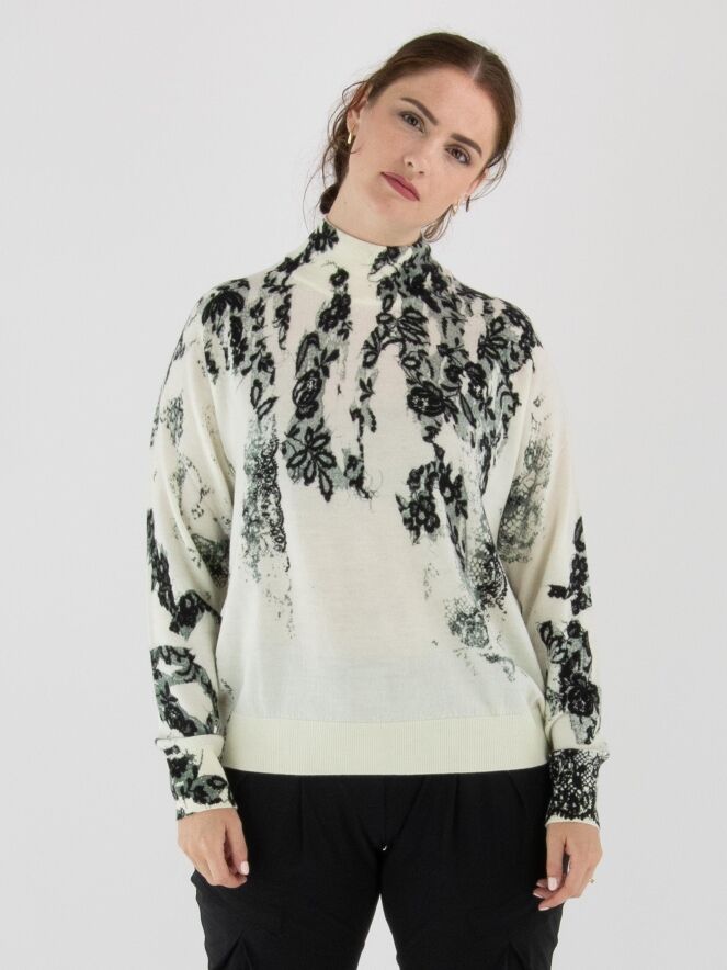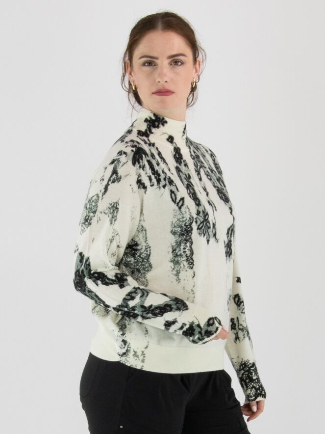 Pullover von High mit grafischem Print in verschiedenen Schwarz- und Grautönen auf cremeweißem Hintergrund. Der Pullover hat einen Rollkragen. Der Kragen, die Ärmelabschlüsse und der Saum sind mit einem fein gerippten Strickbündchen versehen. Dieser Pullover darf nicht gewaschen werden.