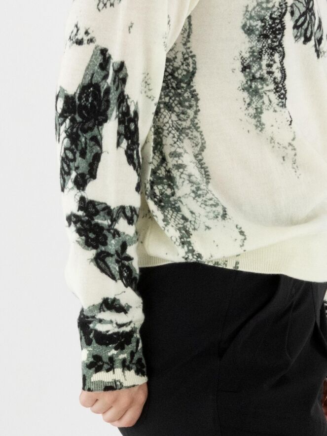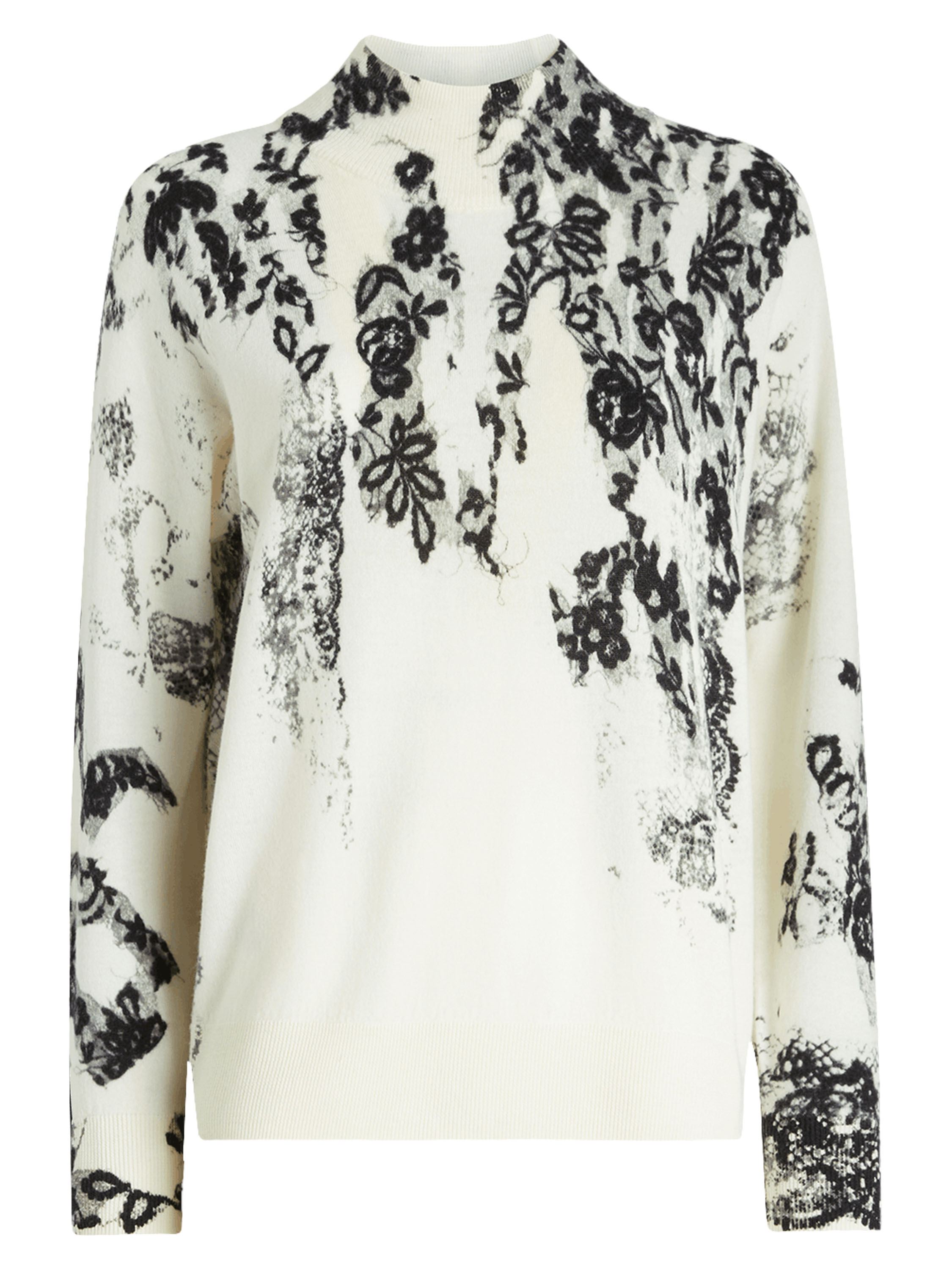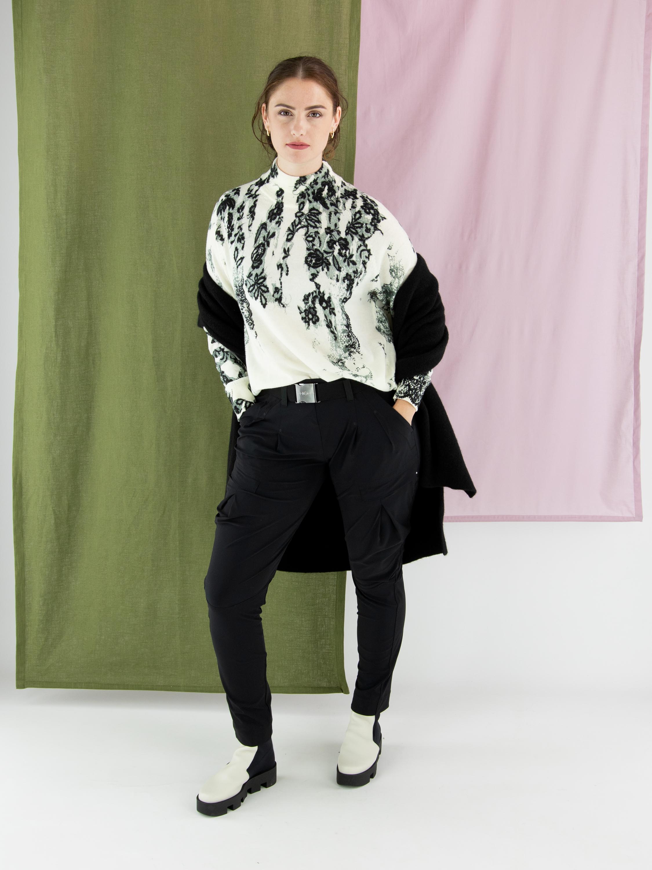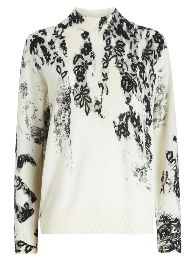 Pullover von High mit grafischem Print in verschiedenen Schwarz- und Grautönen auf cremeweißem Hintergrund. Der Pullover hat einen Rollkragen. Der Kragen, die Ärmelabschlüsse und der Saum sind mit einem fein gerippten Strickbündchen versehen. Dieser Pullover darf nicht gewaschen werden.