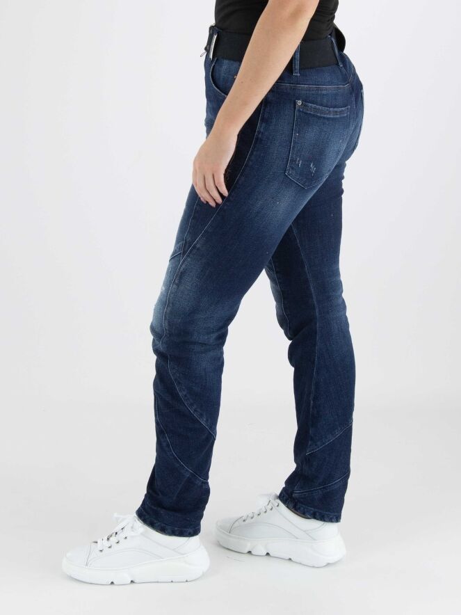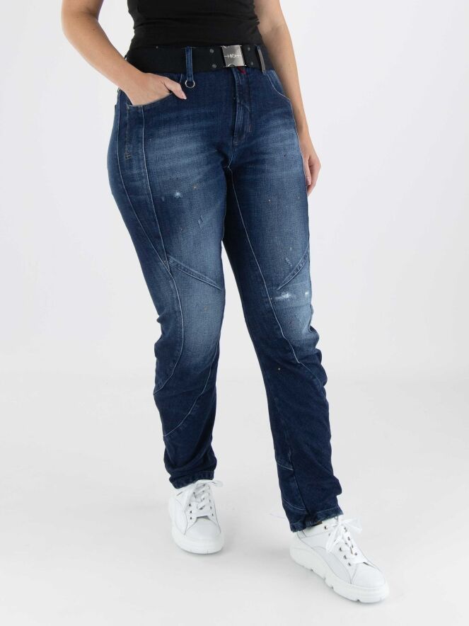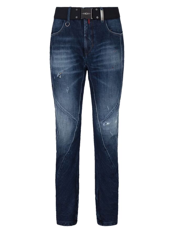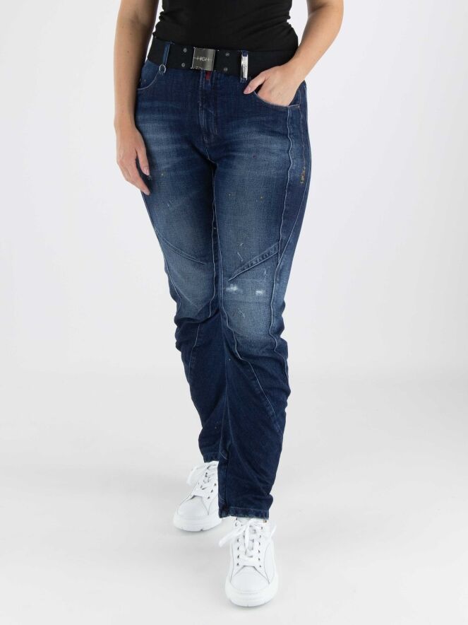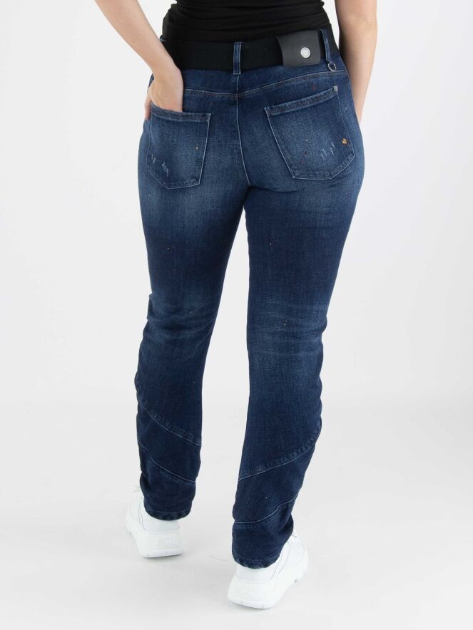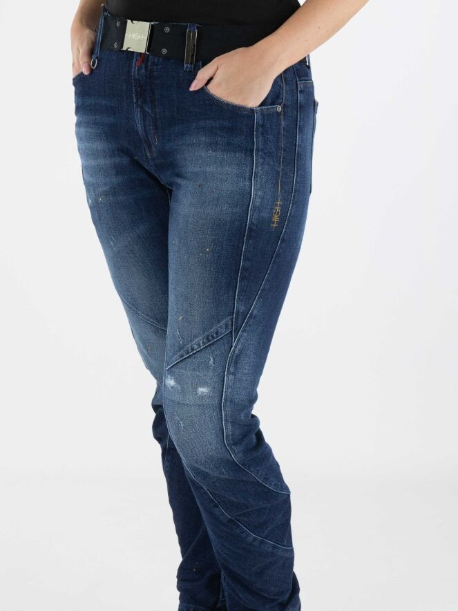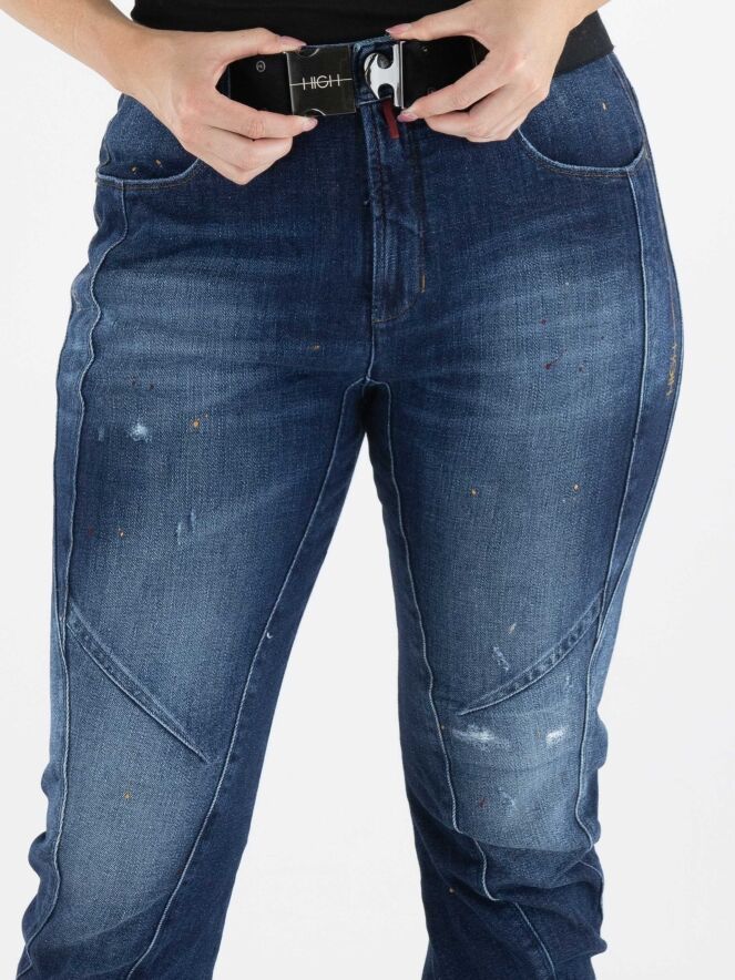 Eine gewaschene Jeans von High in einer grundlegenden Jeansfarbe. Die Jeans hat dekorative orange und rote Farbspritzer und ist an den Oberschenkeln und an den Knien abgenutzt. Am unteren Rand ist ein breiter Umschlag. Im Taillenbereich befindet sich ein elastischer Gürtel mit einer quadratischen nickelfarbenen Schnalle. Diese Jeans kann bei 30 Grad gewaschen werden.