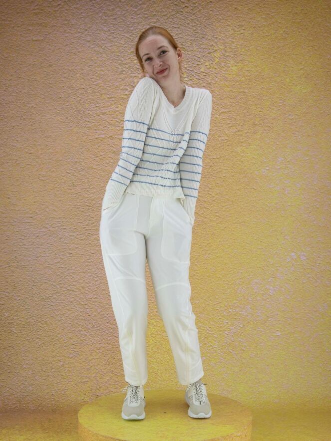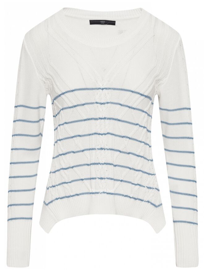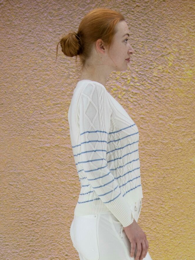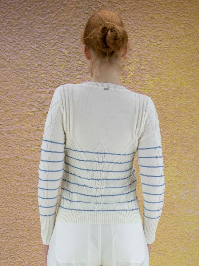 Ein Pullover der Designermarke High in Cremeweiß mit hellblauen Querstreifen. Der Pullover hat ein Zopfmuster. Entlang des Rundhalsausschnitts verläuft ein Strickbündchen. Dieser Pullover darf nicht gewaschen werden.