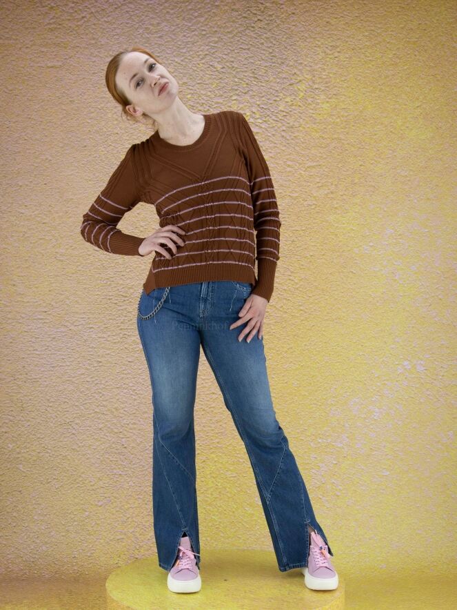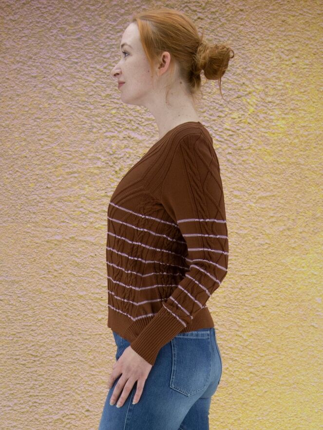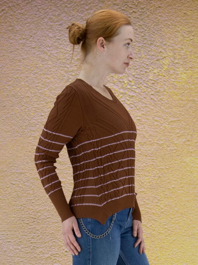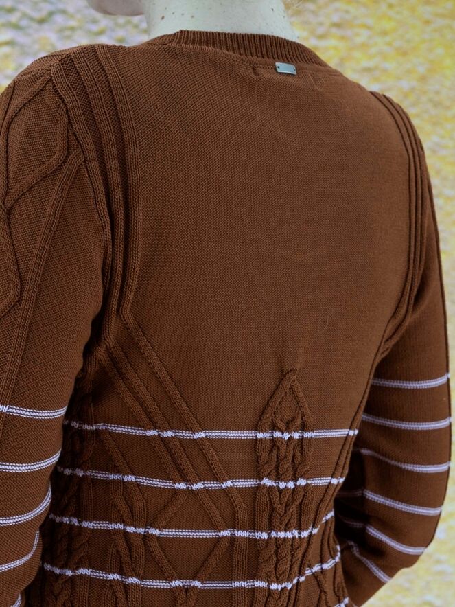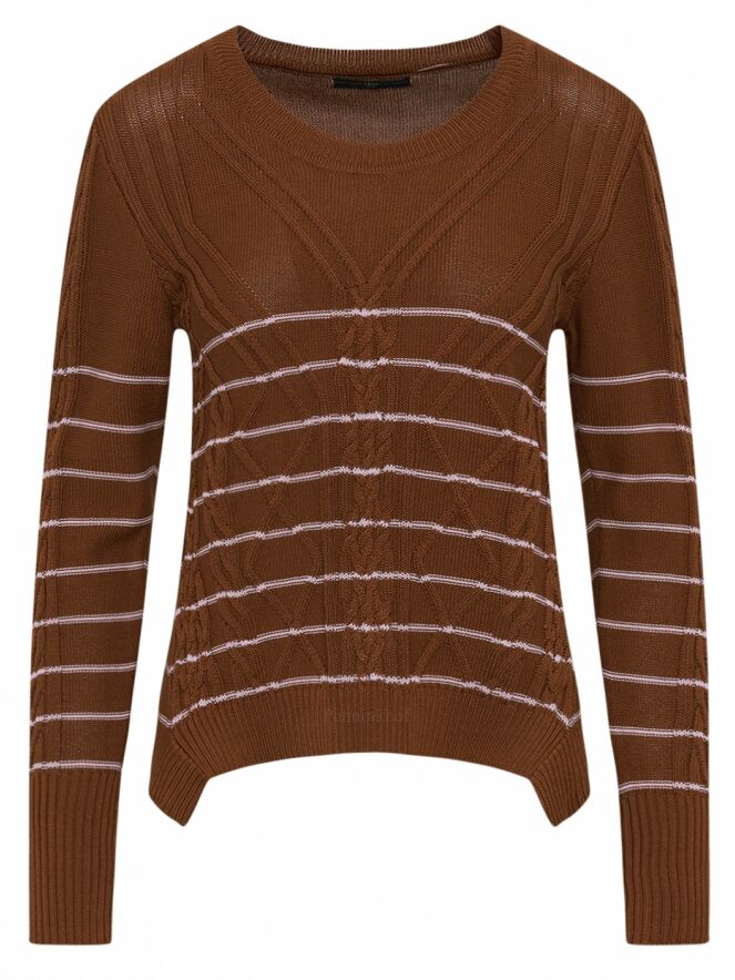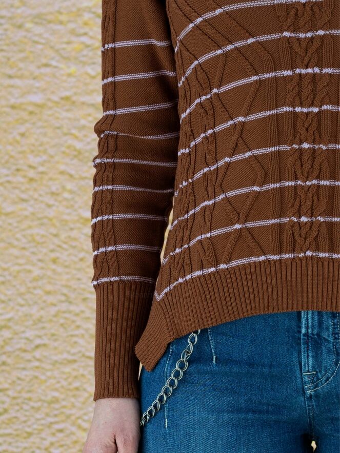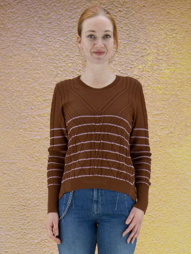 Ein Pullover der Designermarke High mit einem abwechslungsreichen Zopfmuster in Braun und Rosa. Der Pullover hat schmale Streifen in einem zarten Rosa. Die Ärmelabschlüsse und der untere Saum sind mit einem Strickbündchen versehen. Dieser Pullover darf nicht gewaschen werden.