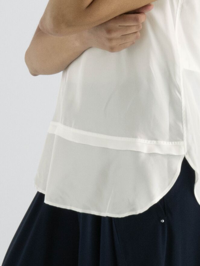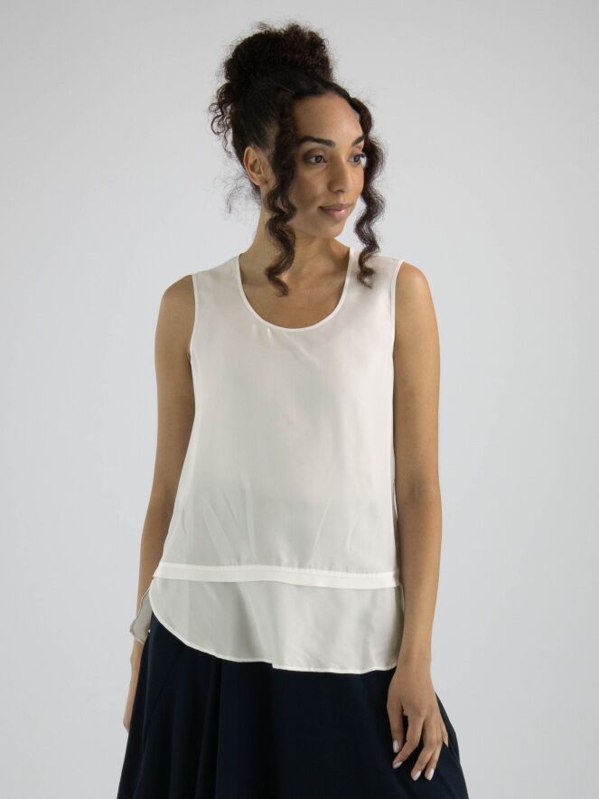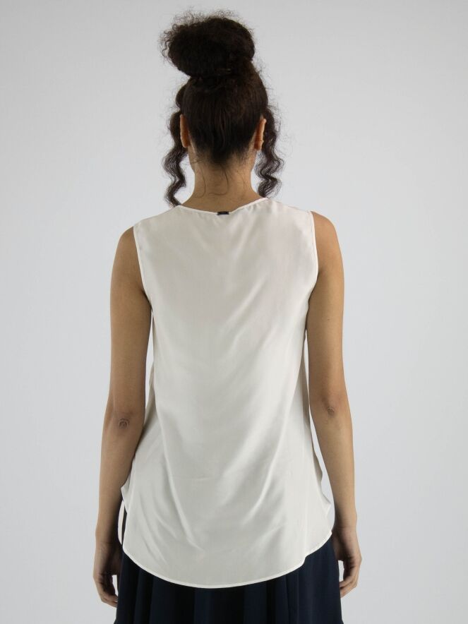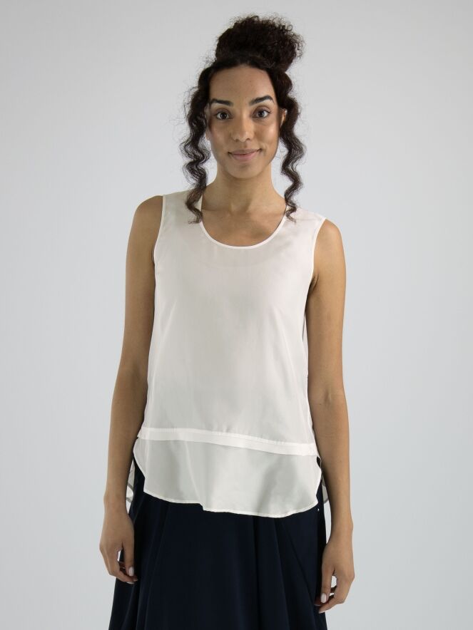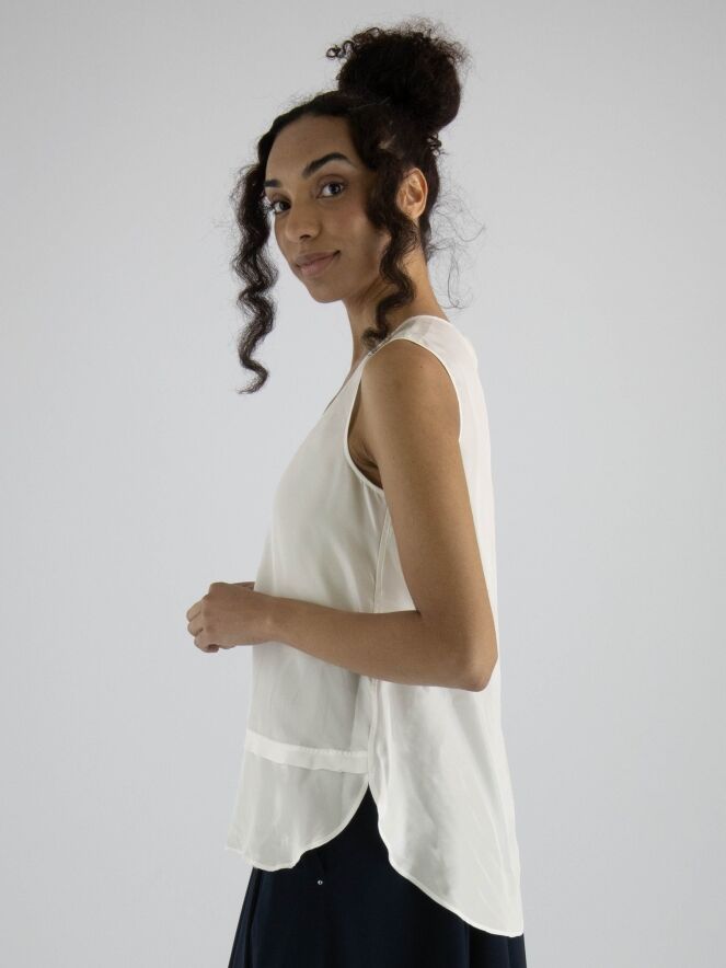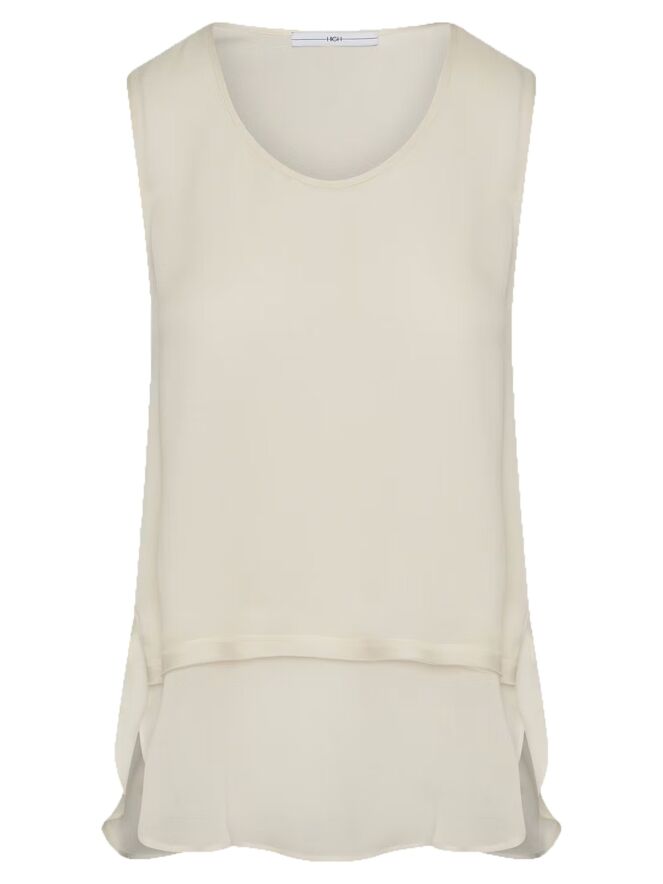 Eine luxuriöse und leicht transparente Matte Satintop von High in Cremeweiß. Das Top hat einen runden Halsausschnitt und ist unten abgerundet. Dieses Top darf nicht gewaschen werden.