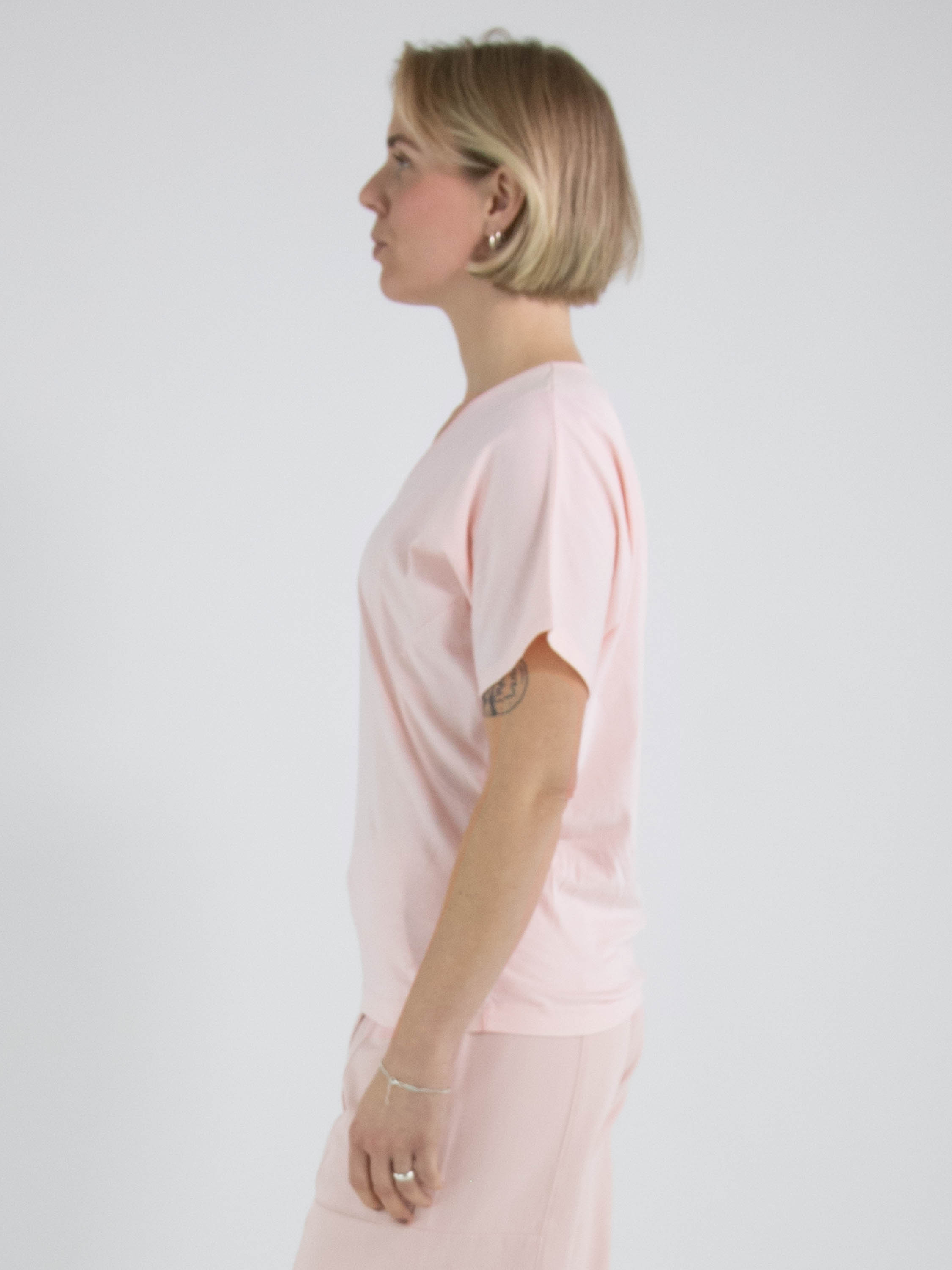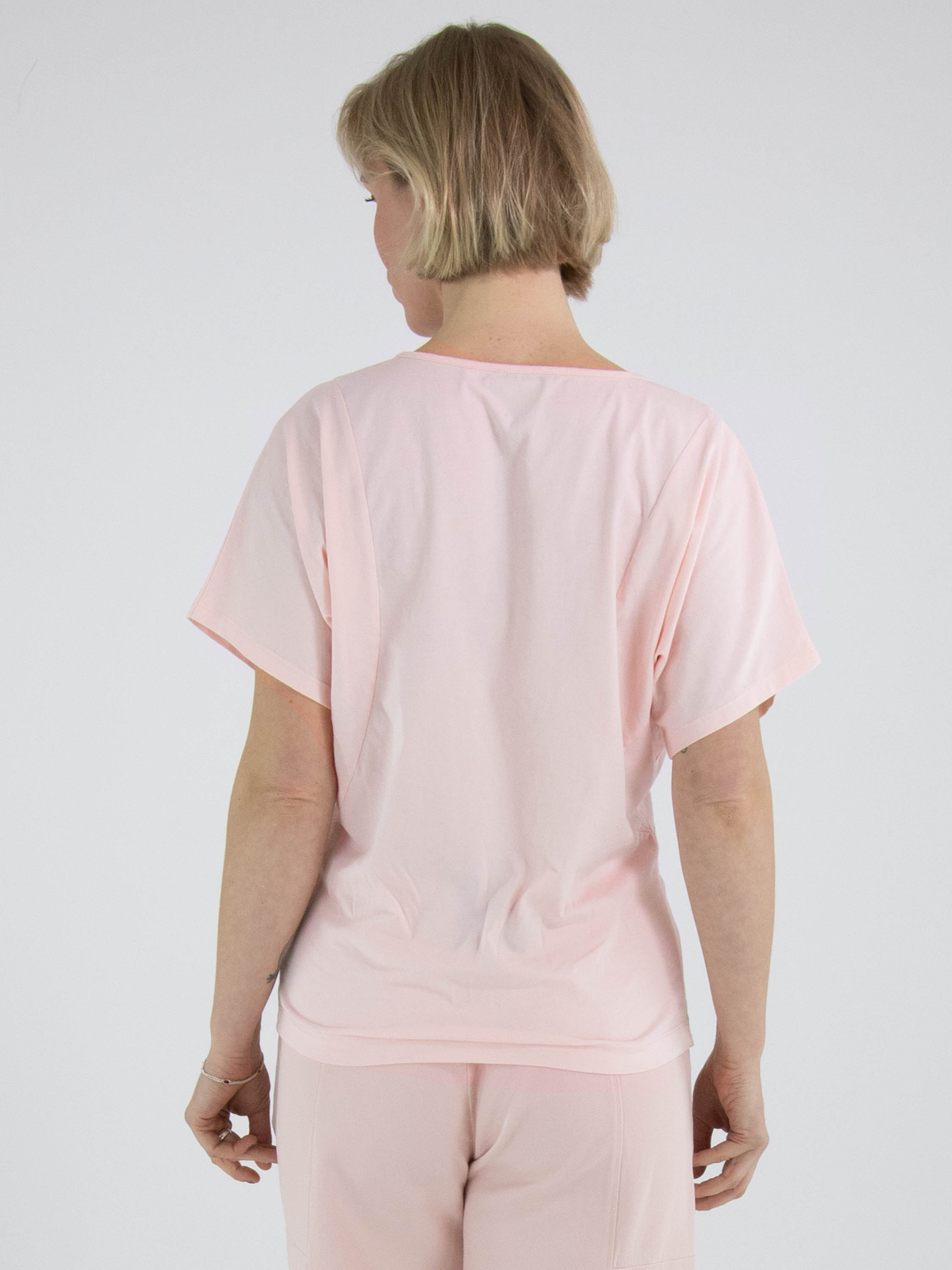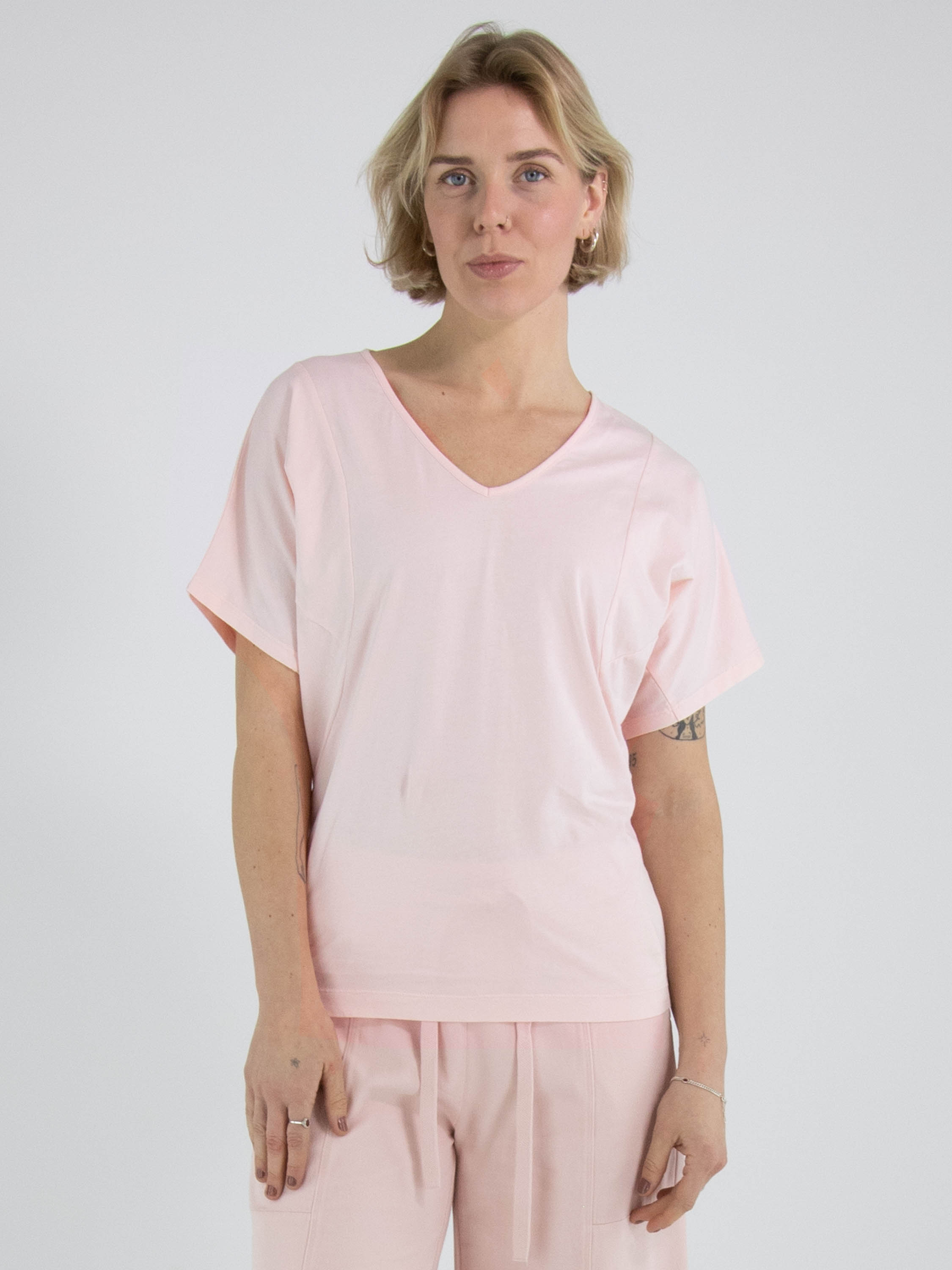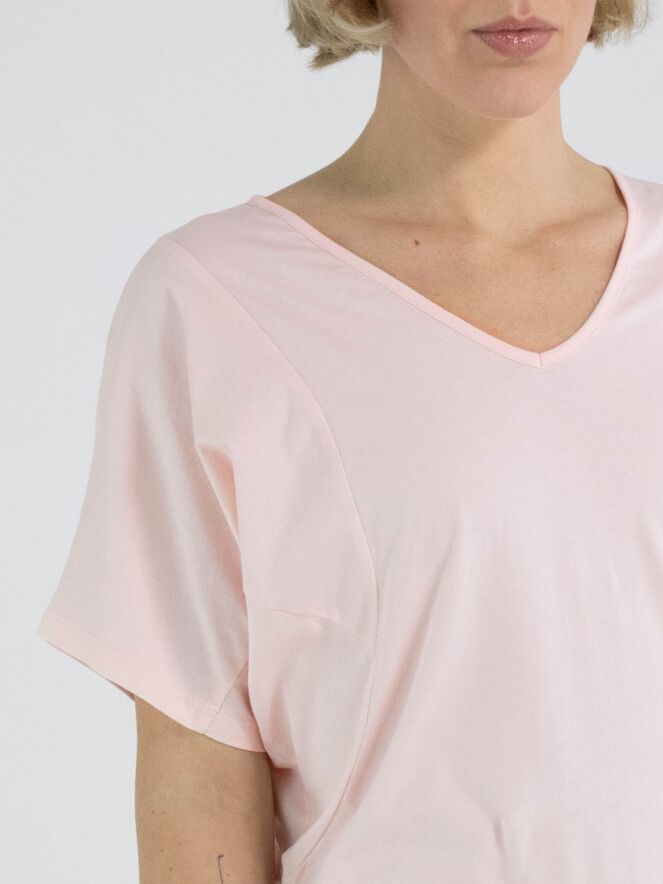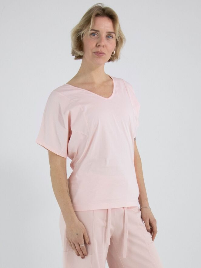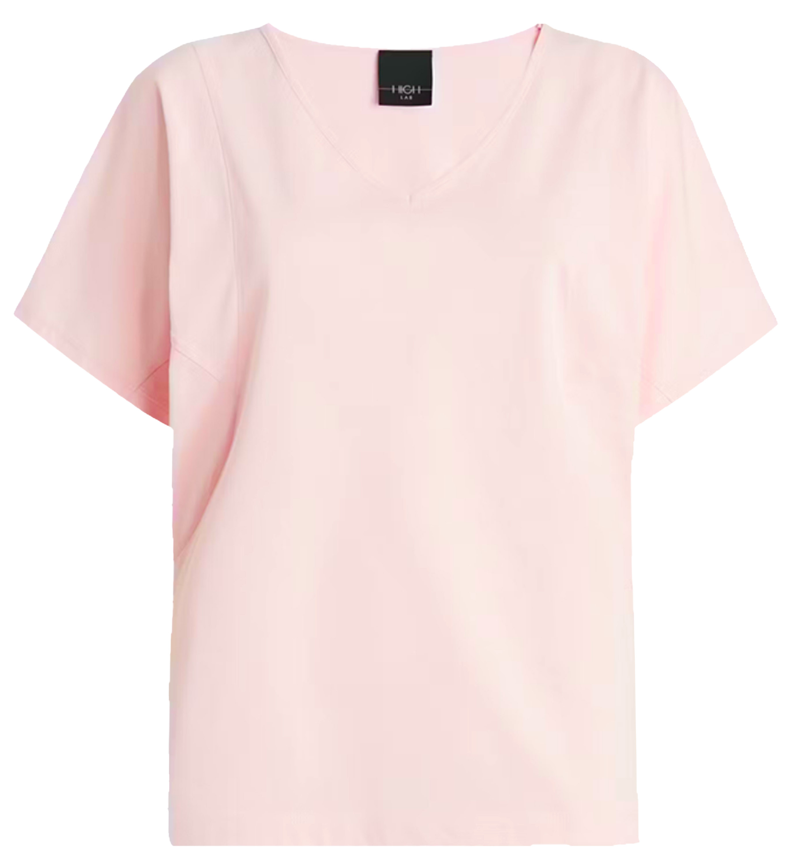 Ein Shirt von High Lab in Pastellrosa. Das Shirt hat kurze Ärmel und einen V-Ausschnitt. Dieses Shirt kann per Hand gewaschen werden.