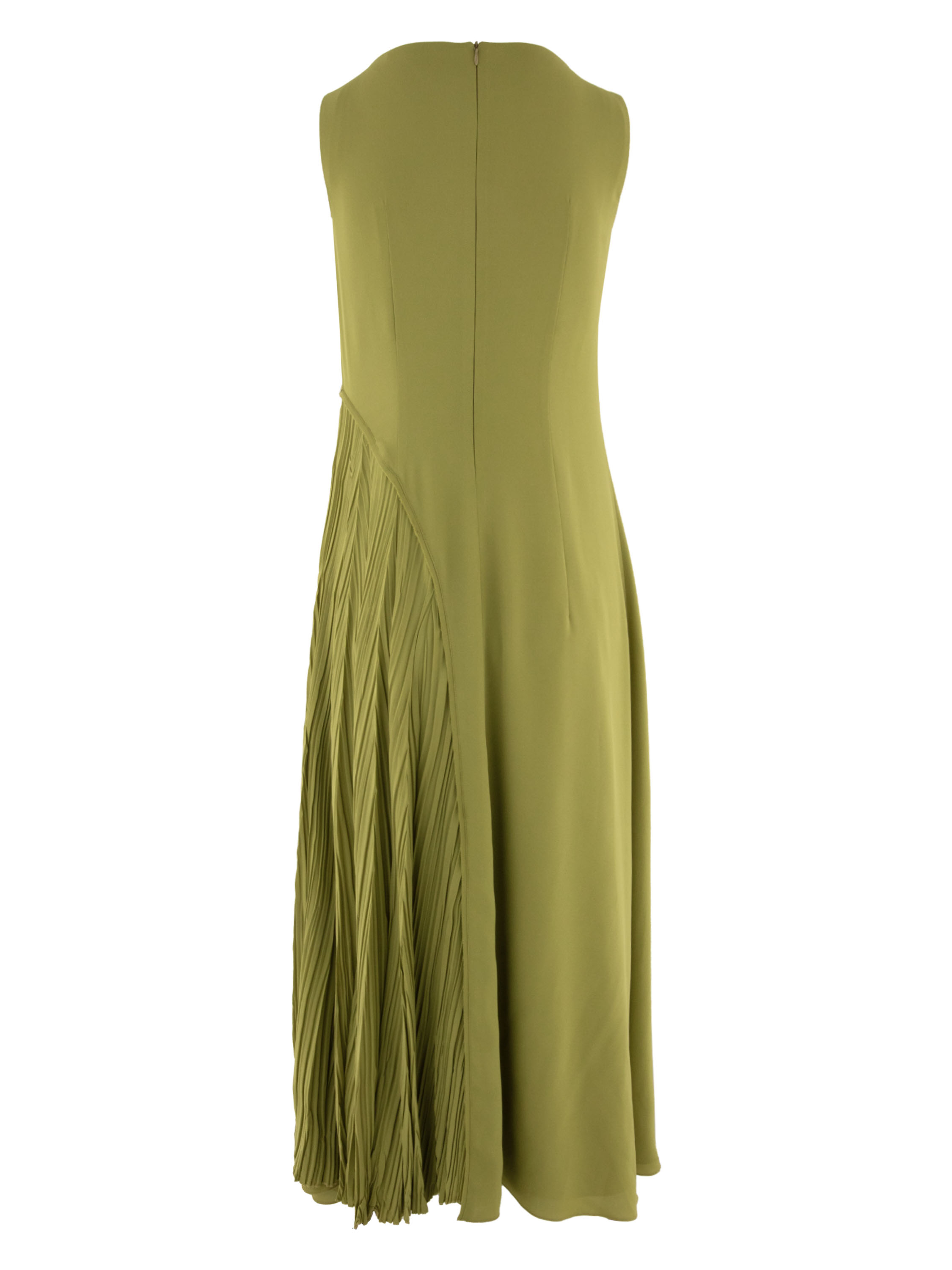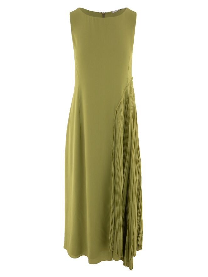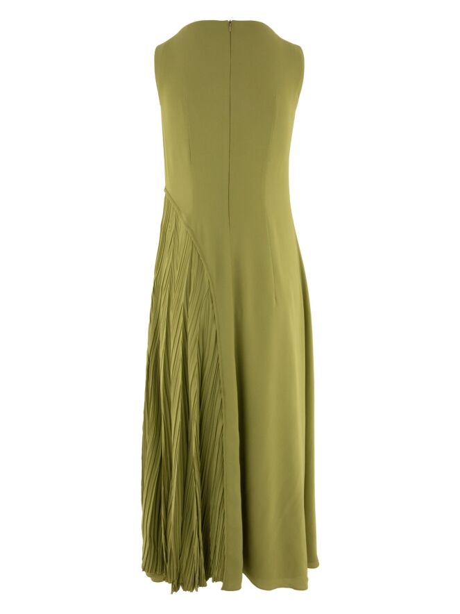 Kleid von High in einem frischen Pistaziengrün. Das Modell besteht aus zwei Stofflagen: Die untere Lage fällt gerade und bildet eine ruhige Basis, während die obere Lage ab der Taille in eine leichte A-Linie übergeht. Auf der linken Seite zeigt die obere Lage ab der Taille eine fein gefältelte Struktur mit einem tiefen Schlitz bis zum Knie, der dem Design Dynamik und Eleganz verleiht. Dieses Kleid sollte per Hand gewaschen werden.