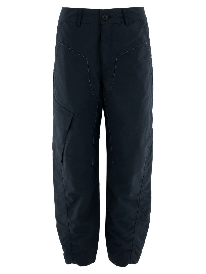 Eine Hose von High in Marineblau. Die Hose hat Eingrifftaschen und auf der rechten Hose befindet sich auf Oberschenkelhöhe eine große diagonale Tasche. Auf der Vorderseite sind mehrere weiße dekorative Nähte gearbeitet. Auf der Rückseite ist ab der Taille, mit einem Schlitz, ein elastischer Stoff bis zur Hüfte eingesetzt. Diese Hose kann bei 30 Grad gewaschen werden.
