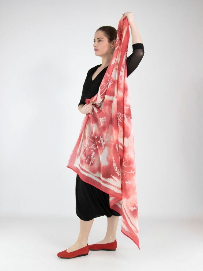 Ein luxuriöser, leicht transparenter Schal von High mit einem batikartigen Blumenprint in mehreren Rottönen. Die Kanten des Schals sind fein ausgefranst. Dieser Schal darf nicht gewaschen werden.