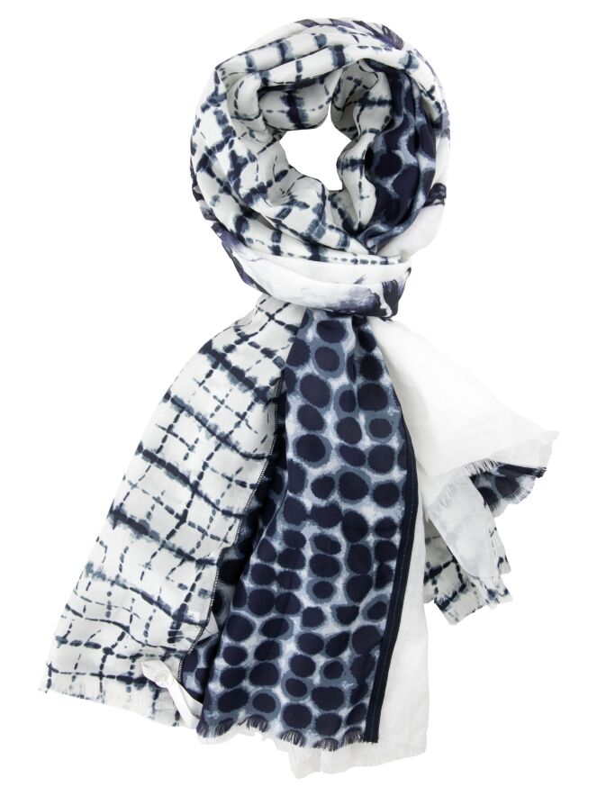Ein luxuriöser, leicht transparenter Schal von High mit einem Doppelprint. Der mittlere Bereich ist mit einem grafischen Aquarell-Blumenprint gestaltet, während beide Enden einen Blockprint mit Kreismotiven zeigen. Der Schal ist in mehreren Blautönen mit Cremeweiß gehalten. Dieser Schal darf nicht gewaschen werden.