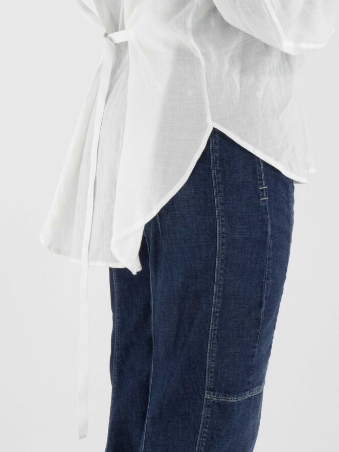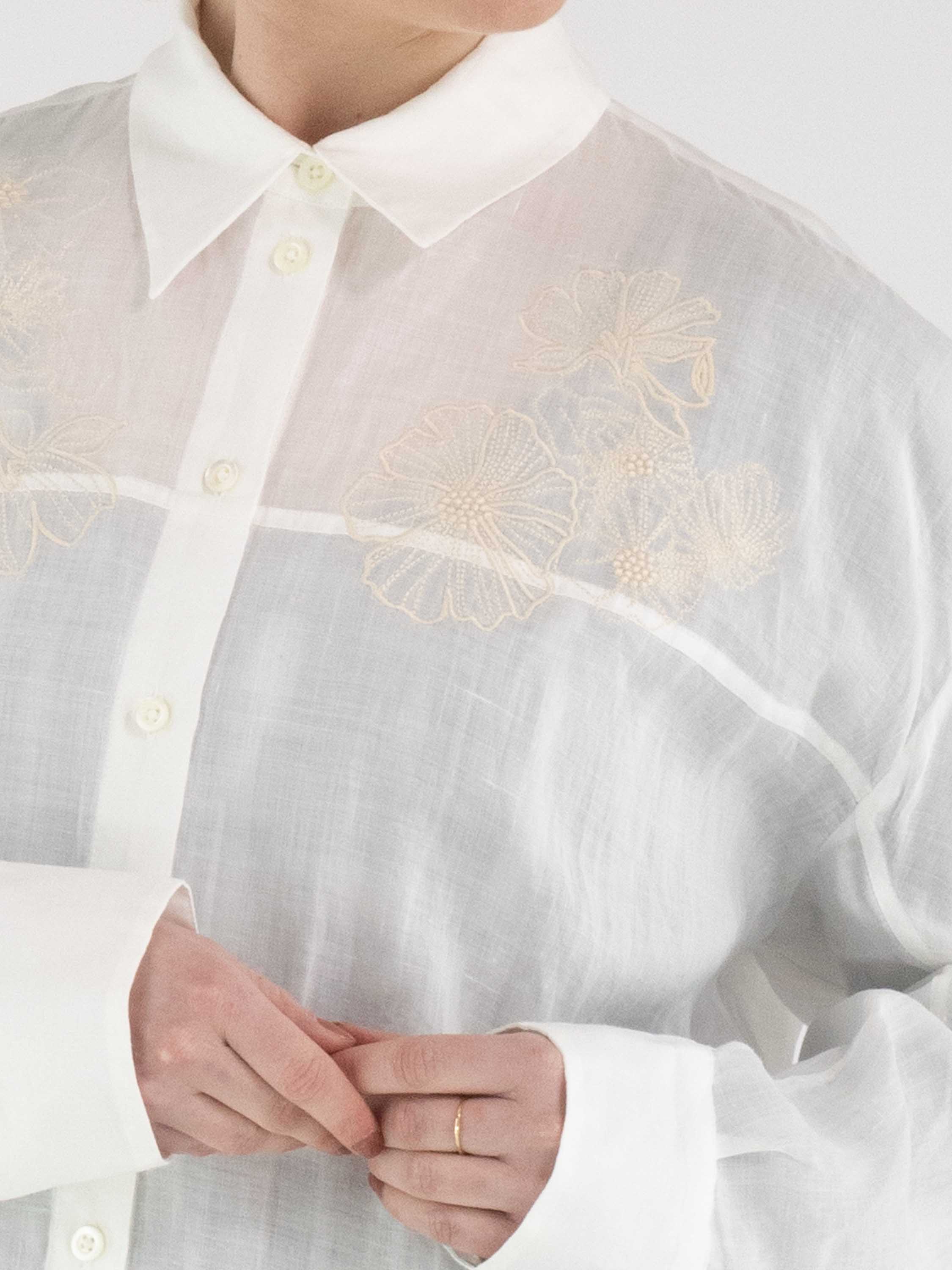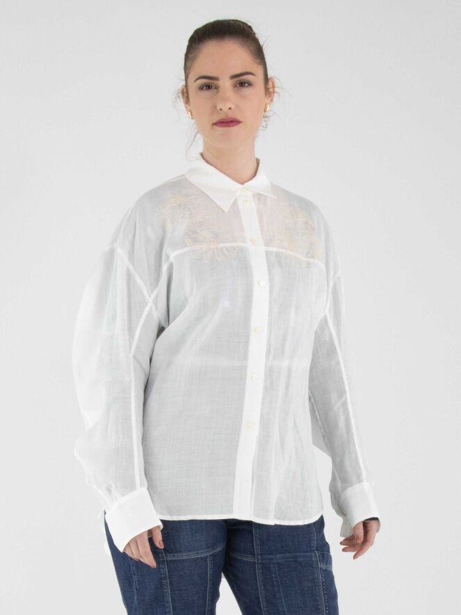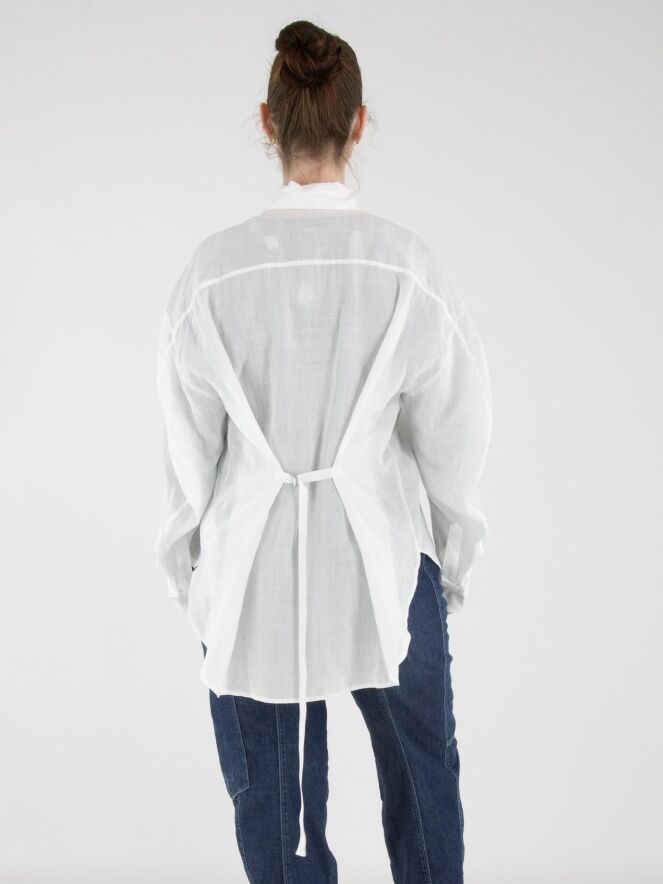 Eine weit geschnittene Bluse von High in Weiß. Oberhalb der Brust, knapp unter den Schultern, befindet sich eine florale Stickerei in Sandfarbe. Auf Taillenhöhe ist ein schmaler Gürtel aus dem gleichen Stoff wie die Bluse angebracht, der hinten fest fixiert ist und auf der Rückseite eine taillierte Silhouette ermöglicht. Diese Bluse kann von Hand gewaschen werden.